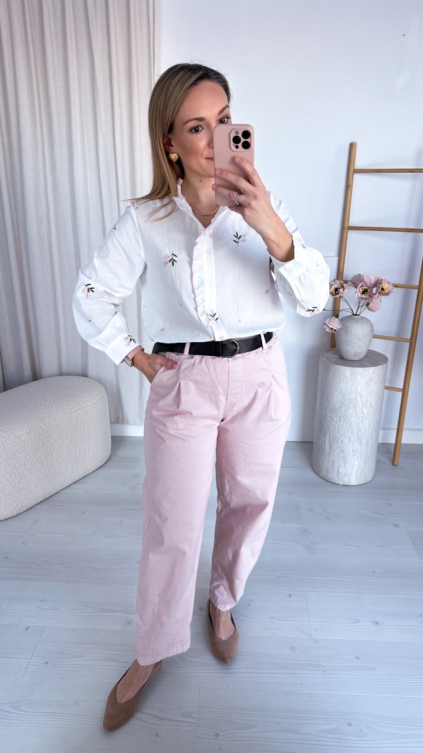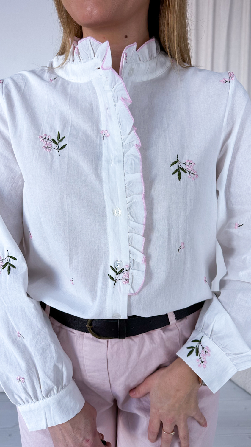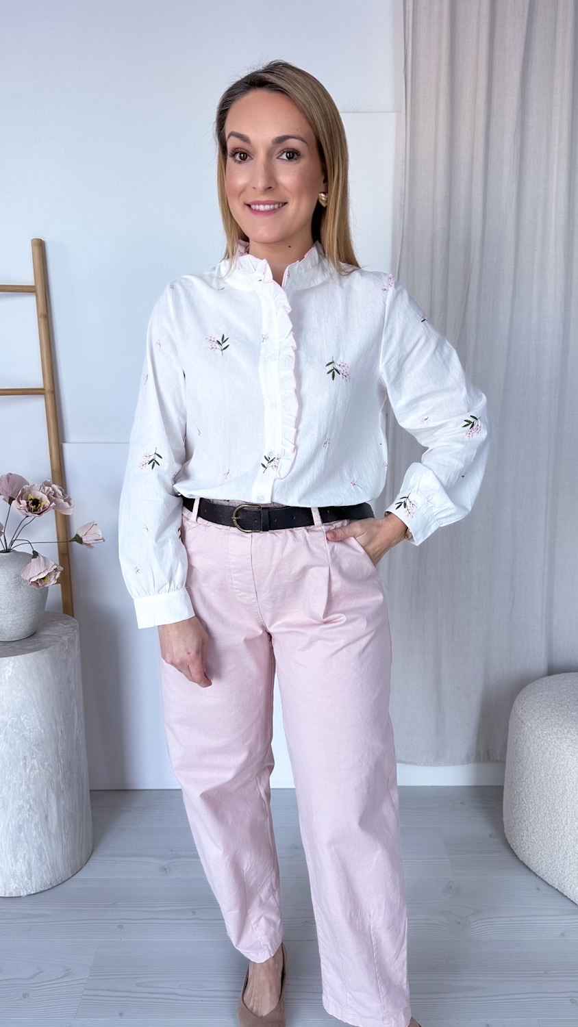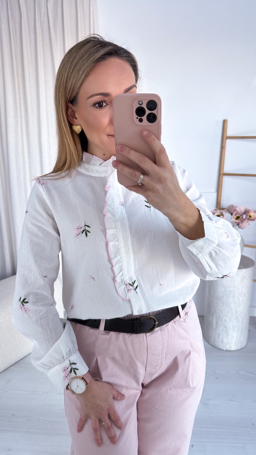Delikatna koszula z haftowanymi kwiatuszkami, która zachwyca subtelnym, kobiecym charakterem. Model ze stójkąnadaje całości elegancji i nowoczesnej formy, pięknie podkreślając linię szyi.