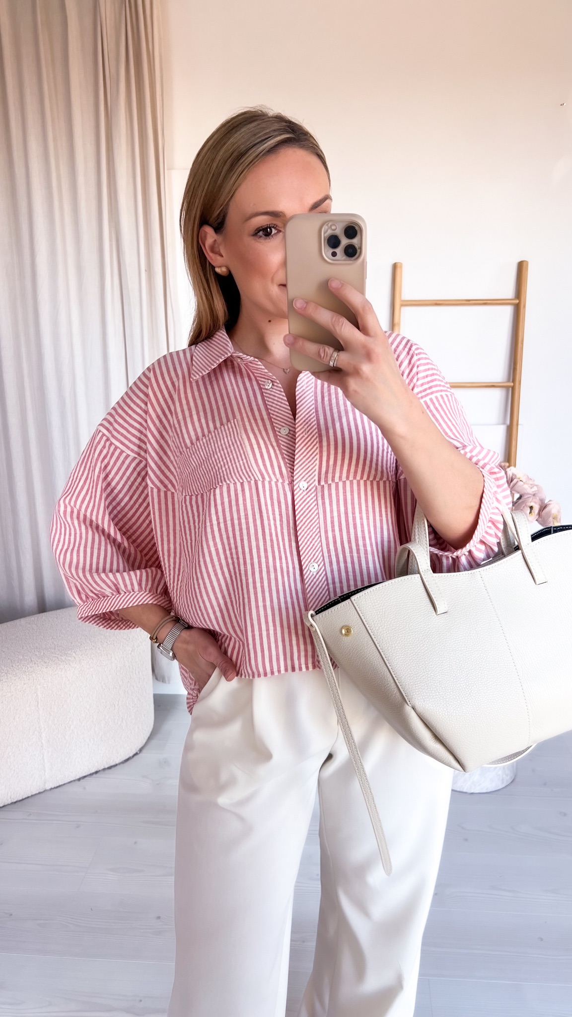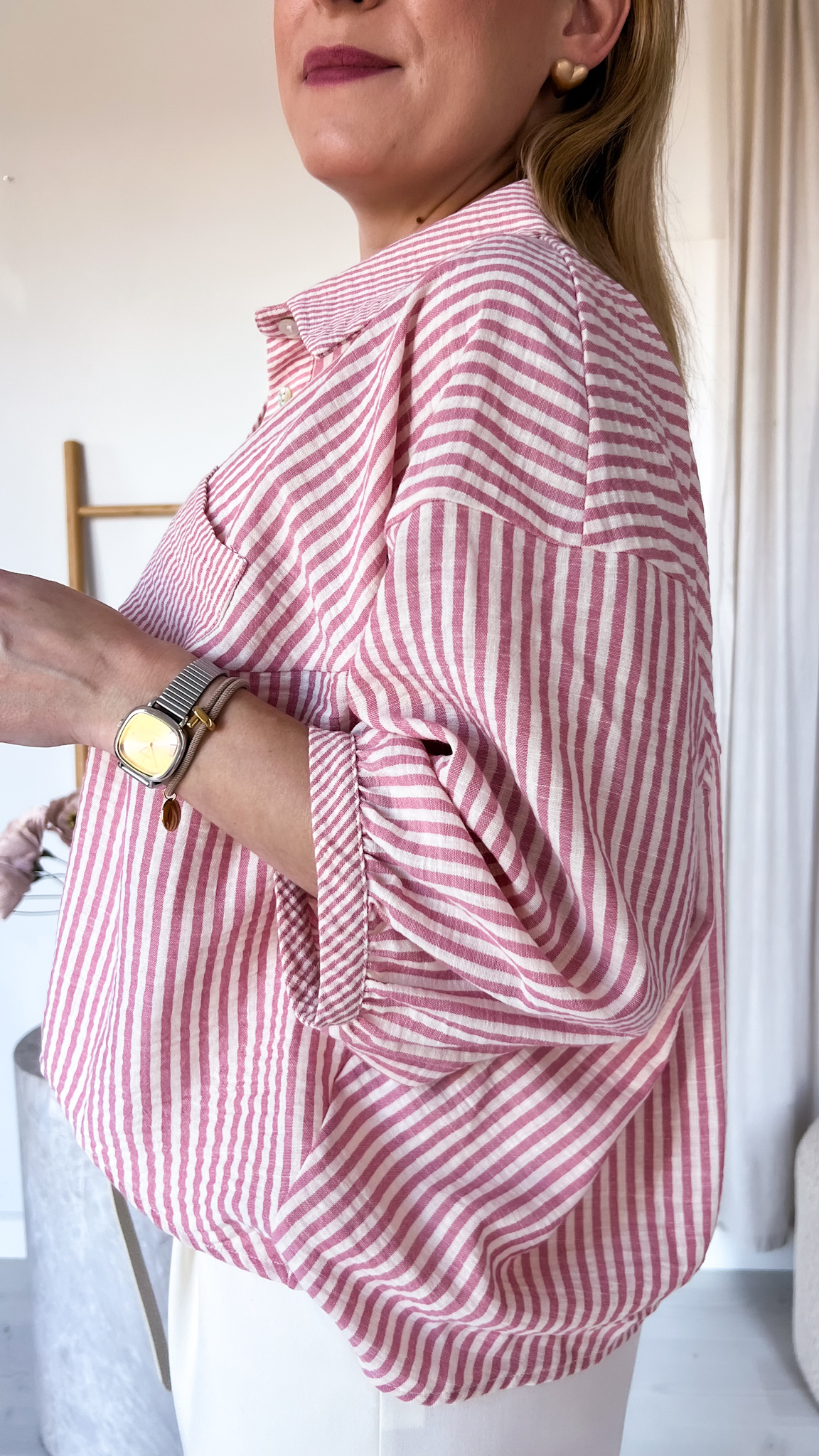 Luźna koszula w paski, która łączy wygodę z ponadczasowym stylem. Wykonana z lekkiego, przewiewnego materiału, doskonale sprawdzi się w sezonie wiosna–lato, zapewniając komfort nawet w cieplejsze dni.