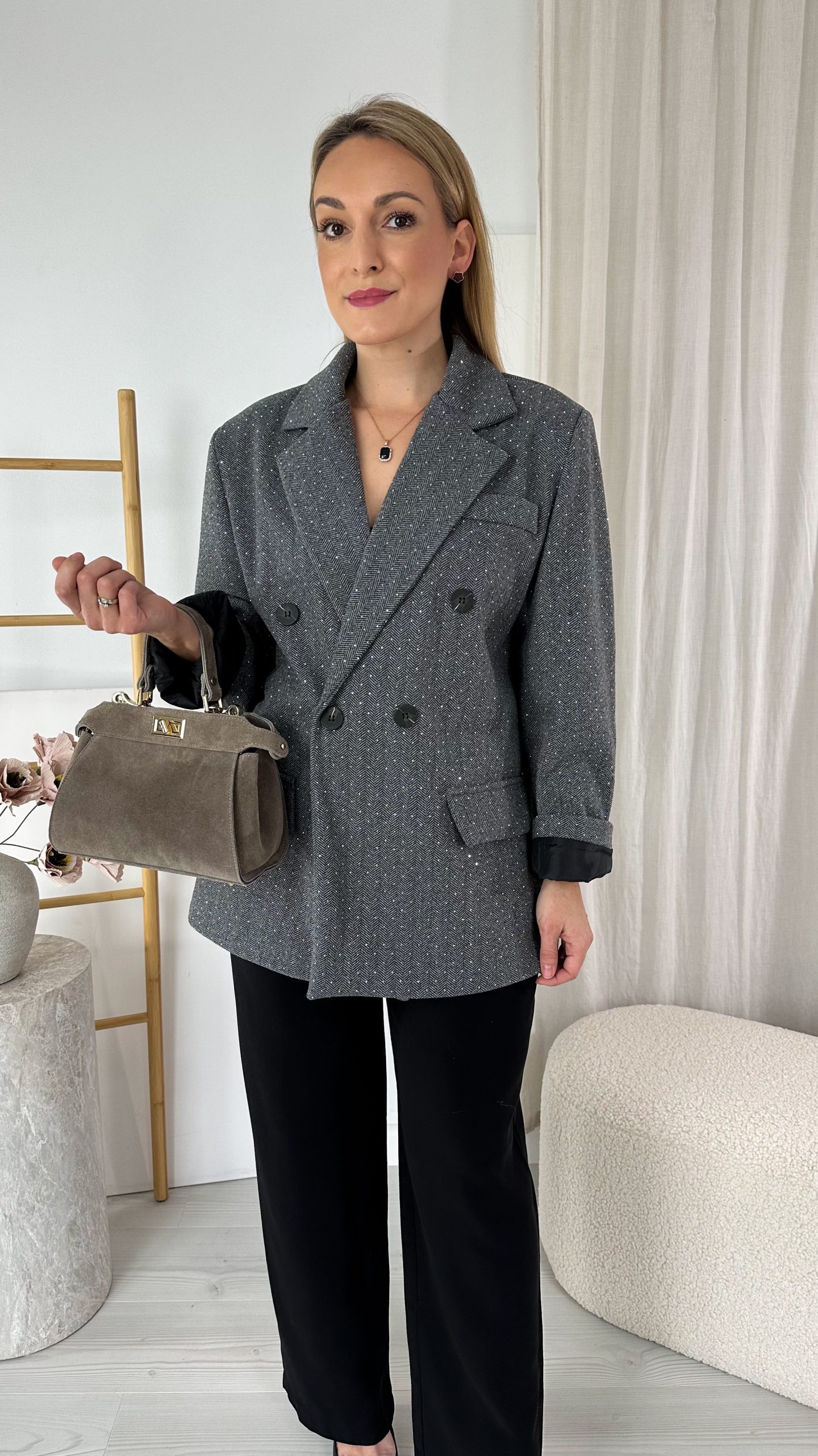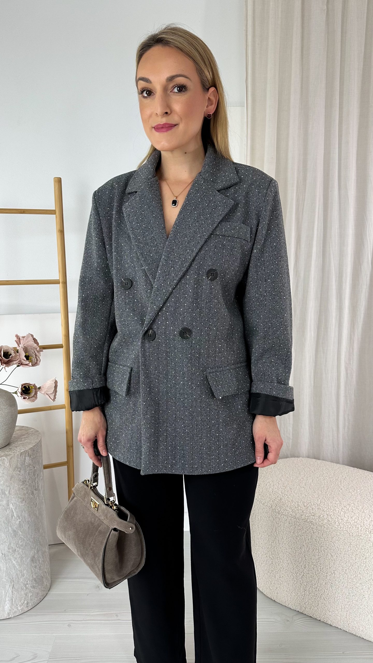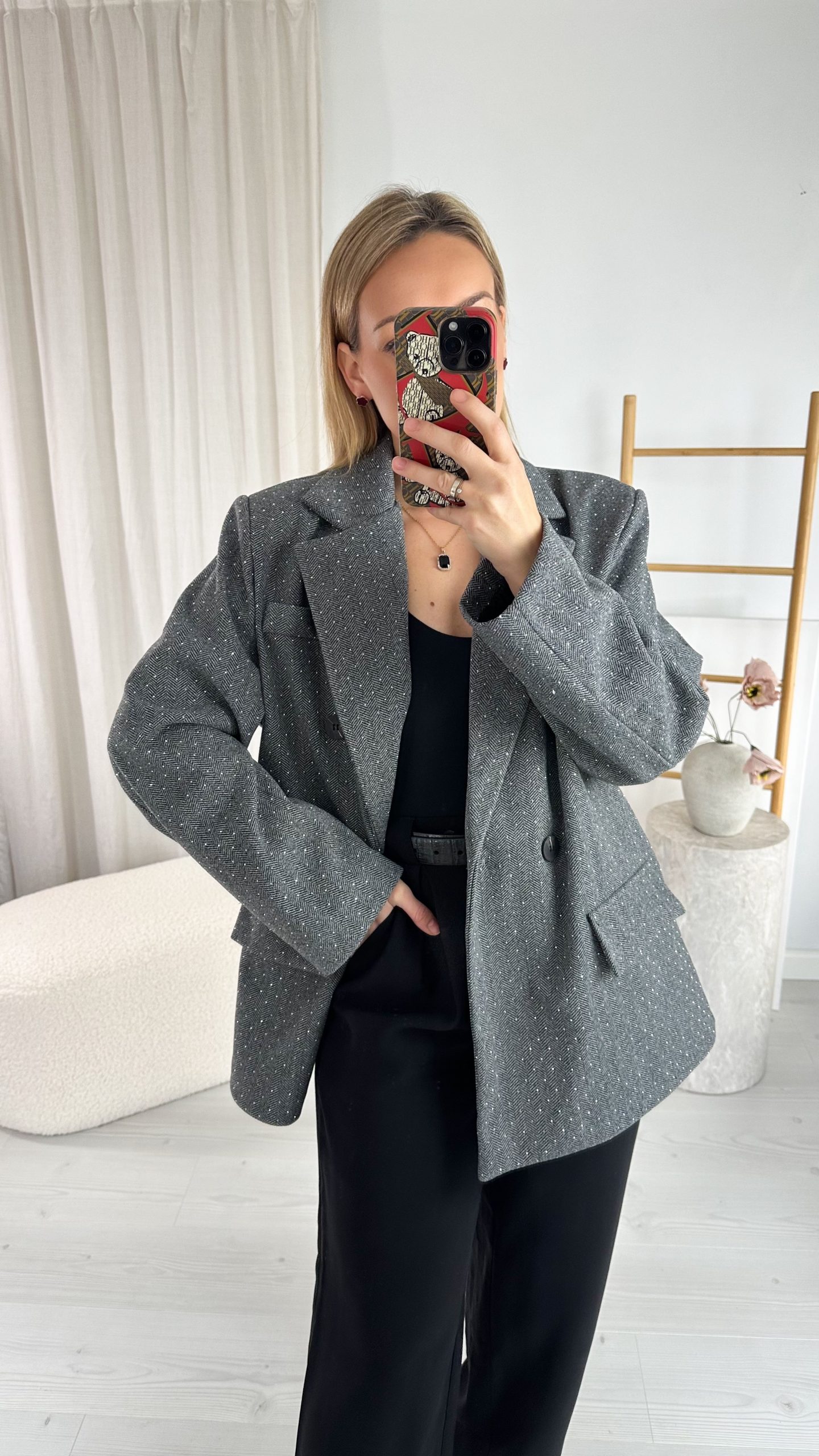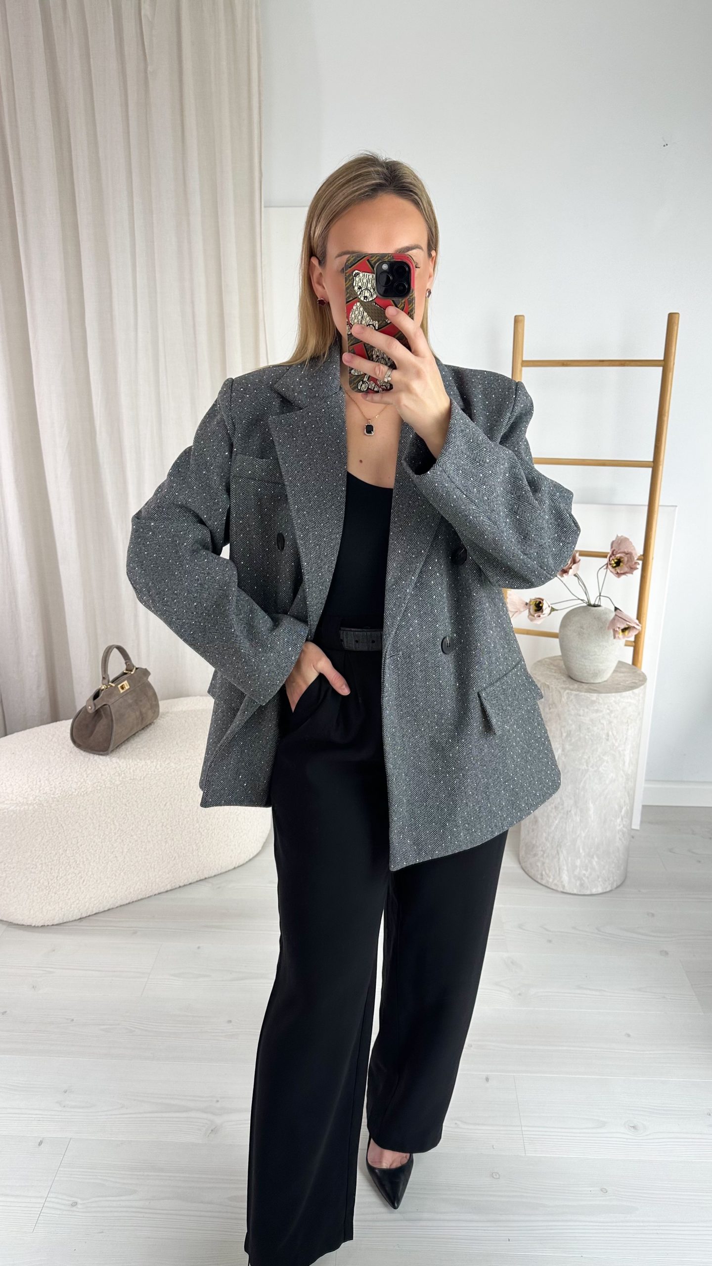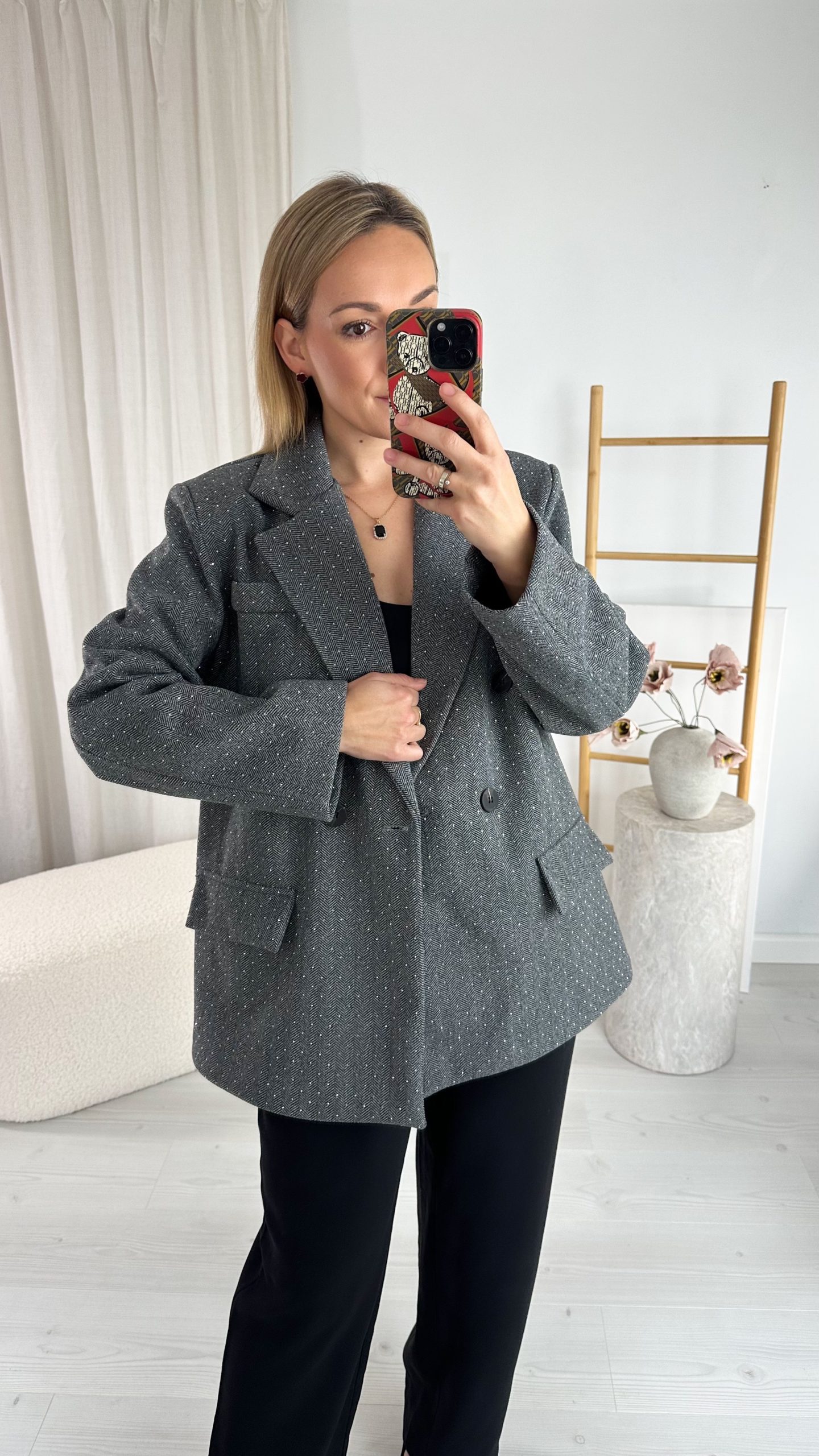 Szara marynarka oversize wysadzana drobnymi, błyszczącymi dżetami – olśniewający akcent na święta i wyjątkowe wyjścia
