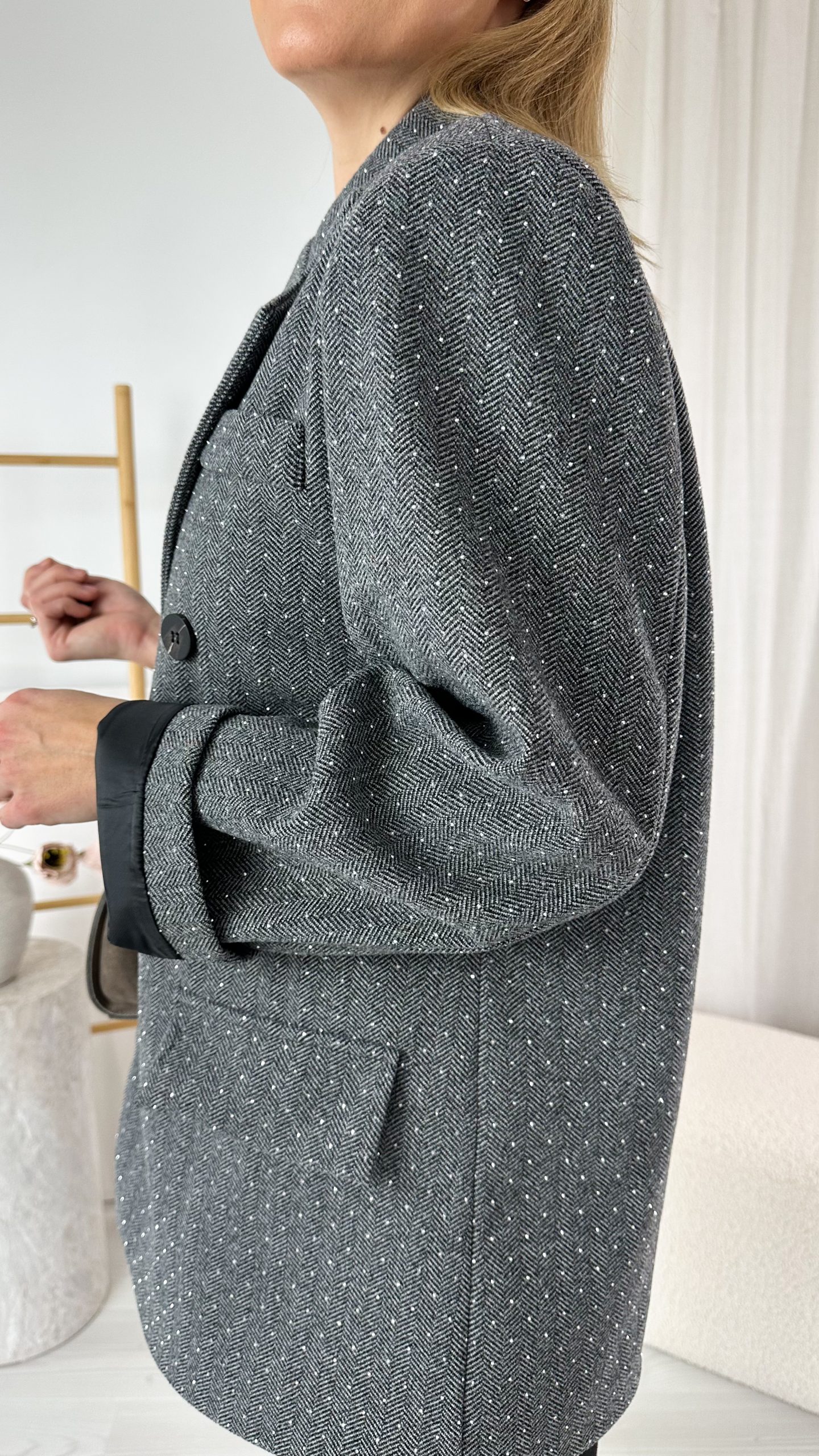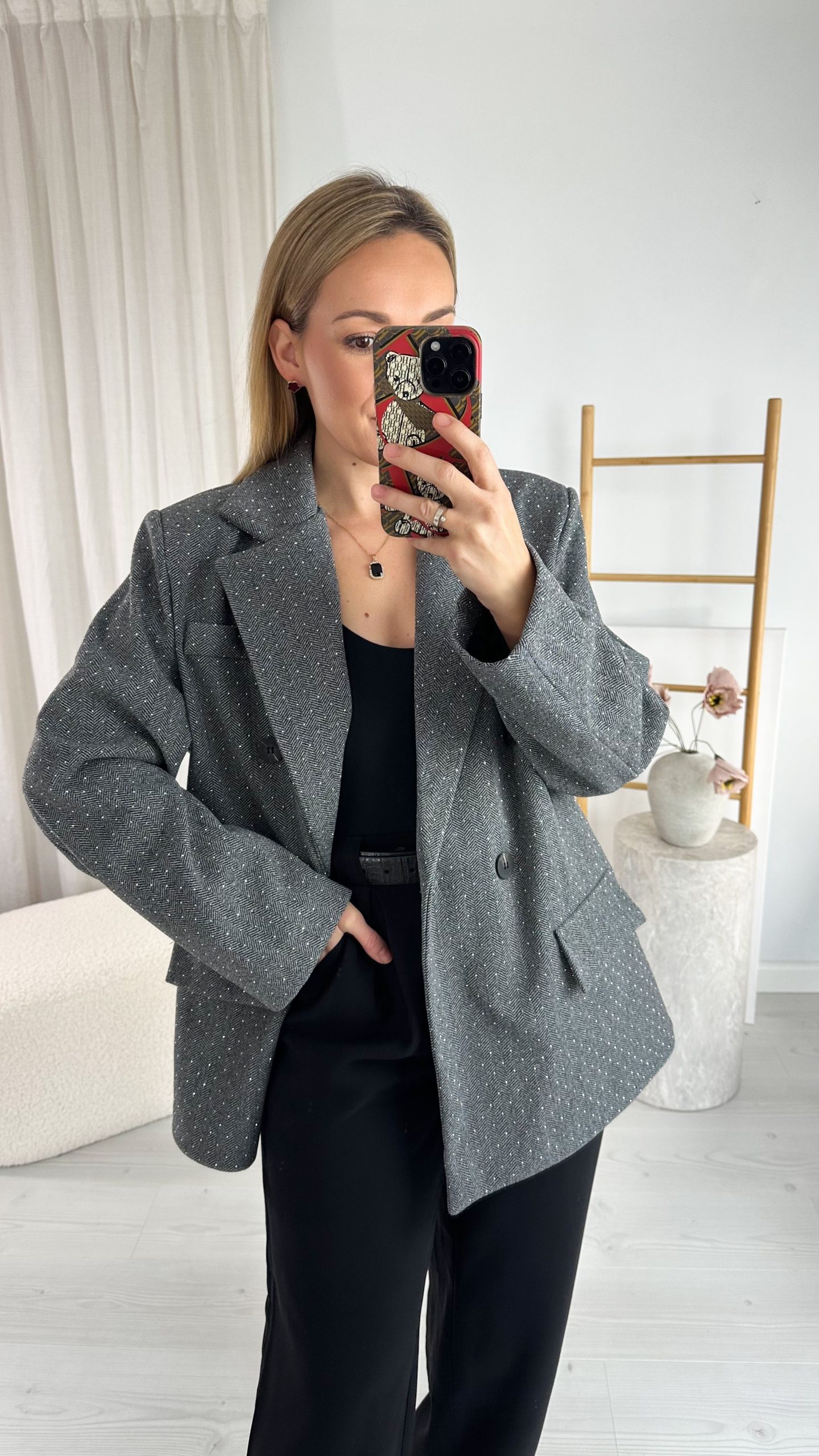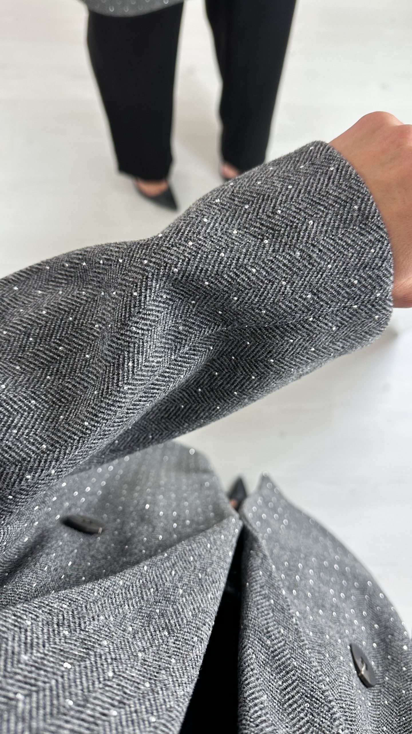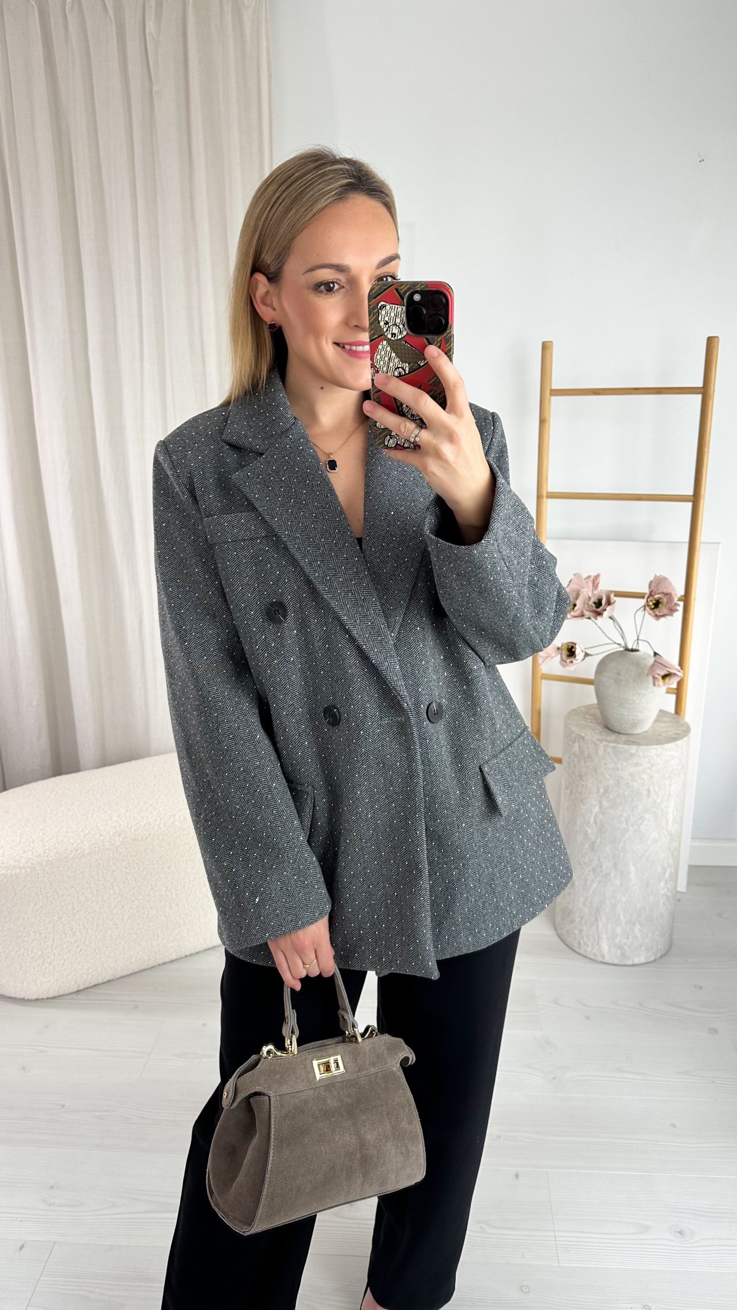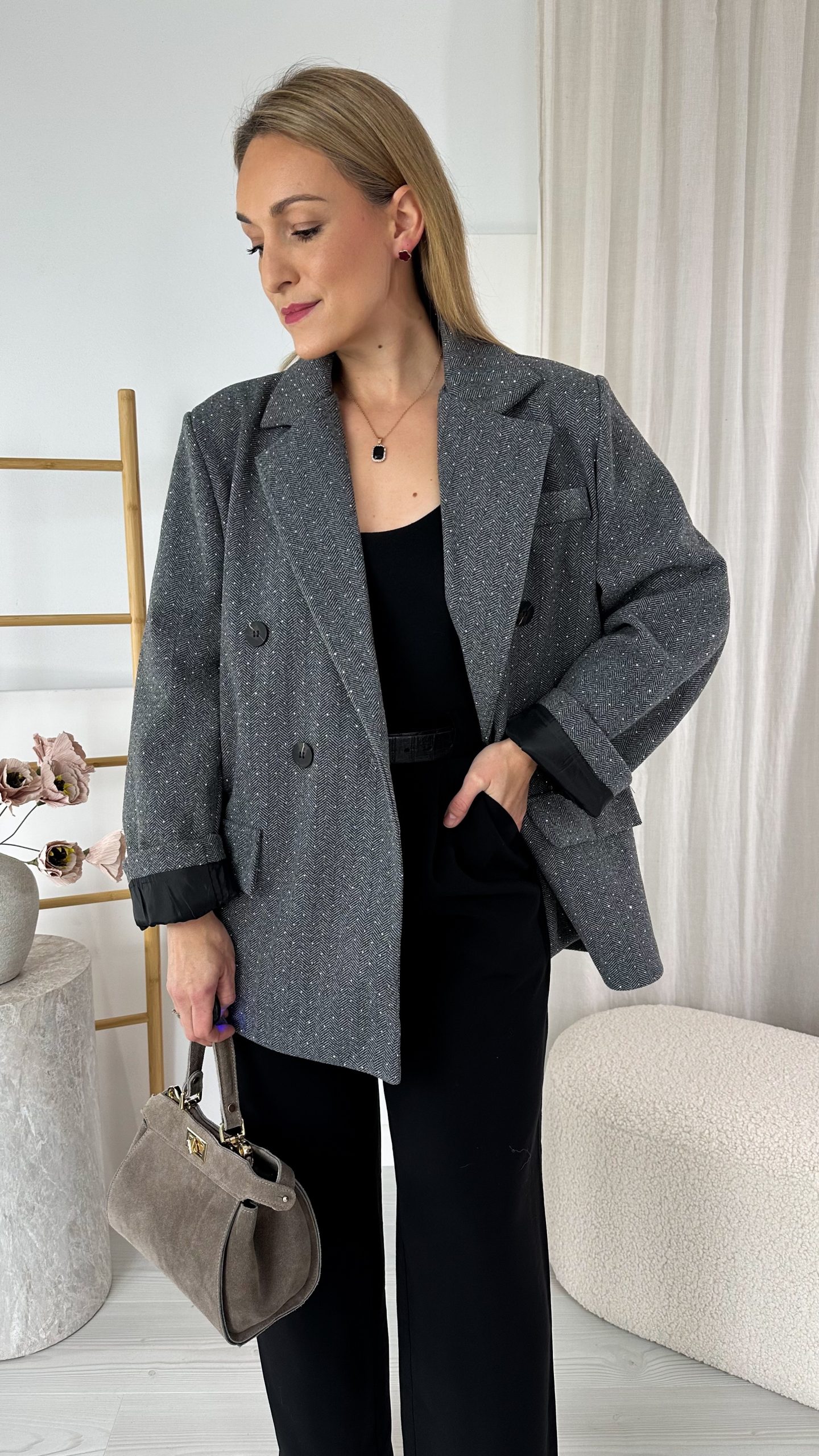 Szara marynarka oversize wysadzana drobnymi, błyszczącymi dżetami – olśniewający akcent na święta i wyjątkowe wyjścia