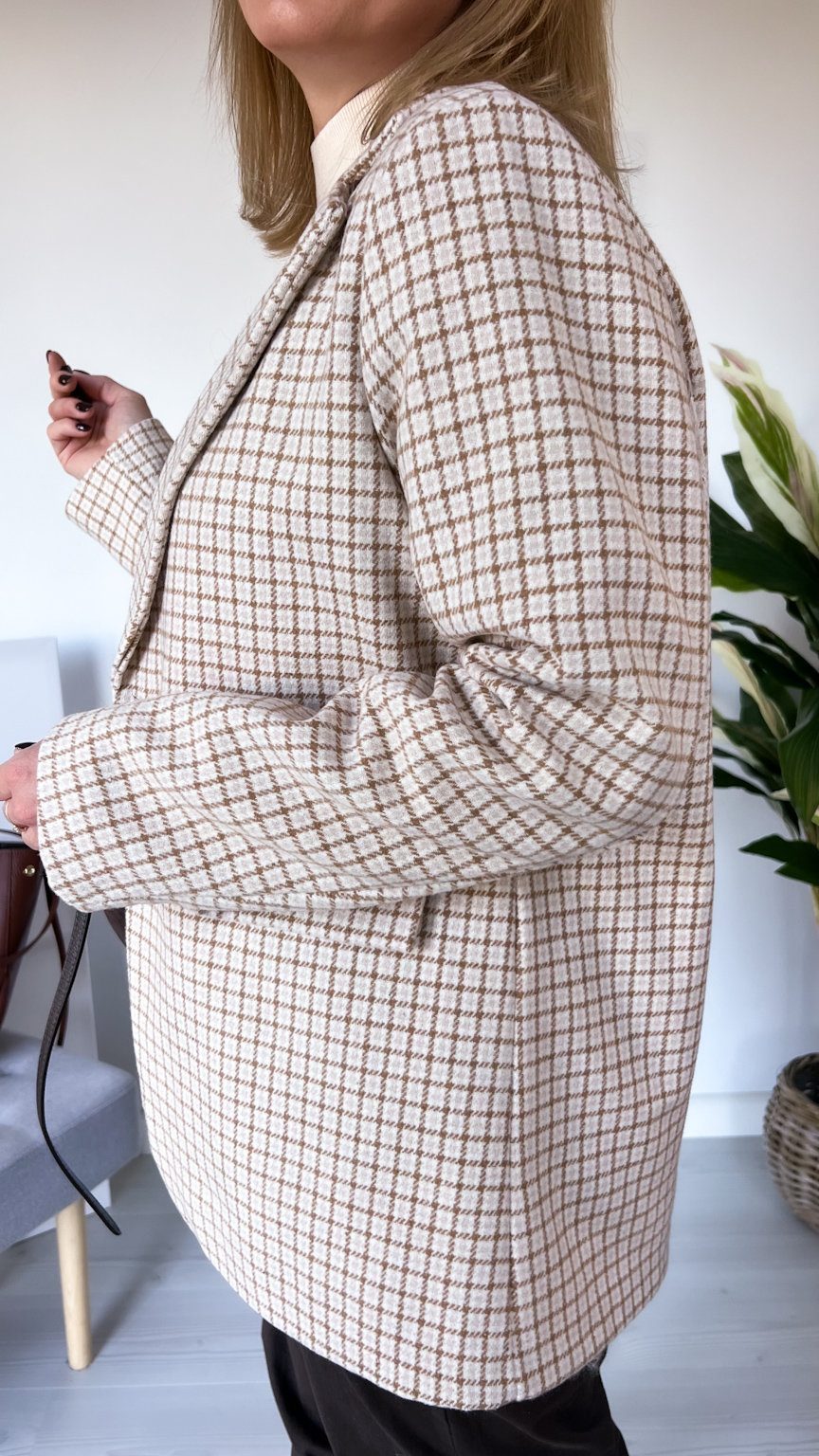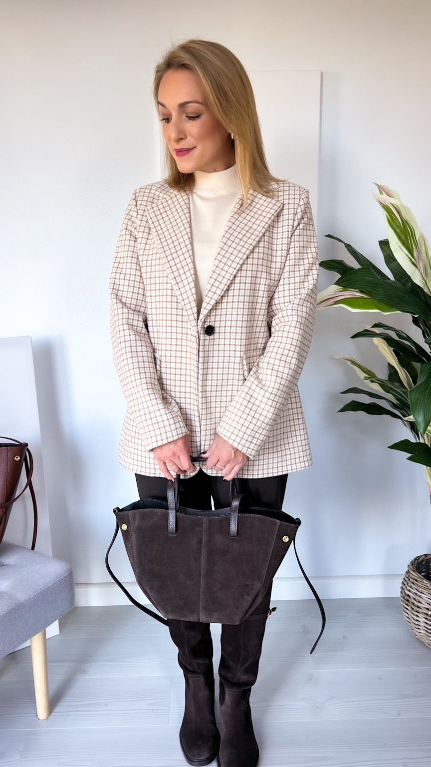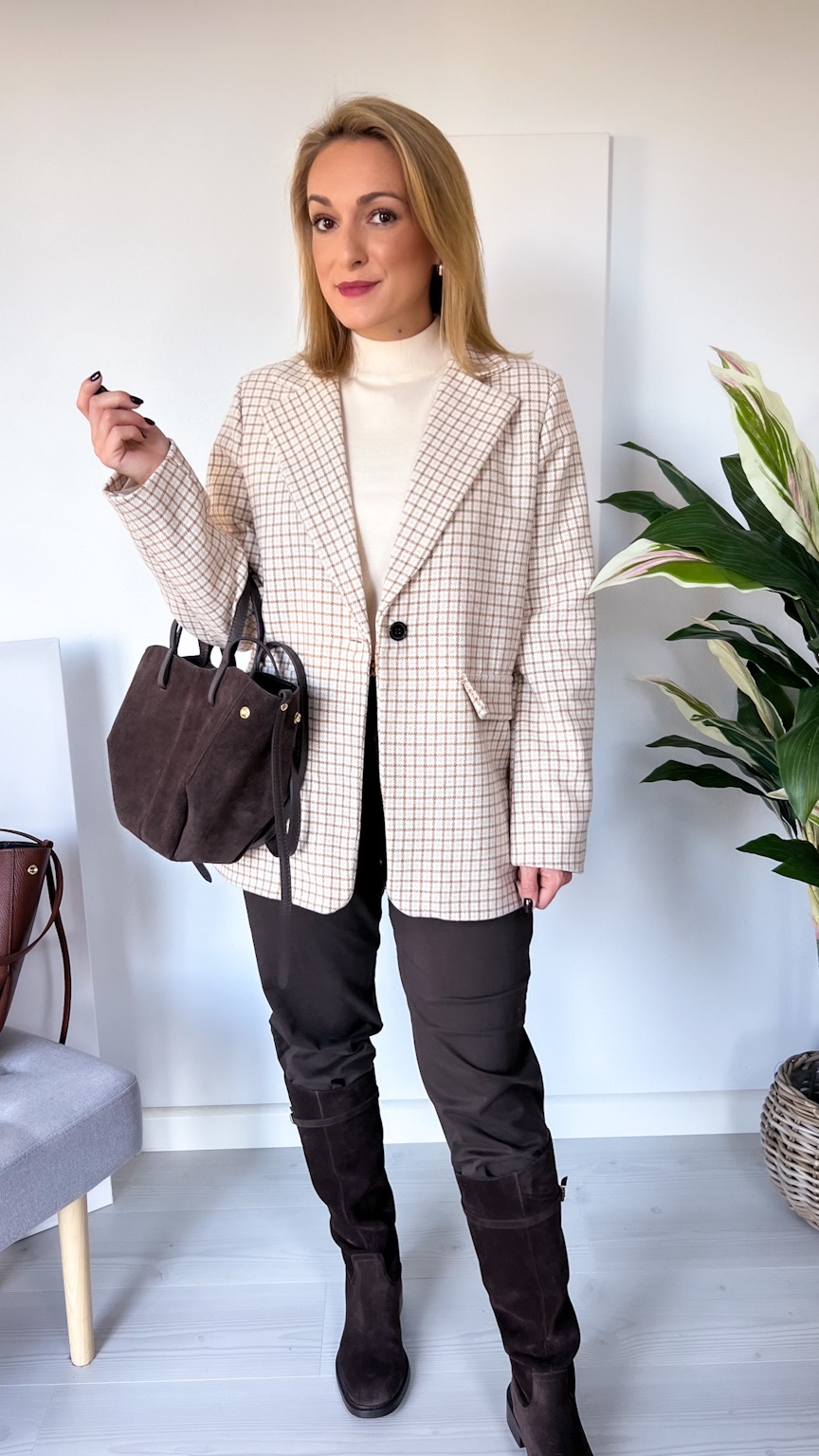 Marynarka w bordowo-beżową jodełkę – idealna na jesień