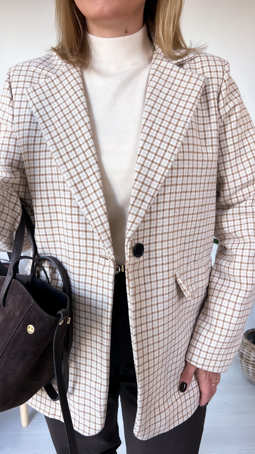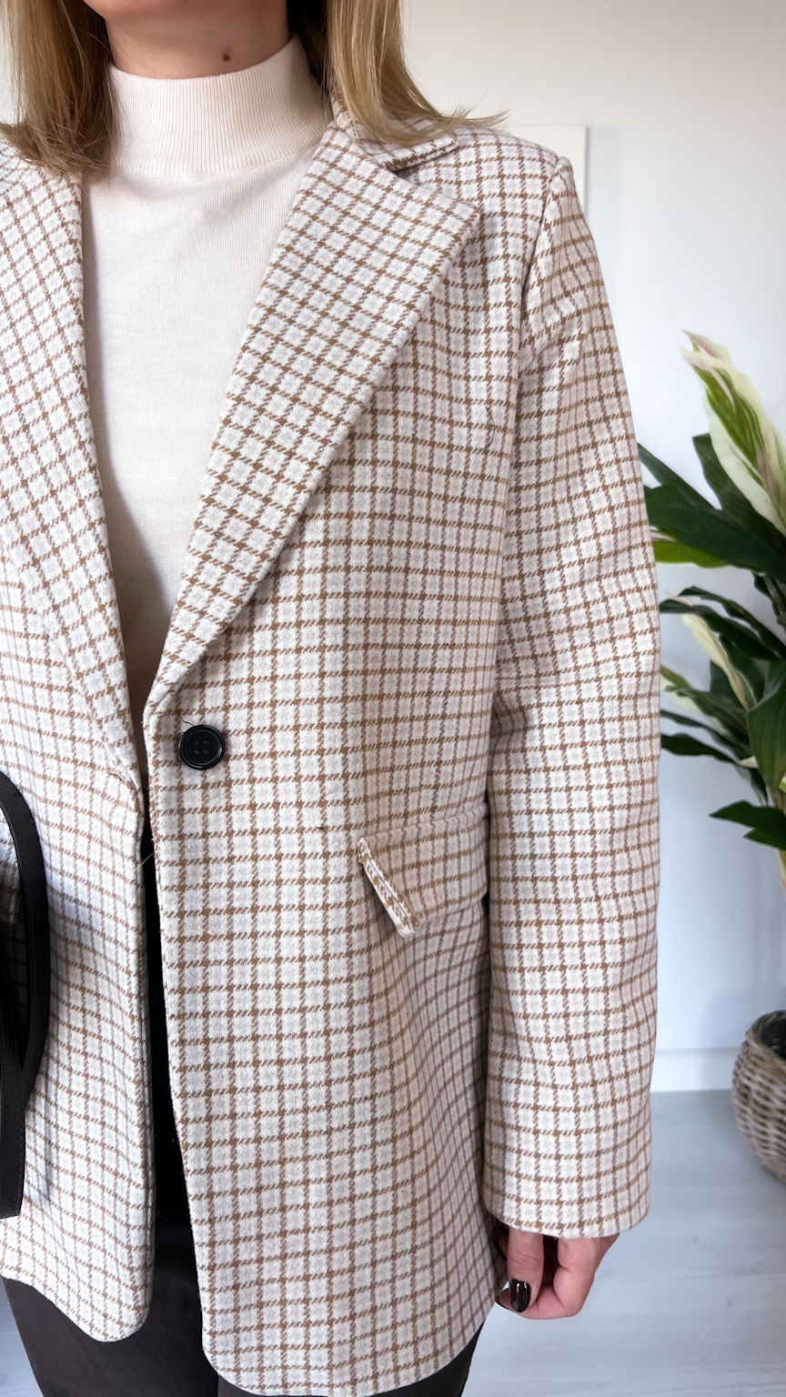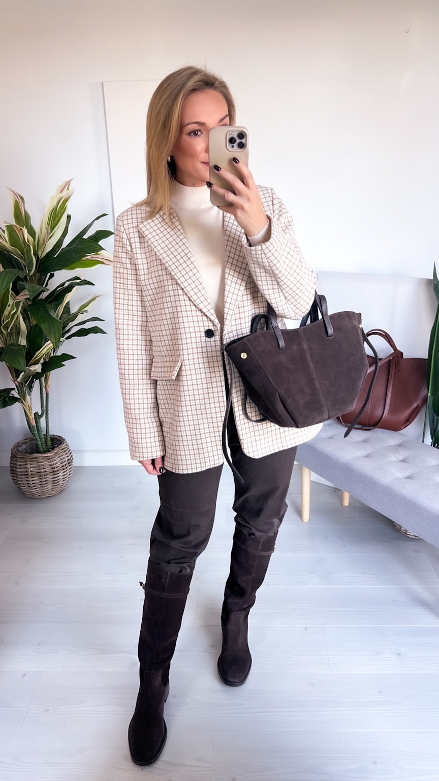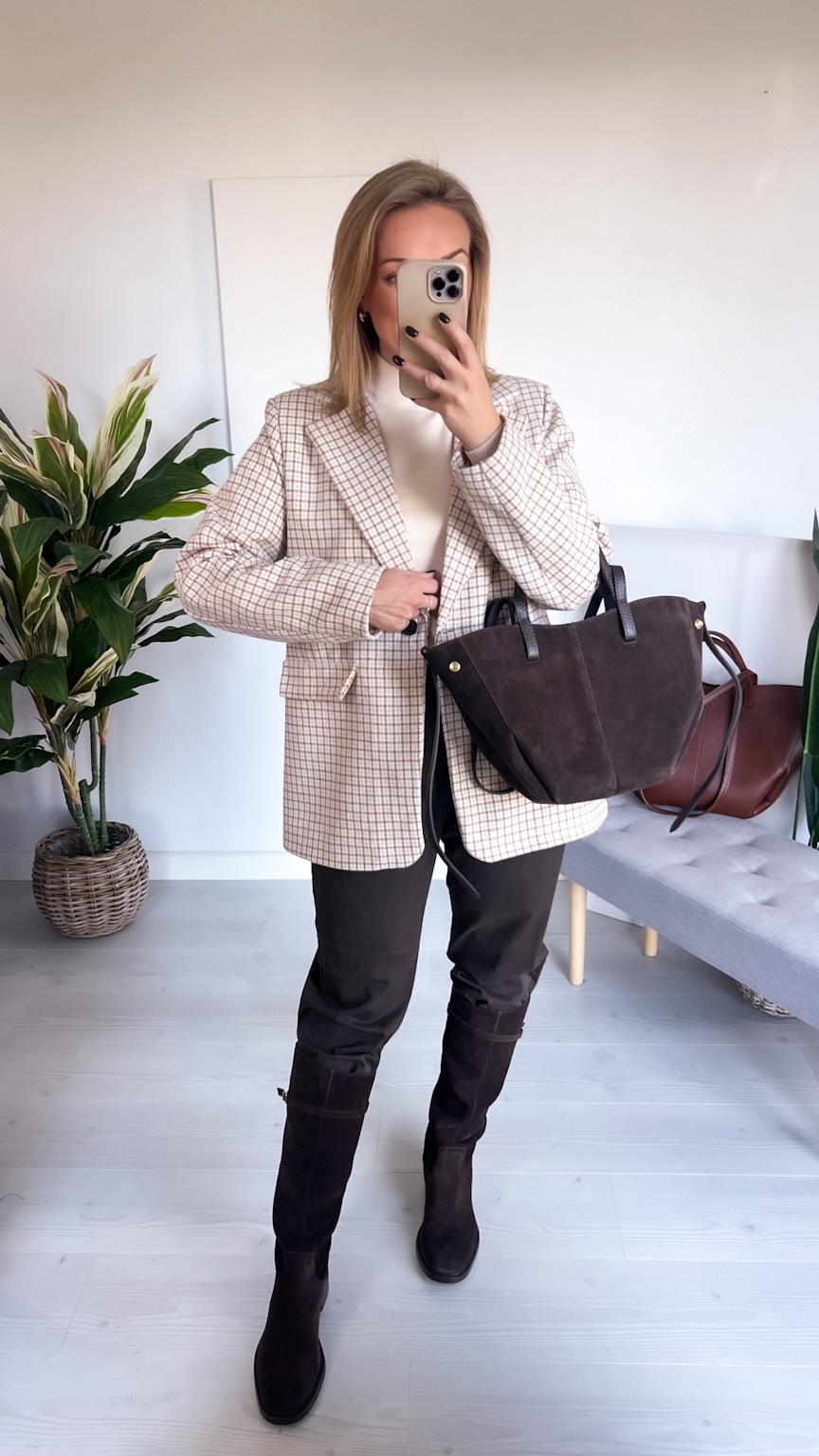 Marynarka w bordowo-beżową jodełkę – idealna na jesień