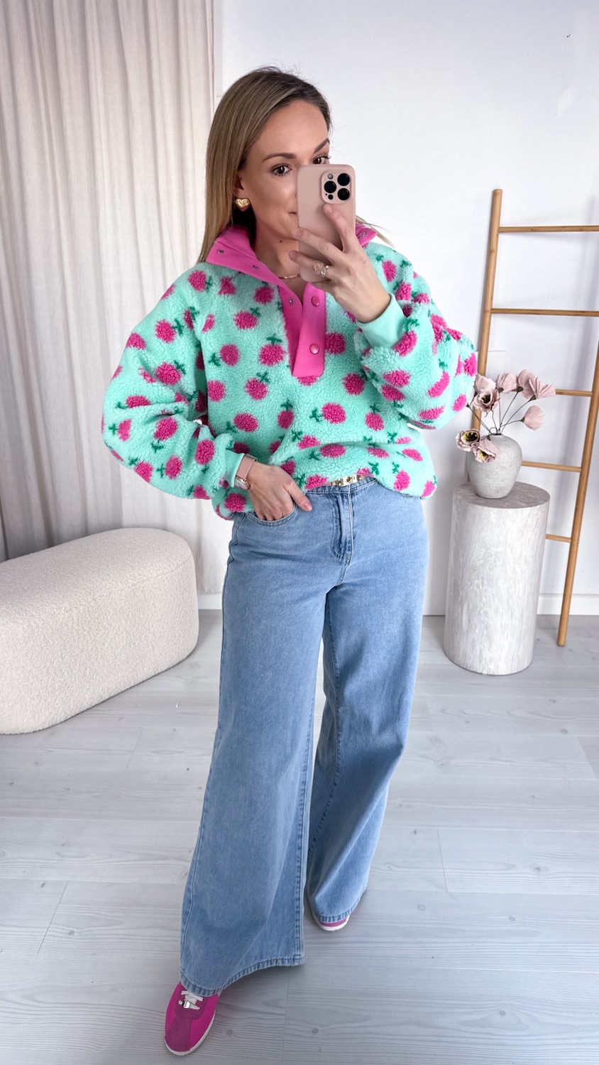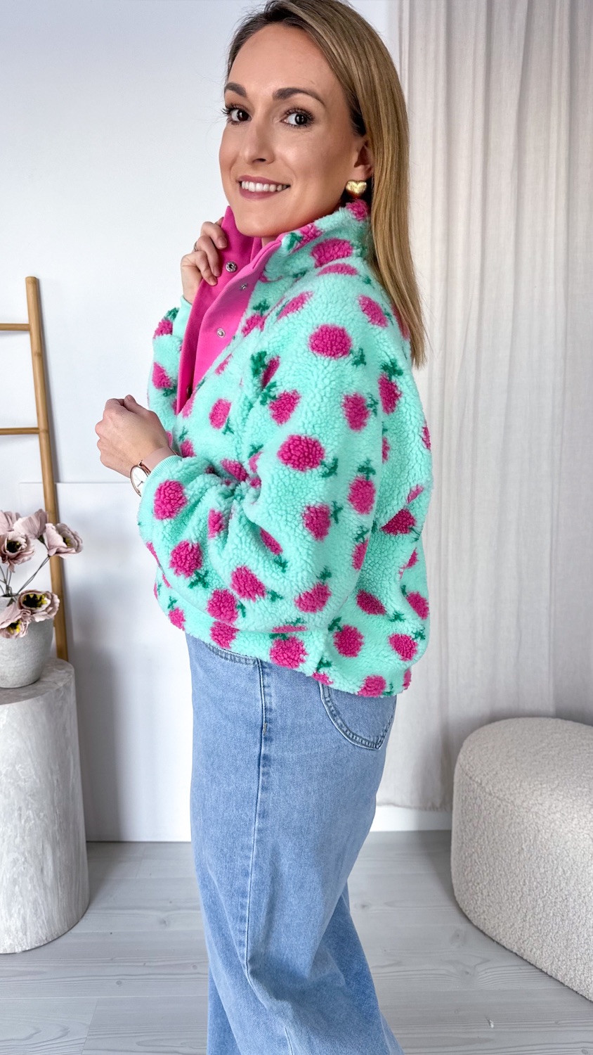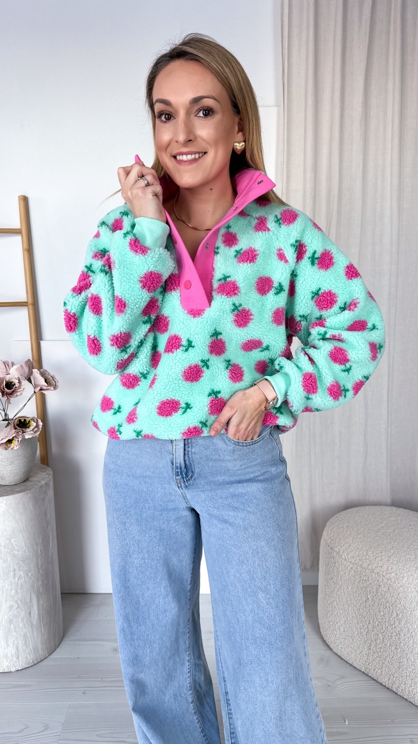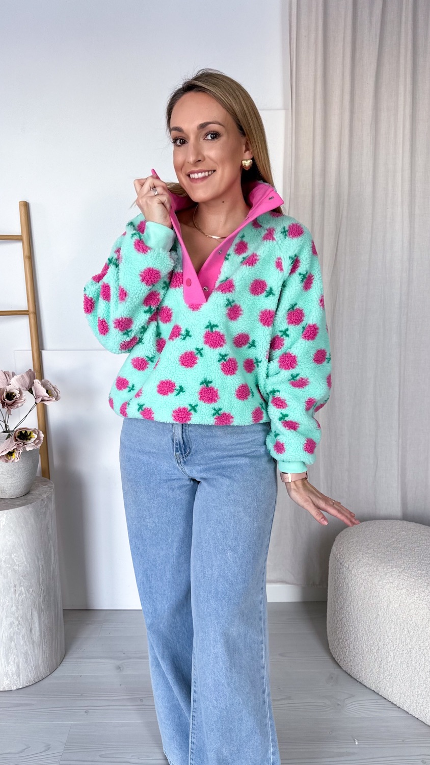 Polar typu baranek w wyjątkowym odcieniu ciemnej mięty, ozdobiony wyrazistym wzorem amarantowych kwiatów. To model, który natychmiast przyciąga wzrok i nadaje stylizacji niepowtarzalnego charakteru. Intensywne kolory tworzą odważne, a jednocześnie harmonijne połączenie, gwarantując spektakularny efekt WOW.