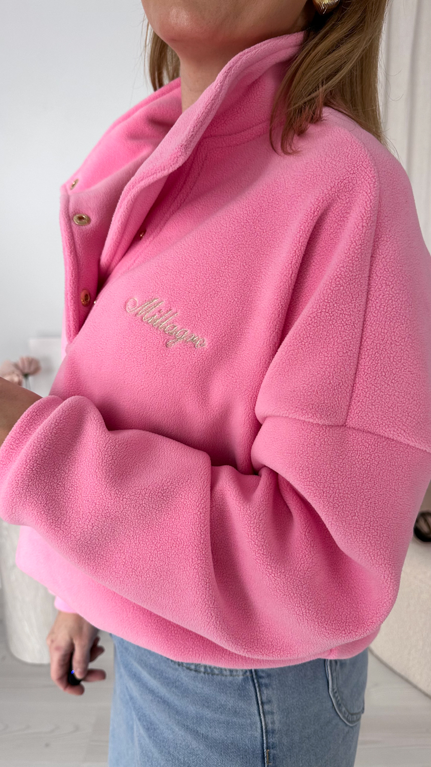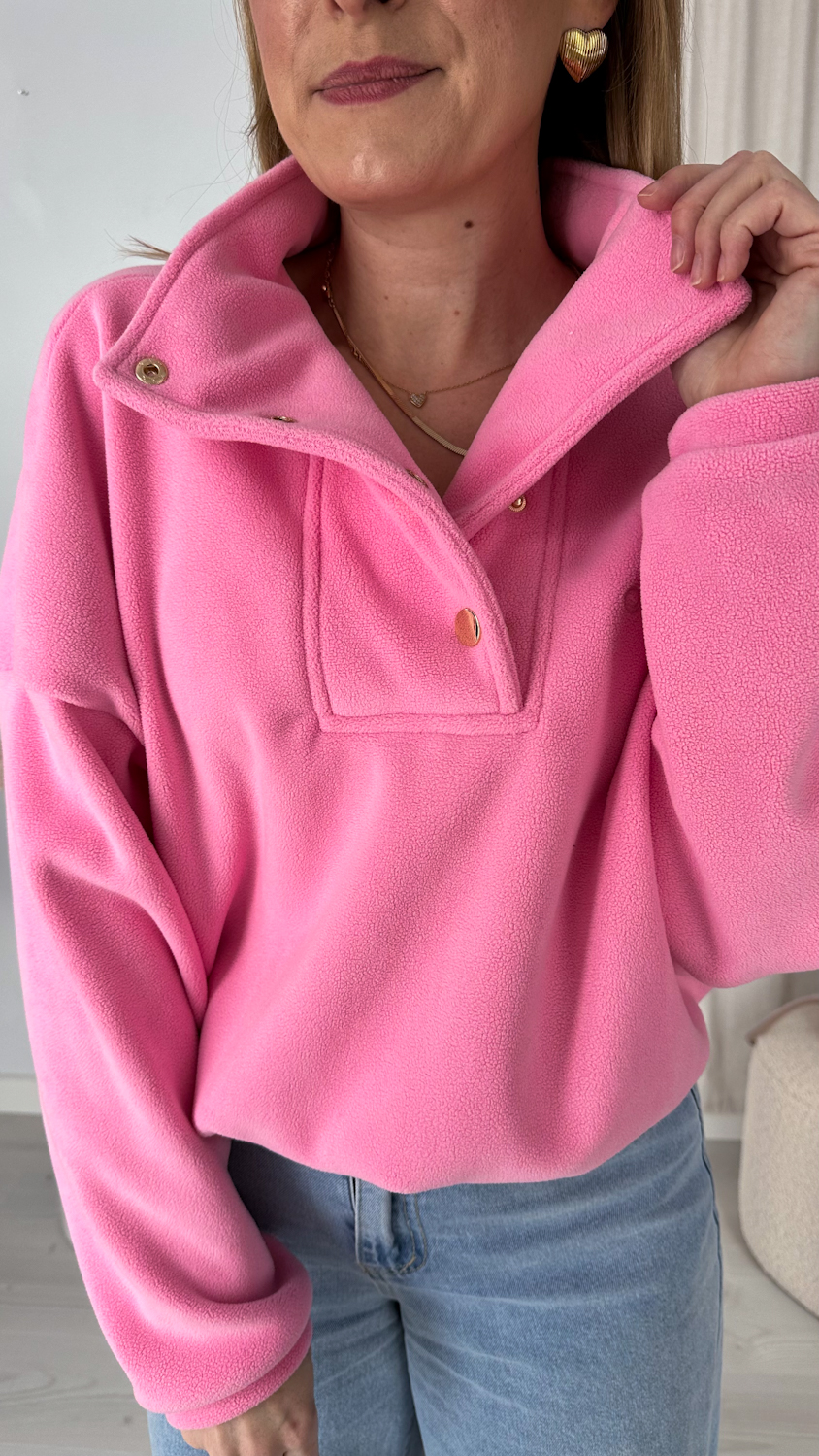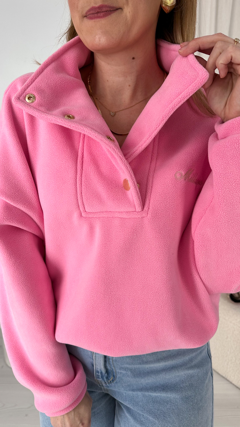 Model zapinany pod szyję na eleganckie, złote zatrzaski wyróżnia się dopracowanymi detalami i nowoczesnym wykończeniem. Subtelne, złote akcenty dodają całości stylowego charakteru i sprawiają, że polar prezentuje się bardziej elegancko niż klasyczne modele.