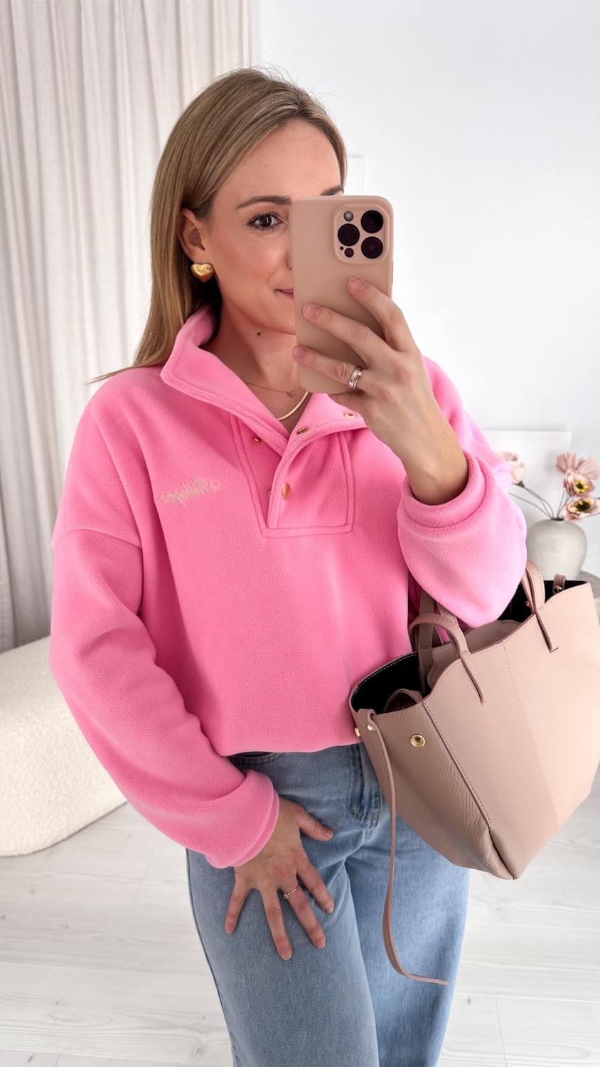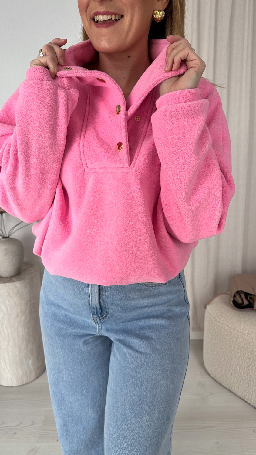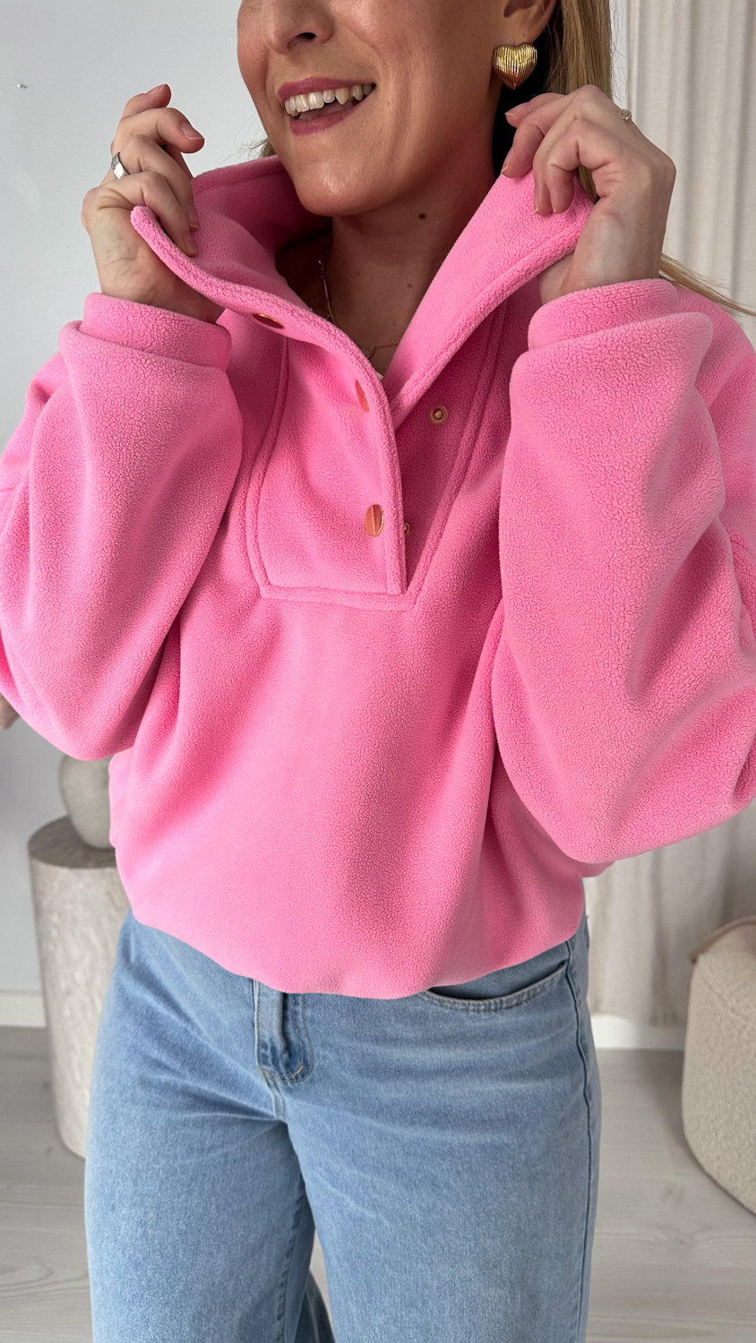 Model zapinany pod szyję na eleganckie, złote zatrzaski wyróżnia się dopracowanymi detalami i nowoczesnym wykończeniem. Subtelne, złote akcenty dodają całości stylowego charakteru i sprawiają, że polar prezentuje się bardziej elegancko niż klasyczne modele.