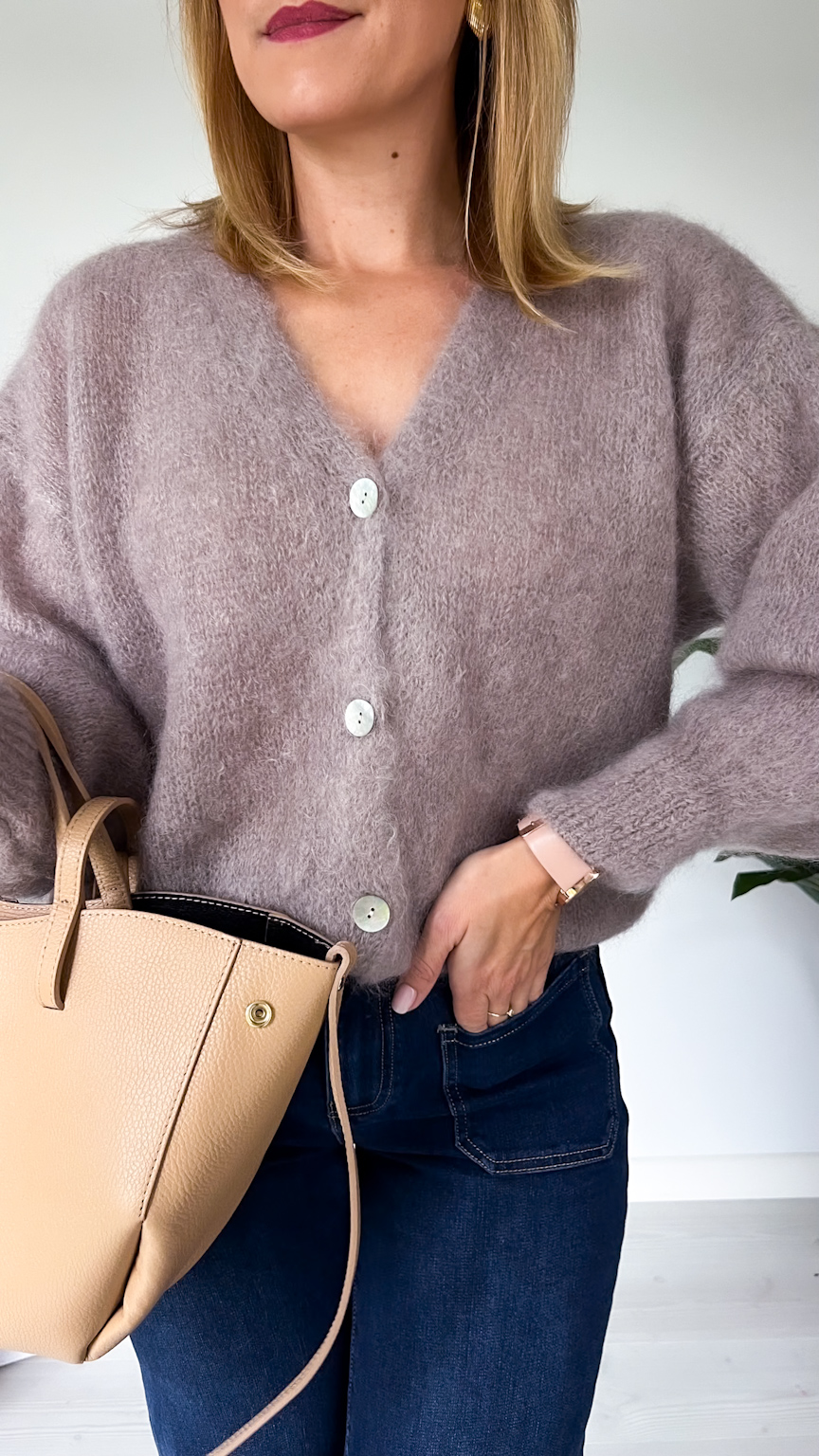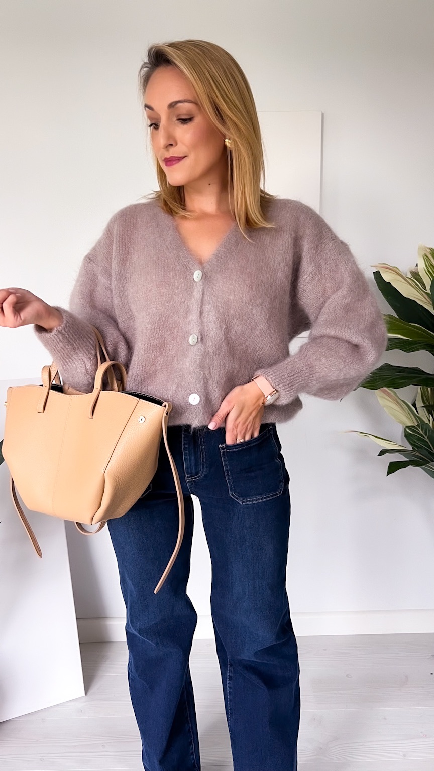 Elegancki kardigan zapinany na guziki wykonany z wysokiej jakości przędzy z 80% moheru to kwintesencja ponadczasowego stylu i komfortu. Lekki, puszysty i wyjątkowo miękki, otuli Cię ciepłem w chłodniejsze dni, a jednocześnie pozwoli skórze oddychać.