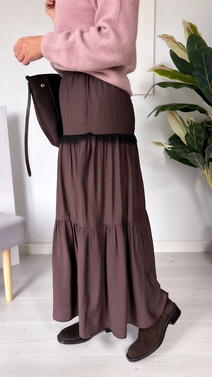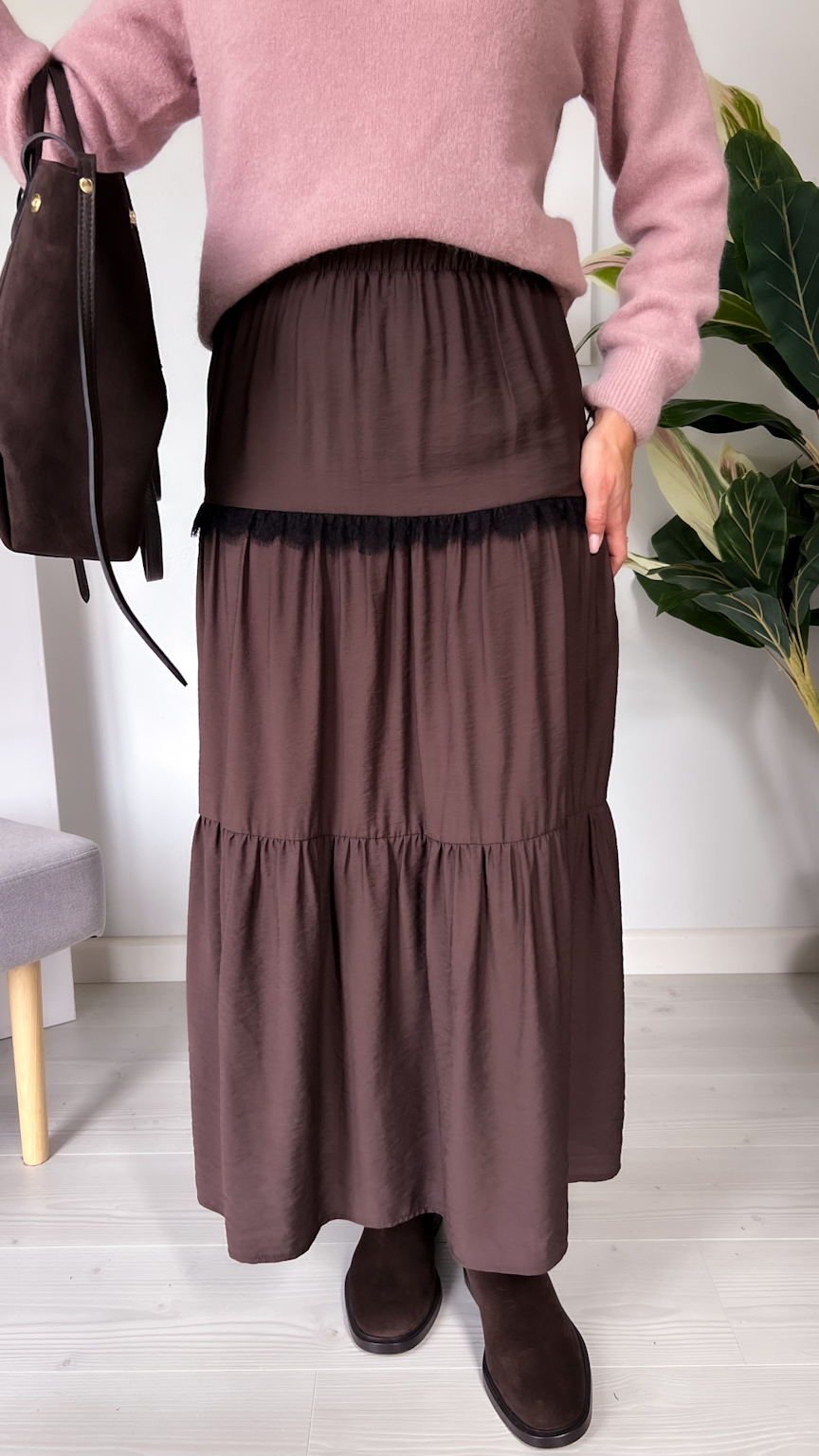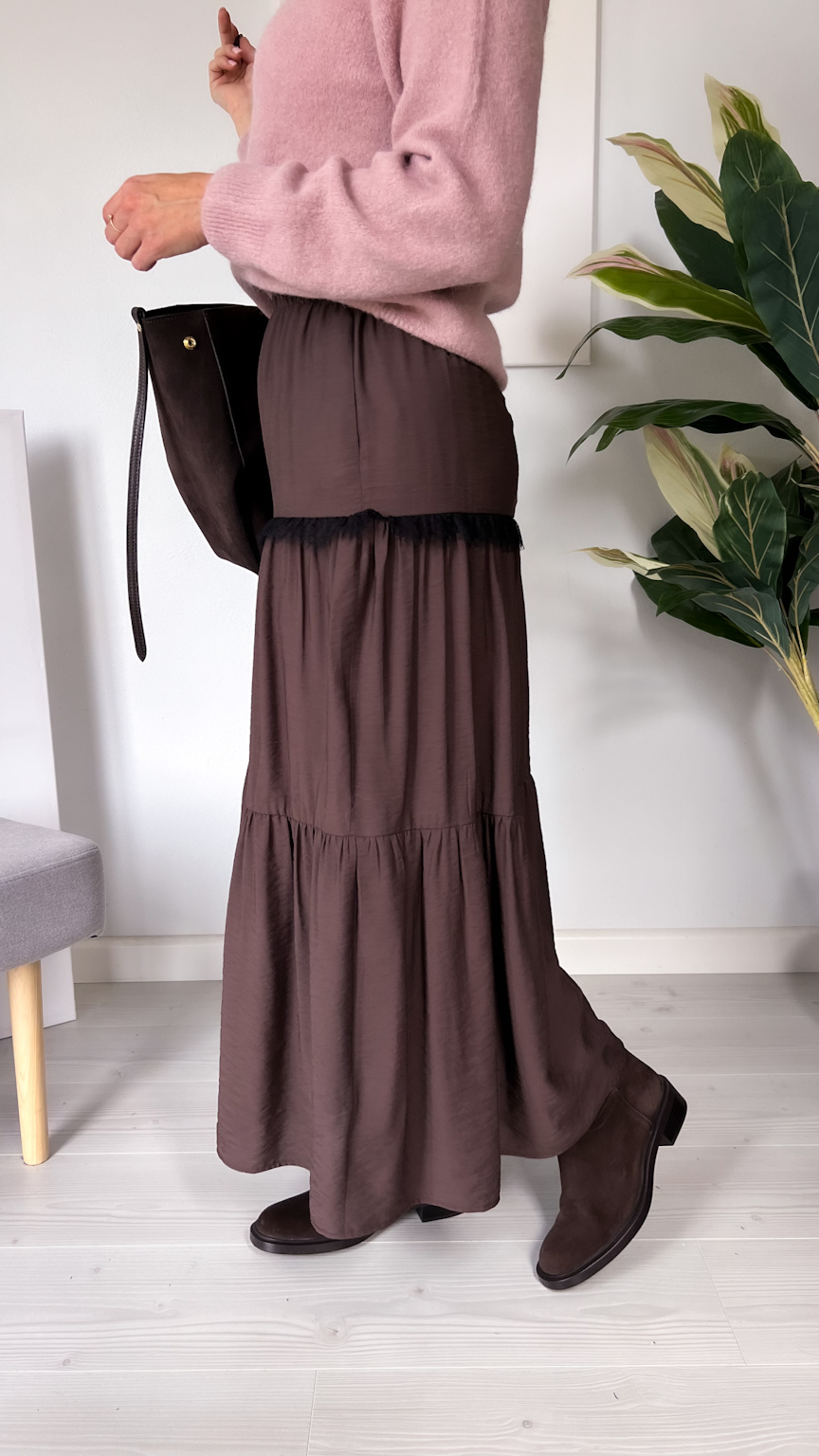 🍫 Czekoladowa spódnica maxi z kieszeniami i koronkową lamówką – kobieca, stylowa, idealna na jesień