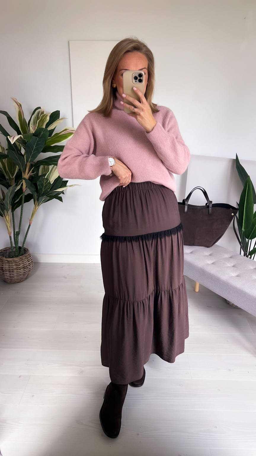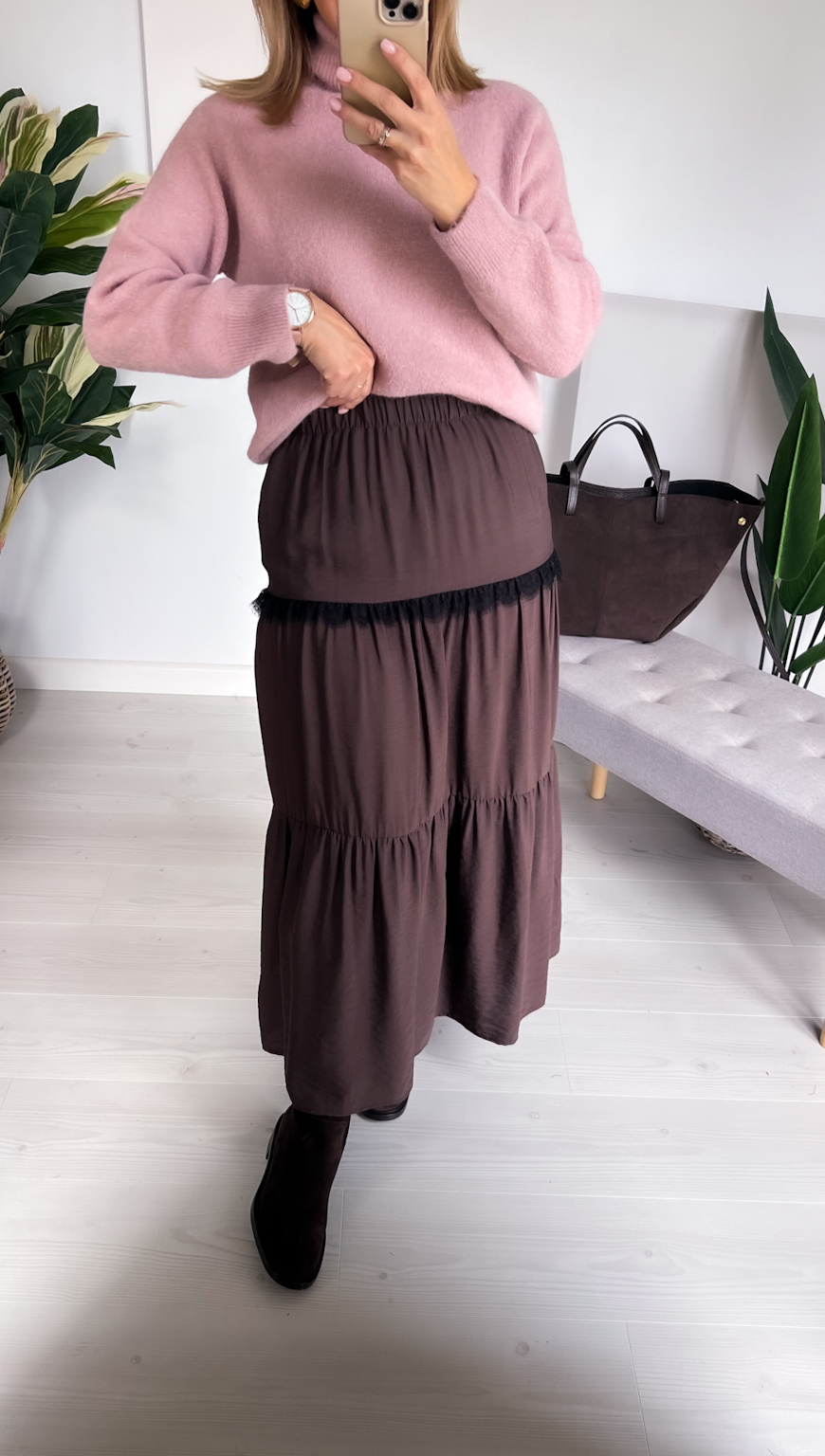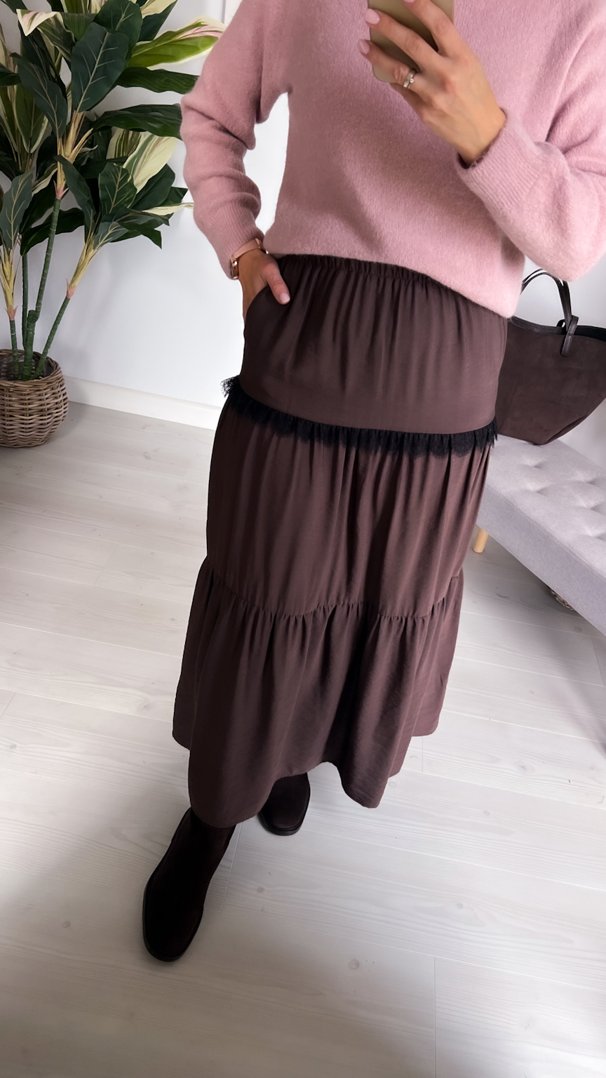 🍫 Czekoladowa spódnica maxi z kieszeniami i koronkową lamówką – kobieca, stylowa, idealna na jesień