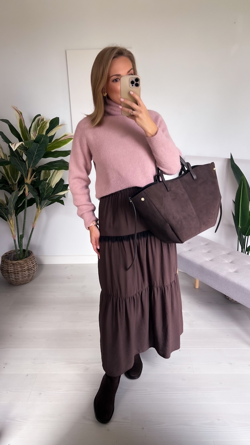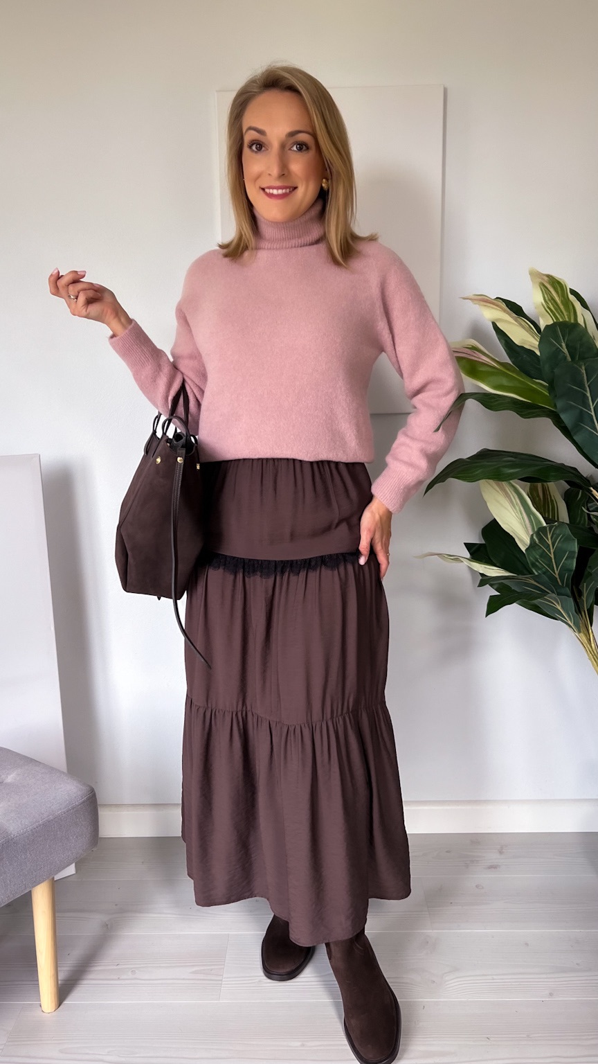 Ciepły, czekoladowy odcień to idealny wybór na jesień – świetnie komponuje się z kremowymi swetrami, golfami i płaszczami w naturalnych barwach. Ta spódnica doskonale sprawdzi się zarówno w codziennych stylizacjach, jak i w bardziej eleganckich zestawach – wystarczy dobrać buty na obcasie lub botki, by stworzyć pełen klasy look.