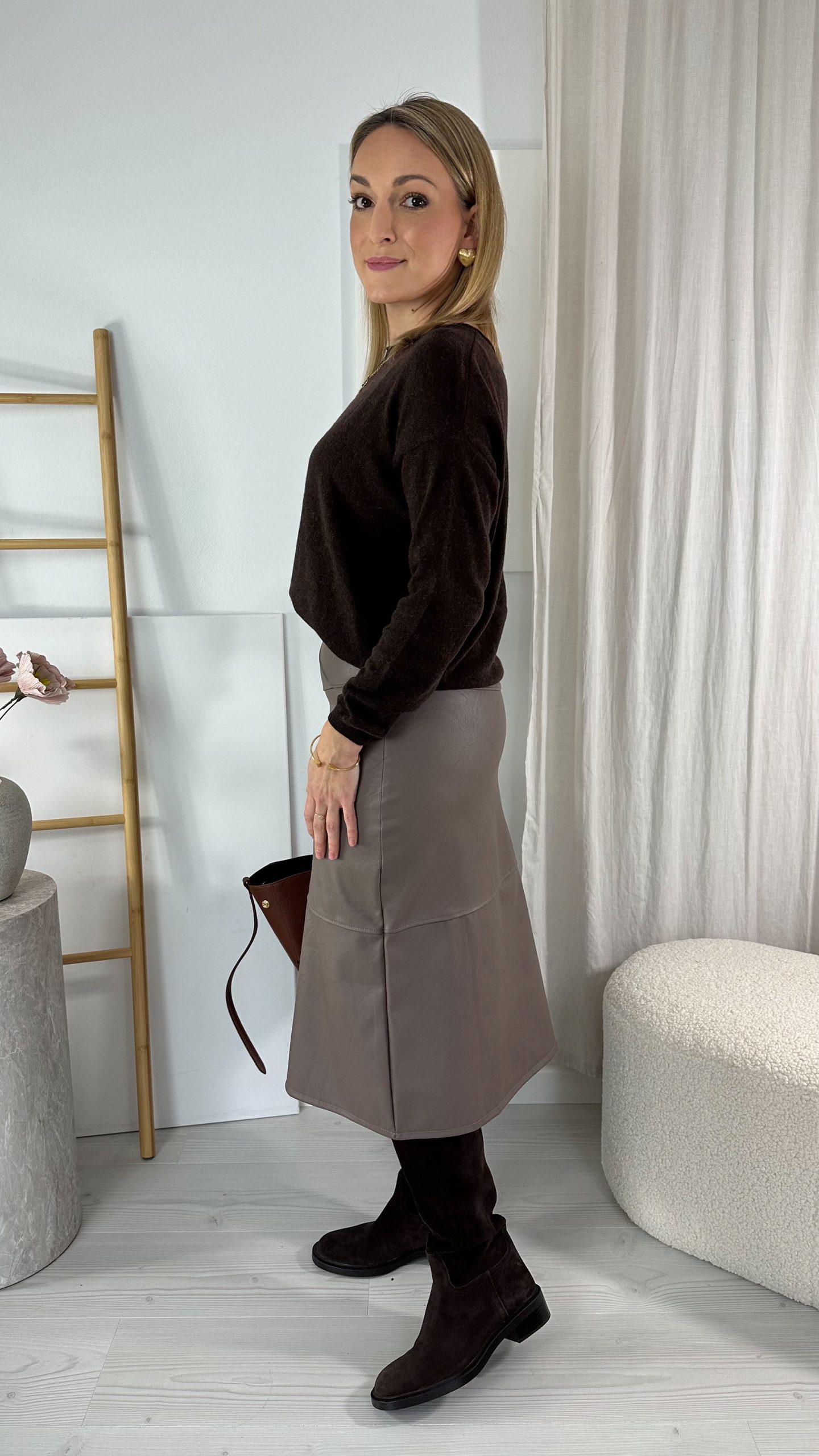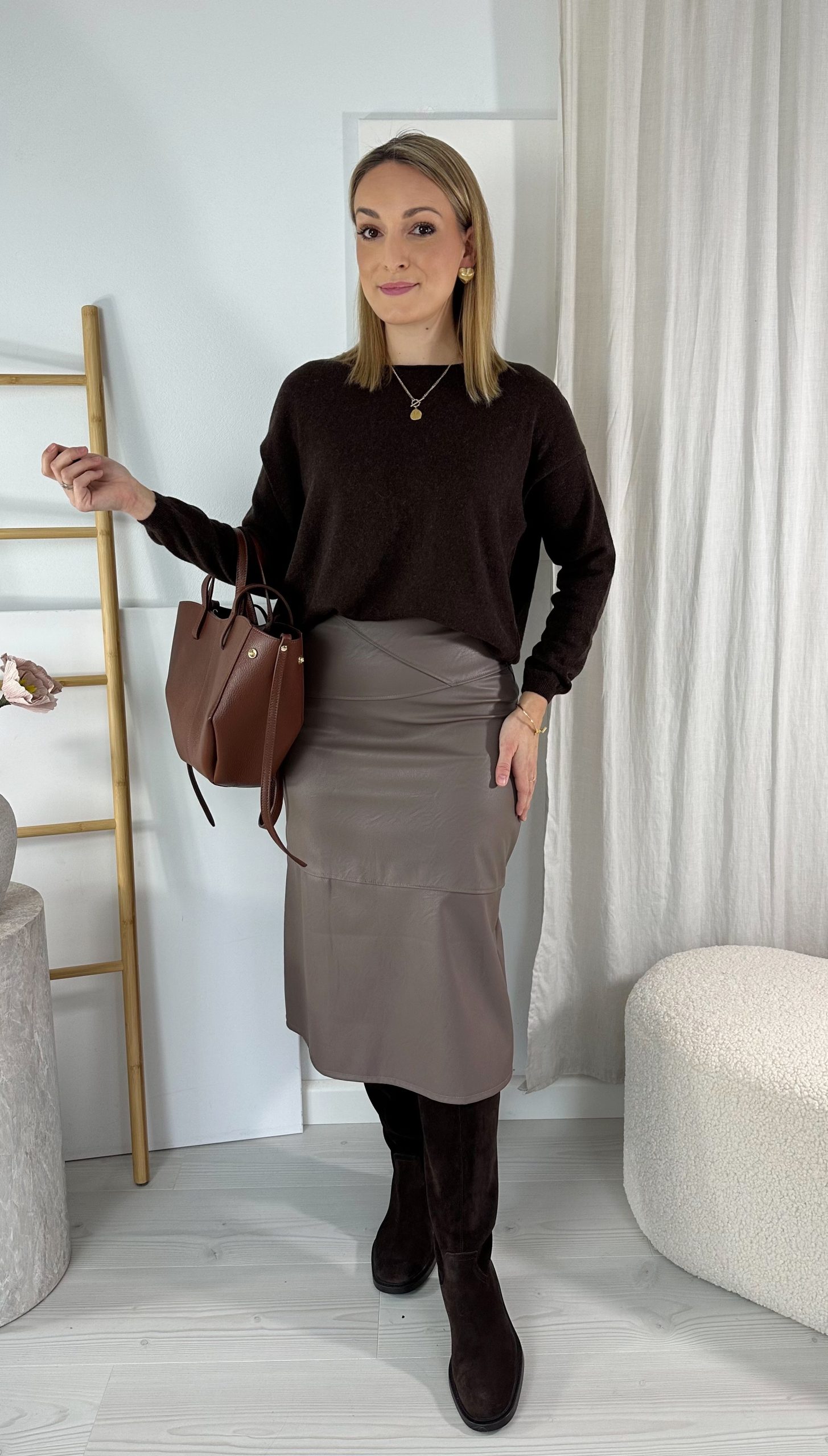 Model zapinany jest z boku na dyskretny zamek błyskawiczny, co ułatwia zakładanie i nadaje całości estetyczne wykończenie. Materiał o eleganckim wyglądzie świetnie sprawdzi się zarówno w codziennych stylizacjach z botkami i swetrem, jak i w bardziej eleganckim wydaniu z koszulą lub marynarką.