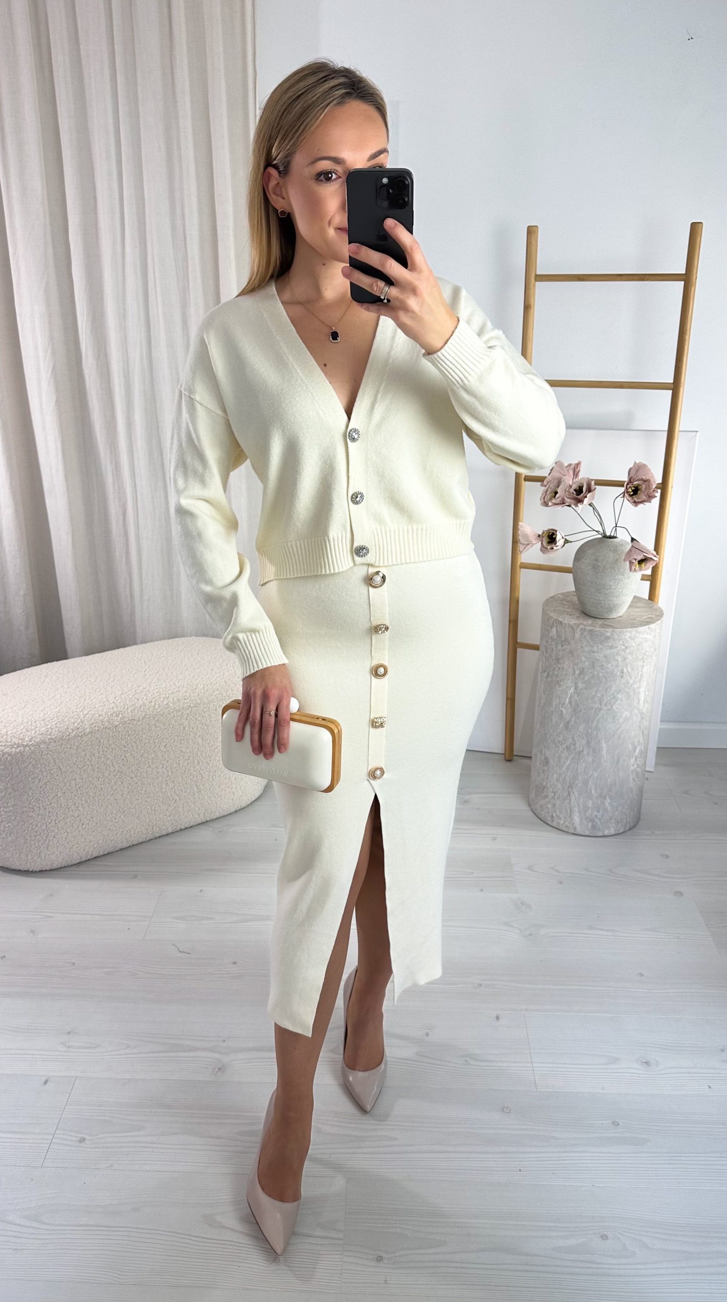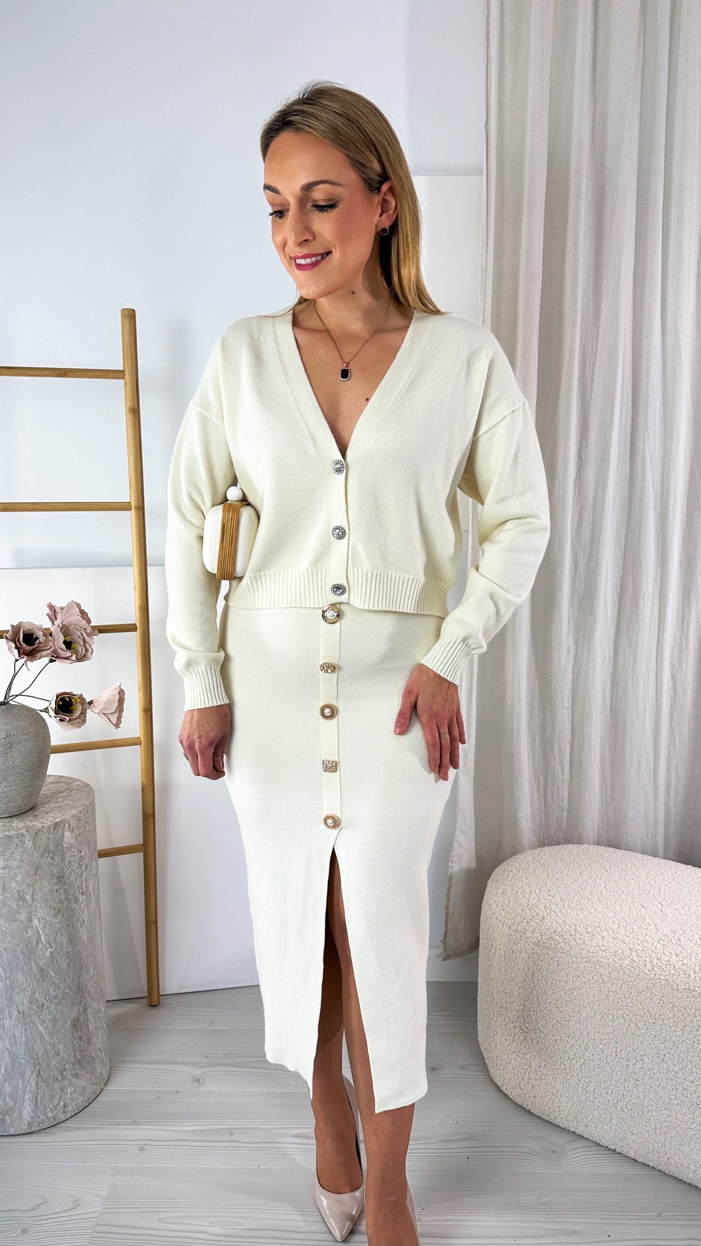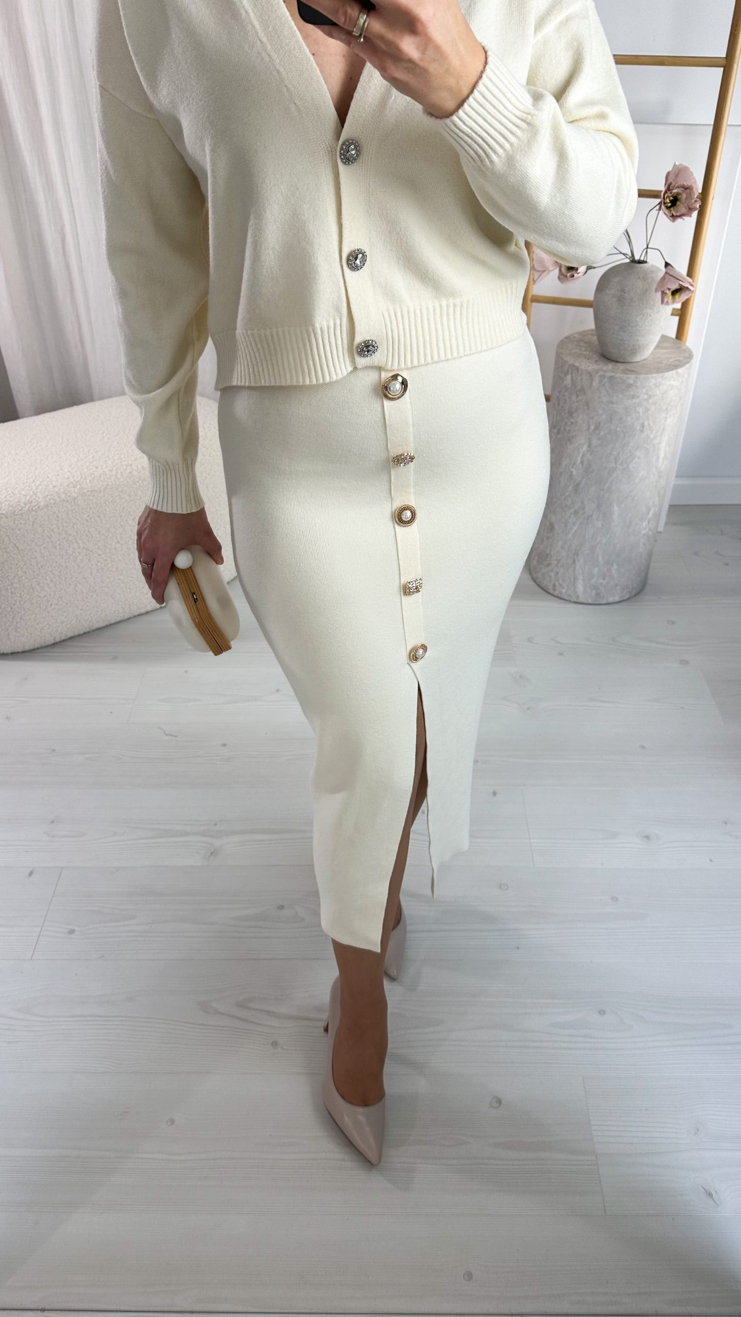 Przód spódnicy został ozdobiony złotymi guzikami, które dodają całości wyrazistego, luksusowego akcentu. To detal, który przyciąga uwagę i sprawia, że spódnica prezentuje się wyjątkowo stylowo — idealna zarówno do codziennych stylizacji, jak i bardziej eleganckich zestawów.