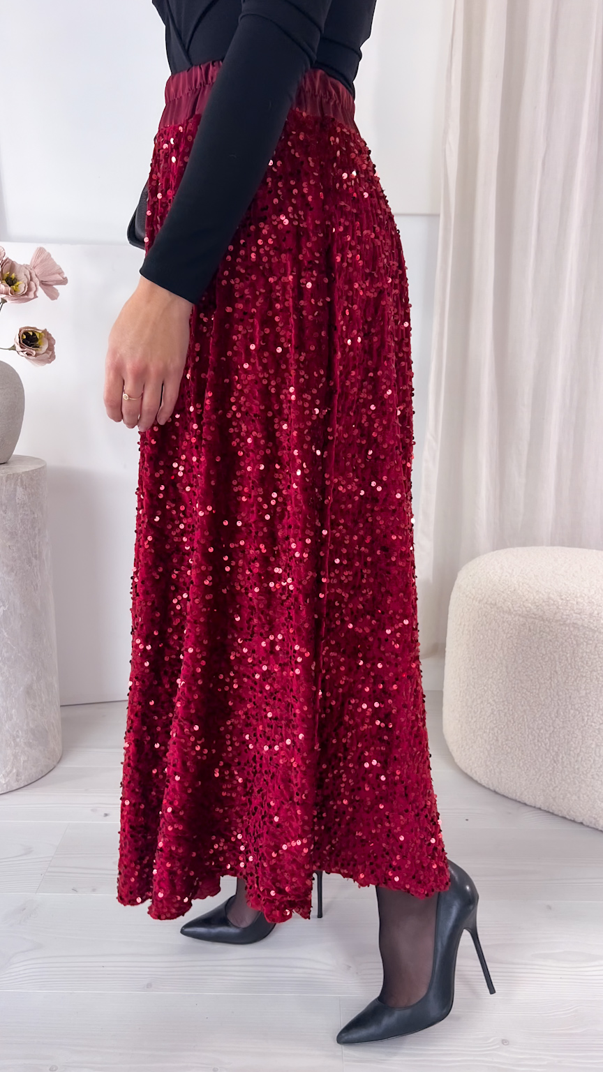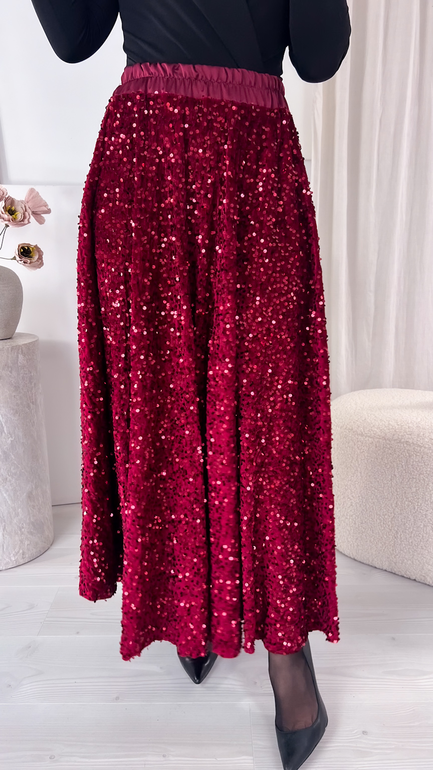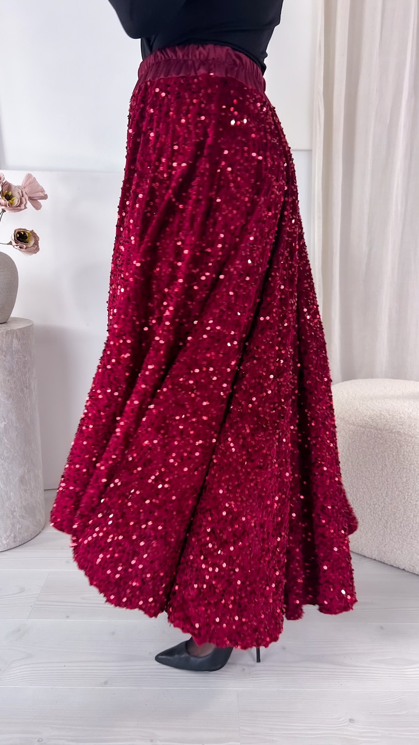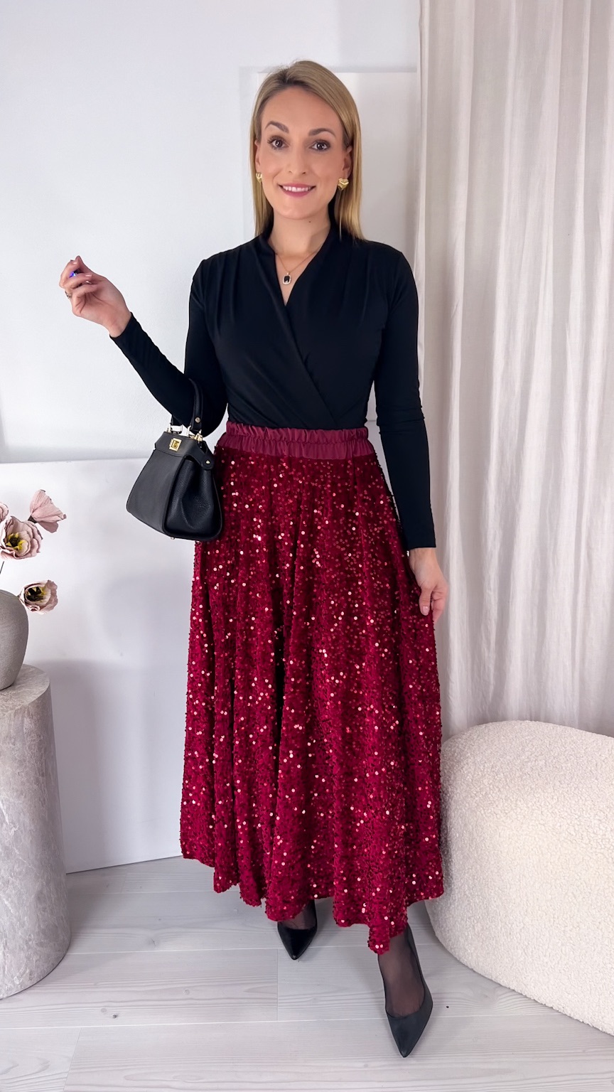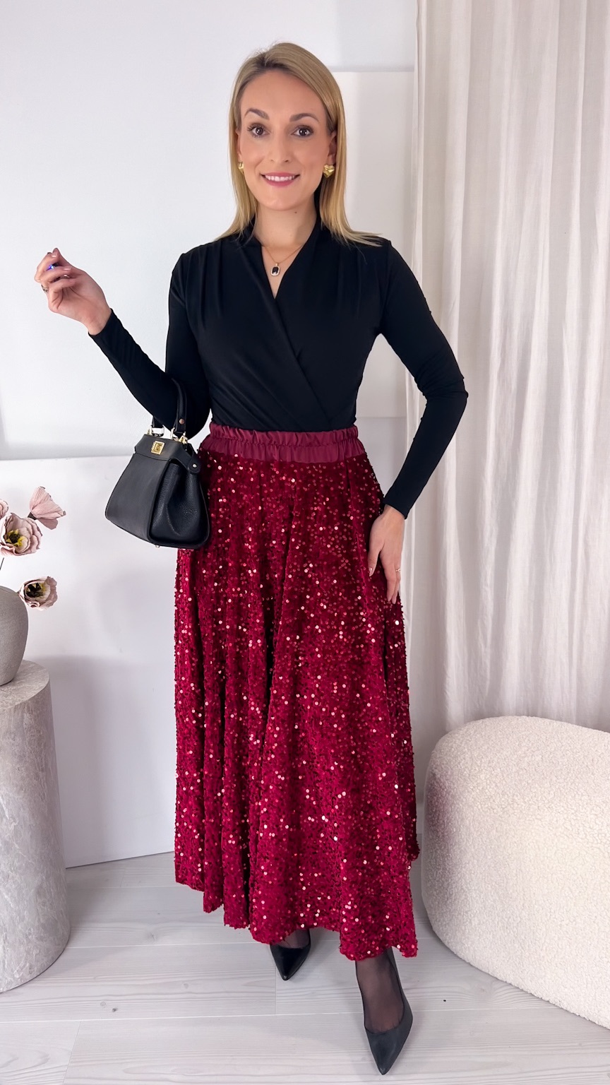 Zachwycająca spódnica maxi z połyskujących cekinów to idealny wybór na wyjątkowe okazje, gdy chcesz błyszczeć przy każdym kroku. Szyta z koła, pięknie układa się na sylwetce i efektownie pracuje podczas chodzenia oraz tańca, tworząc spektakularny, pełen lekkości ruch. Cekiny cudownie odbijają światło, przyciągając spojrzenia i dodając stylizacji wieczorowego blasku.