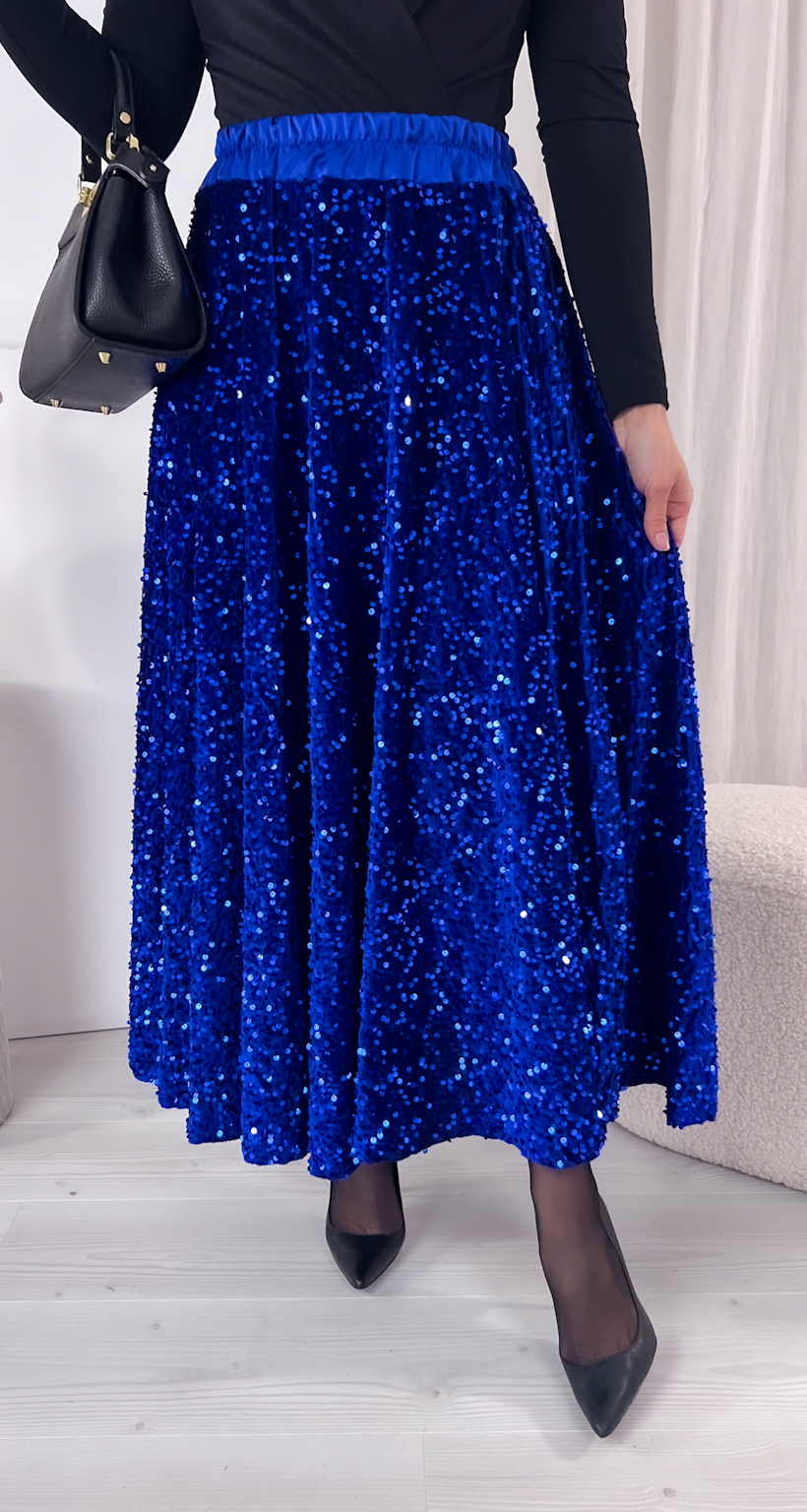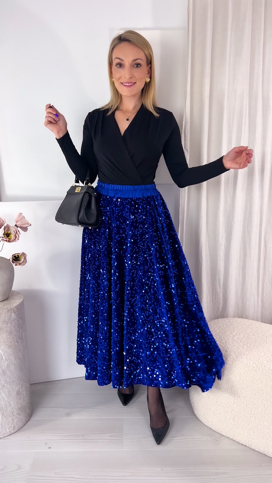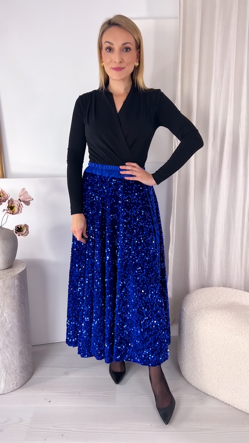 Zachwycająca spódnica maxi z połyskujących cekinów to idealny wybór na wyjątkowe okazje, gdy chcesz błyszczeć przy każdym kroku. Szyta z koła, pięknie układa się na sylwetce i efektownie pracuje podczas chodzenia oraz tańca, tworząc spektakularny, pełen lekkości ruch. Cekiny cudownie odbijają światło, przyciągając spojrzenia i dodając stylizacji wieczorowego blasku.