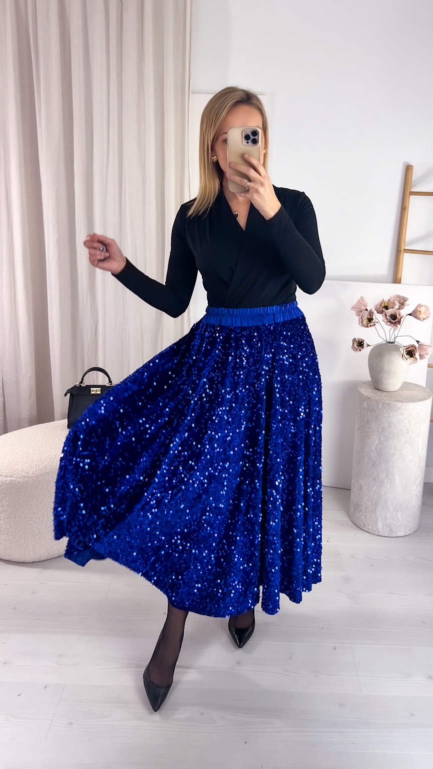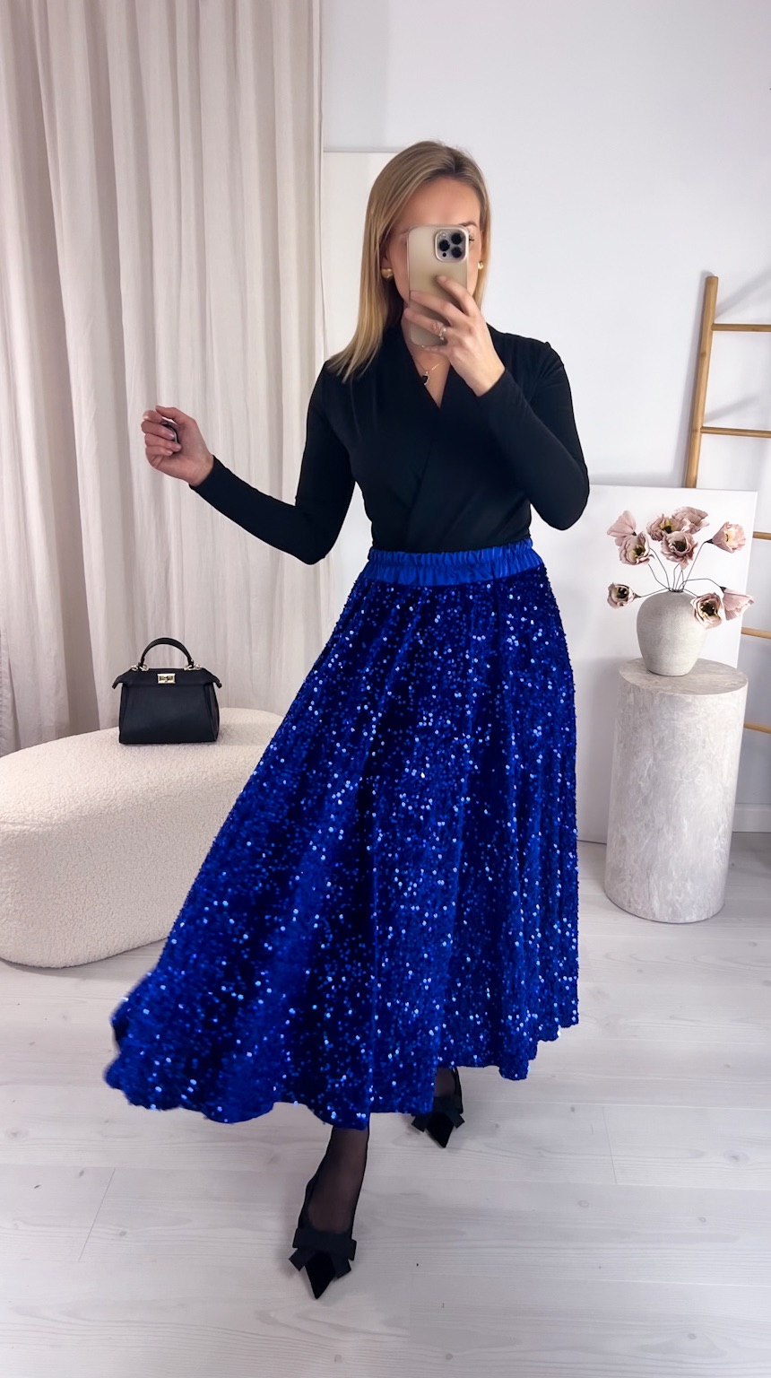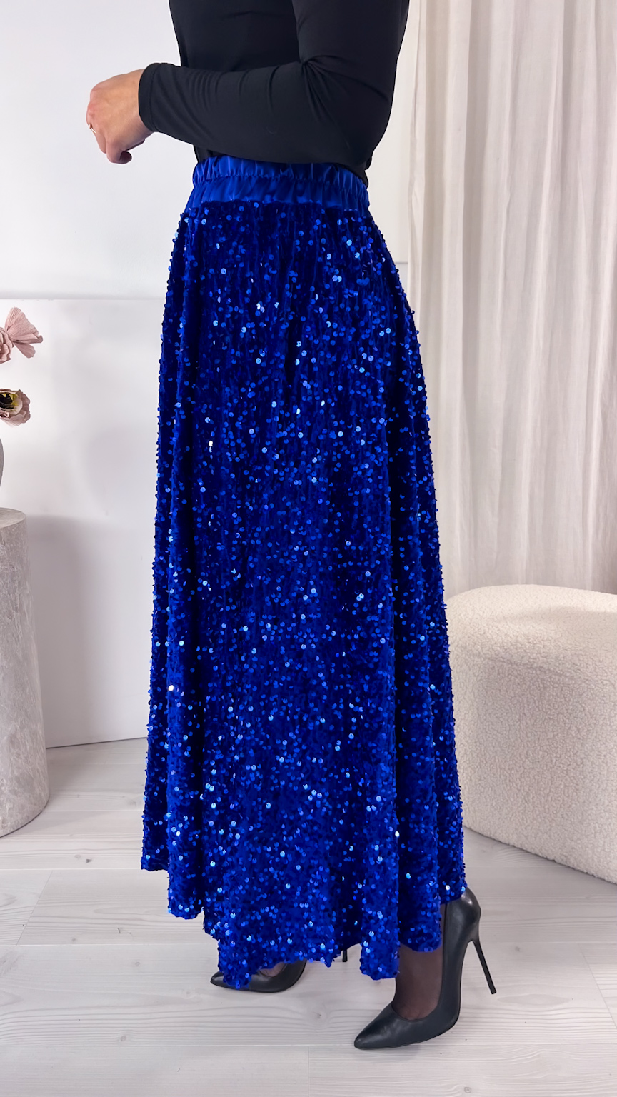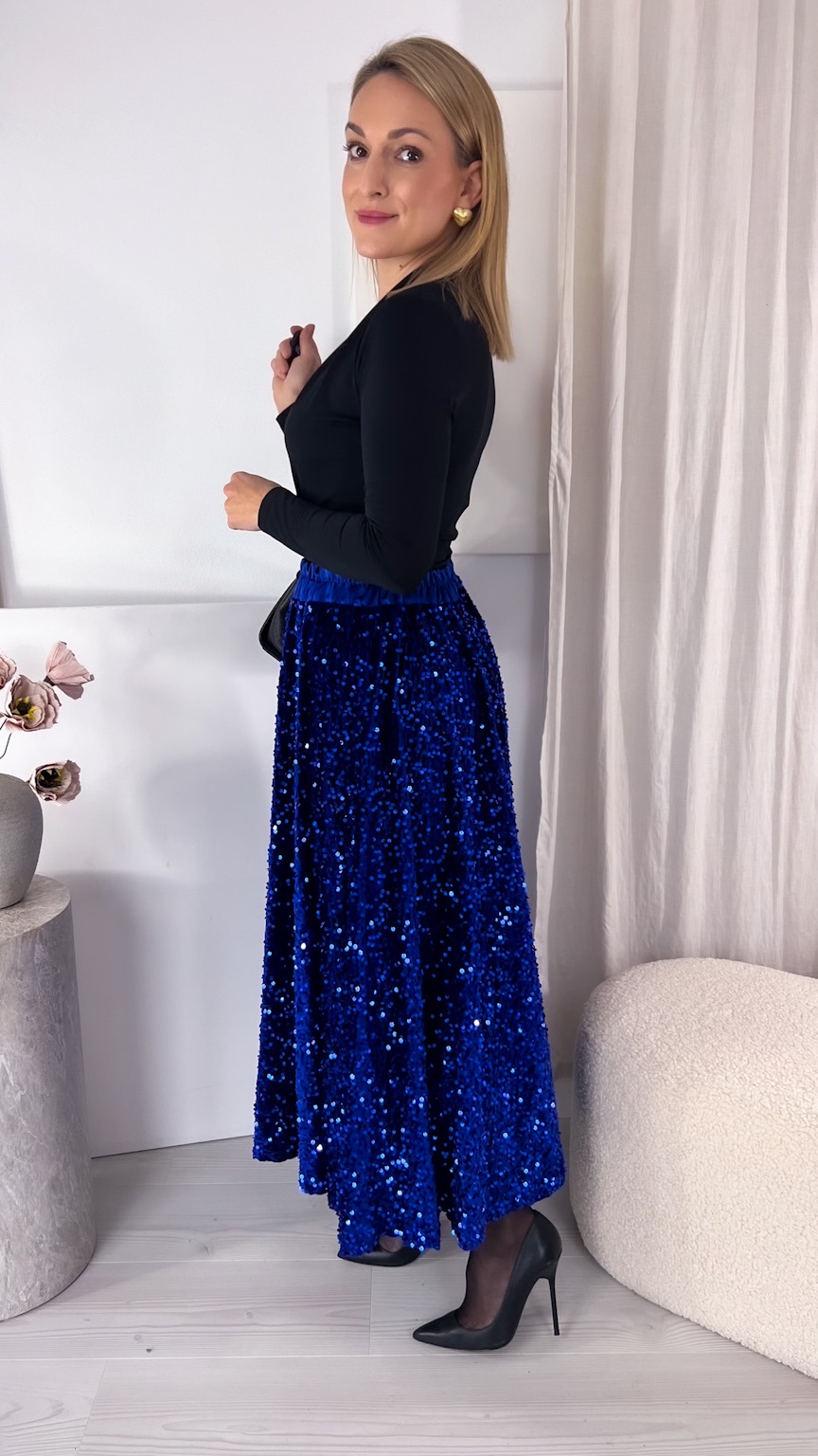 Zachwycająca spódnica maxi z połyskujących cekinów to idealny wybór na wyjątkowe okazje, gdy chcesz błyszczeć przy każdym kroku. Szyta z koła, pięknie układa się na sylwetce i efektownie pracuje podczas chodzenia oraz tańca, tworząc spektakularny, pełen lekkości ruch. Cekiny cudownie odbijają światło, przyciągając spojrzenia i dodając stylizacji wieczorowego blasku.