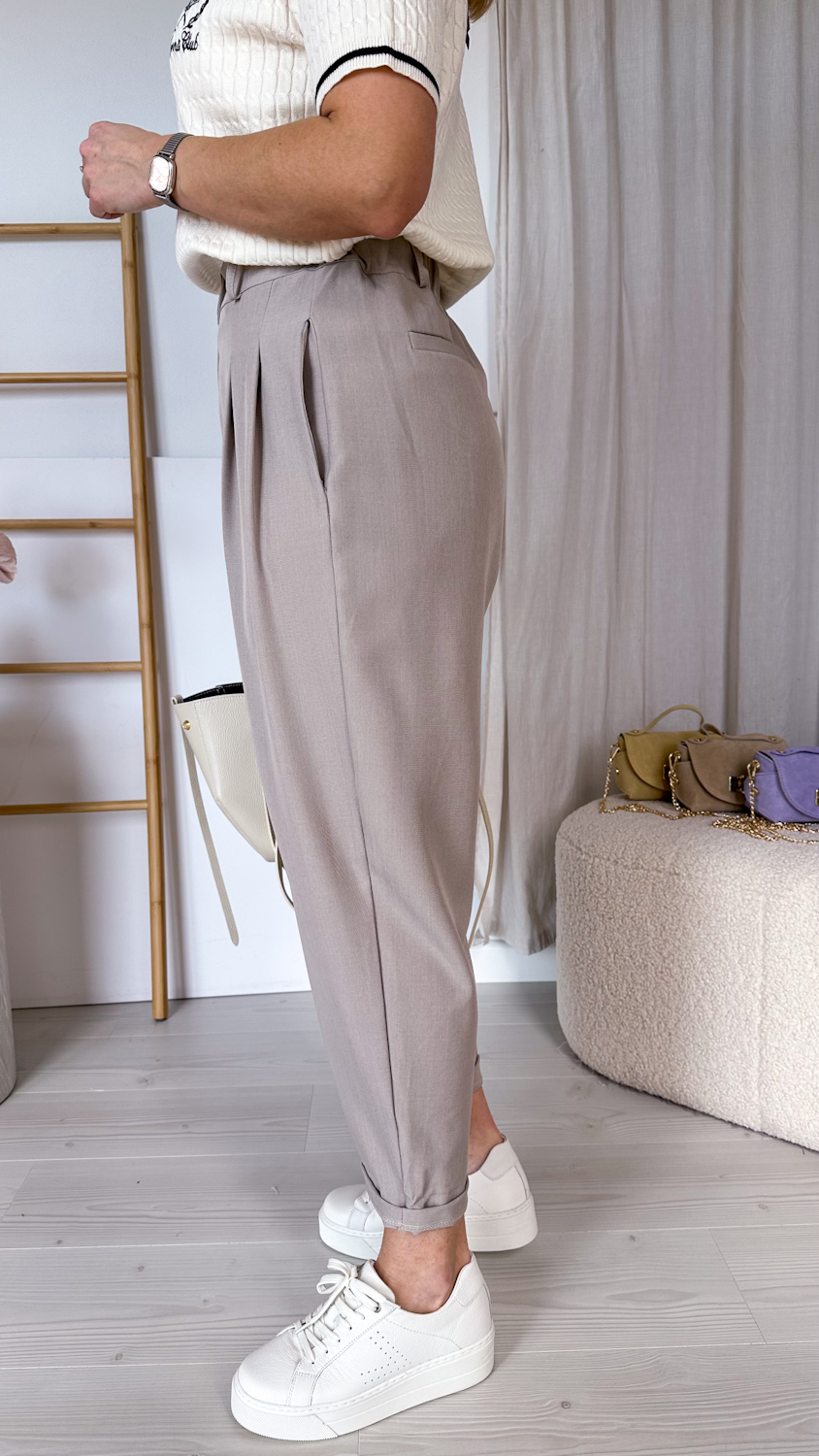 Stylowe spodnie o modnym kroju balonowym, z luźniejszą nogawką subtelnie zwężaną ku dołowi. Model z wysokim stanem pięknie podkreśla talię, a wszyta z tyłu elastyczna gumka w odcinku lędźwiowym zapewnia wygodę noszenia i lepsze dopasowanie do sylwetki.