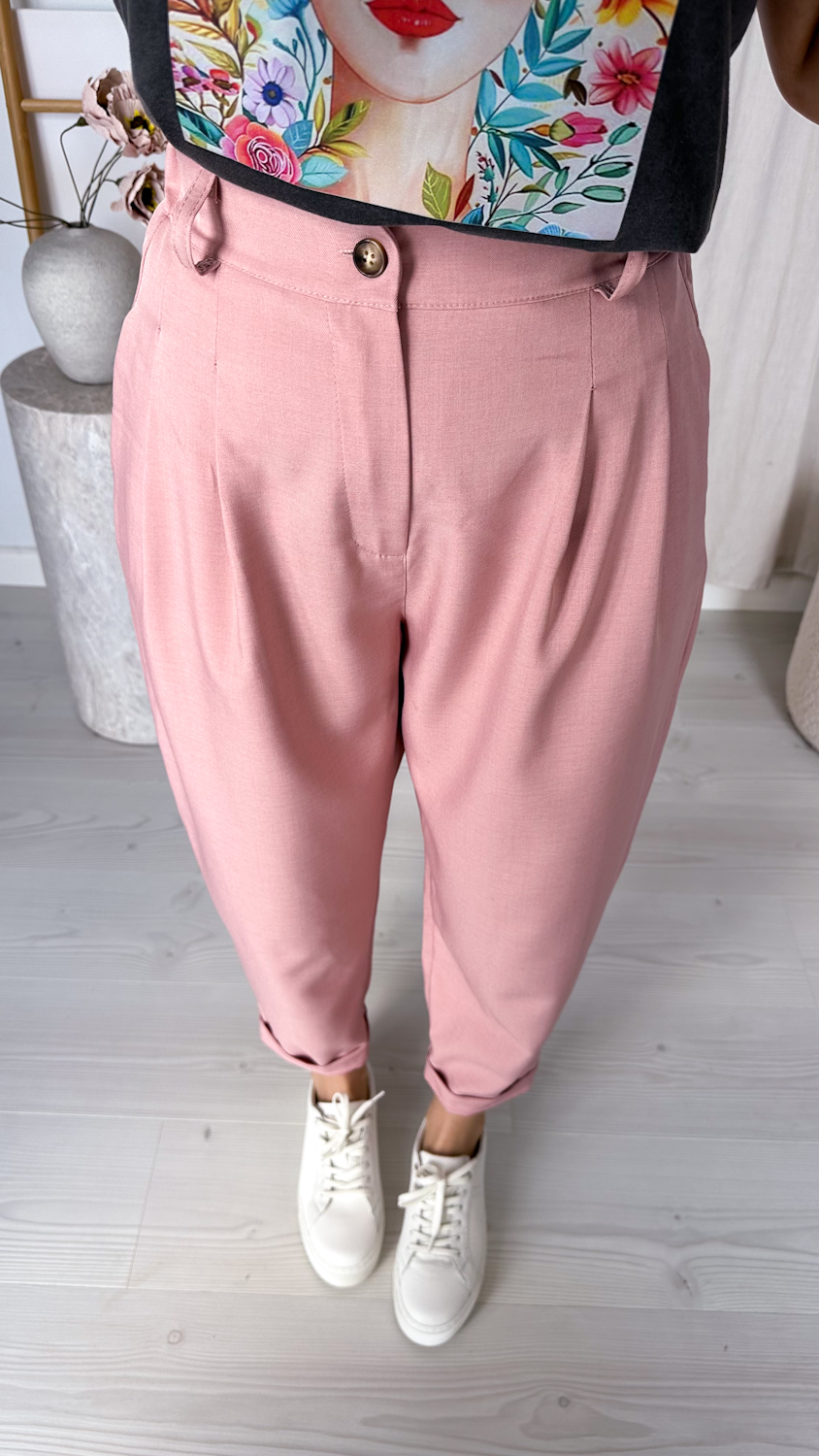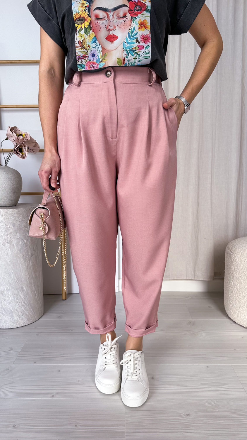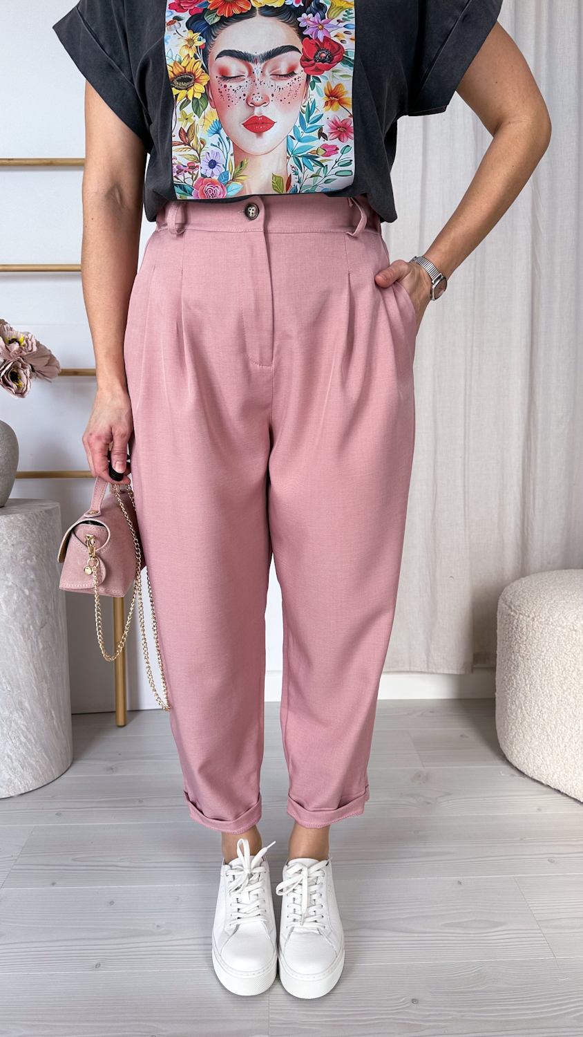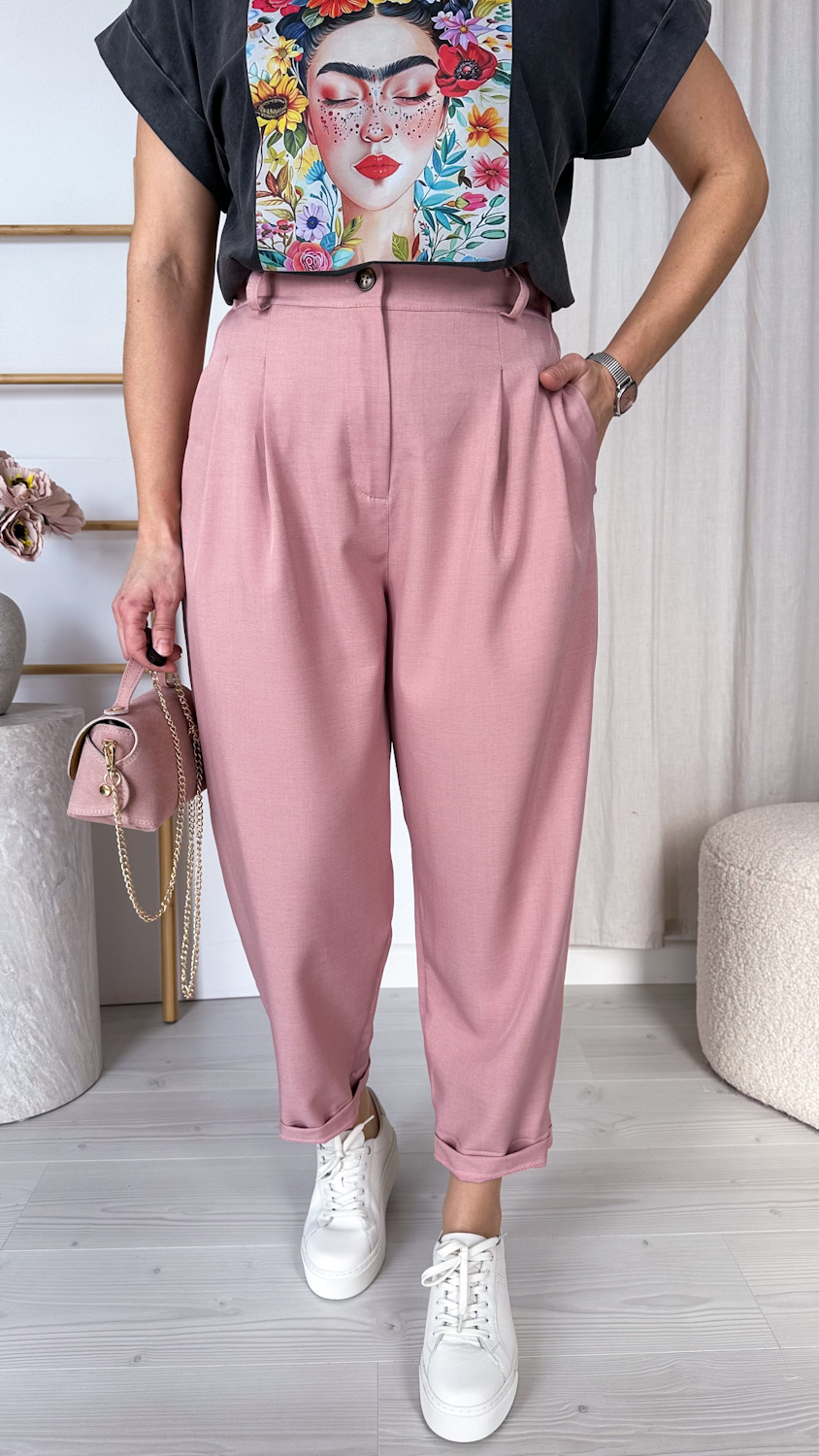 Stylowe spodnie o modnym kroju balonowym, z luźniejszą nogawką subtelnie zwężaną ku dołowi. Model z wysokim stanem pięknie podkreśla talię, a wszyta z tyłu elastyczna gumka w odcinku lędźwiowym zapewnia wygodę noszenia i lepsze dopasowanie do sylwetki.