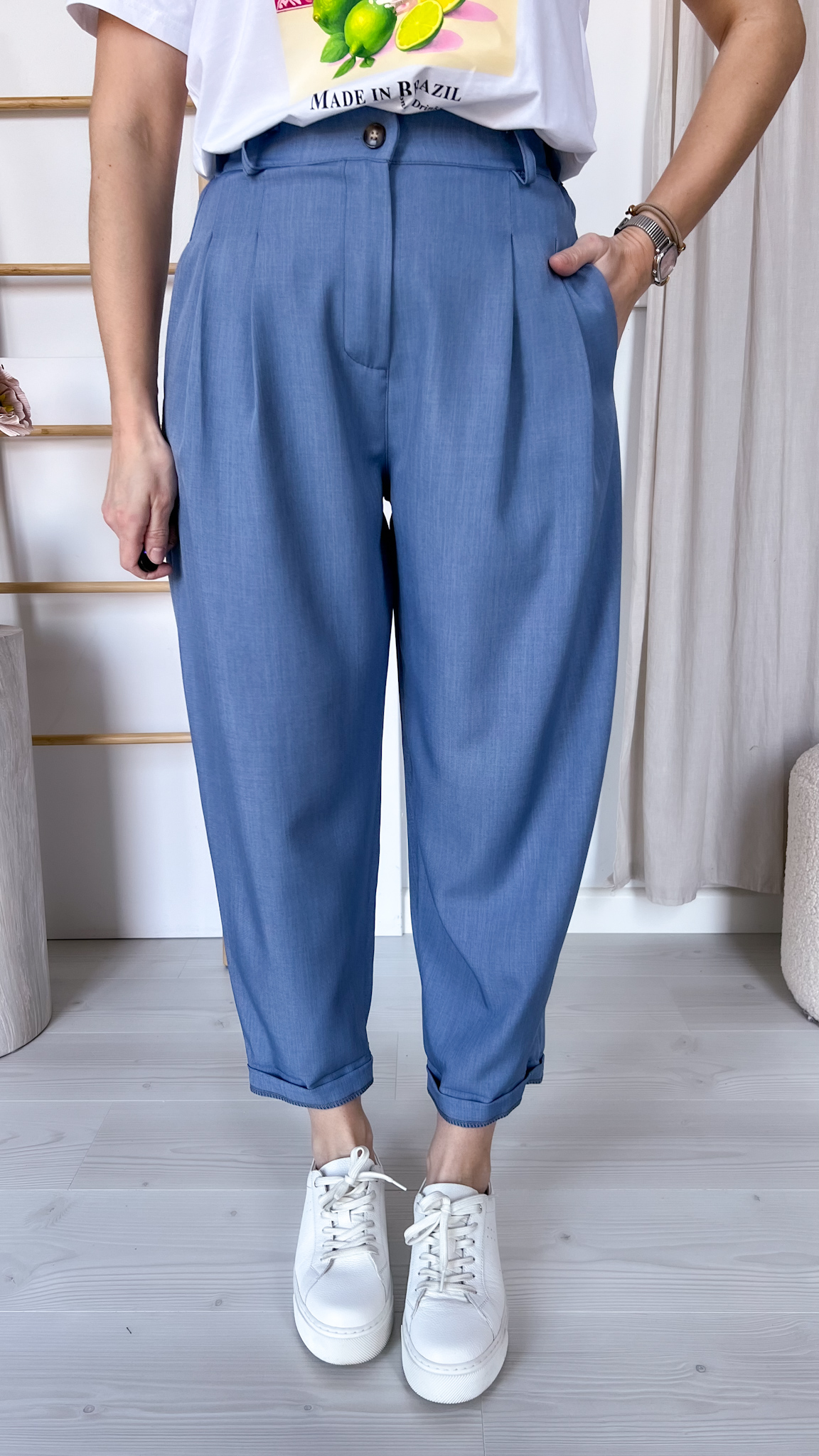 Stylowe spodnie o modnym kroju balonowym, z luźniejszą nogawką subtelnie zwężaną ku dołowi. Model z wysokim stanem pięknie podkreśla talię, a wszyta z tyłu elastyczna gumka w odcinku lędźwiowym zapewnia wygodę noszenia i lepsze dopasowanie do sylwetki.