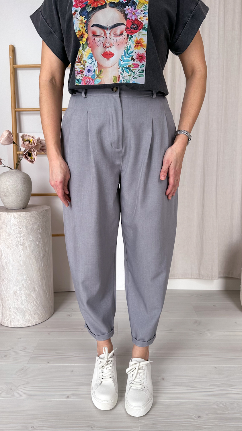 Stylowe spodnie o modnym kroju balonowym, z luźniejszą nogawką subtelnie zwężaną ku dołowi. Model z wysokim stanem pięknie podkreśla talię, a wszyta z tyłu elastyczna gumka w odcinku lędźwiowym zapewnia wygodę noszenia i lepsze dopasowanie do sylwetki.