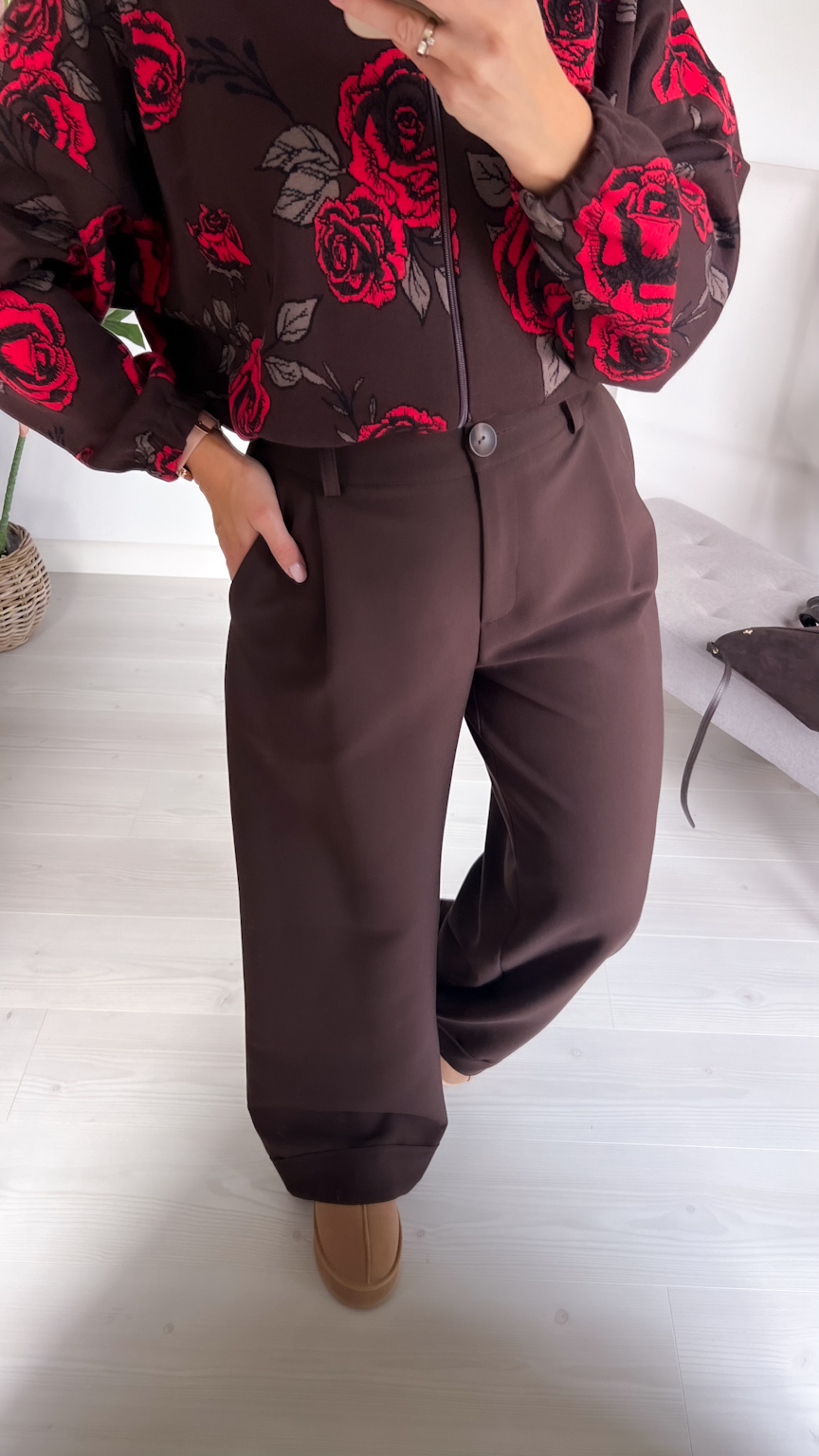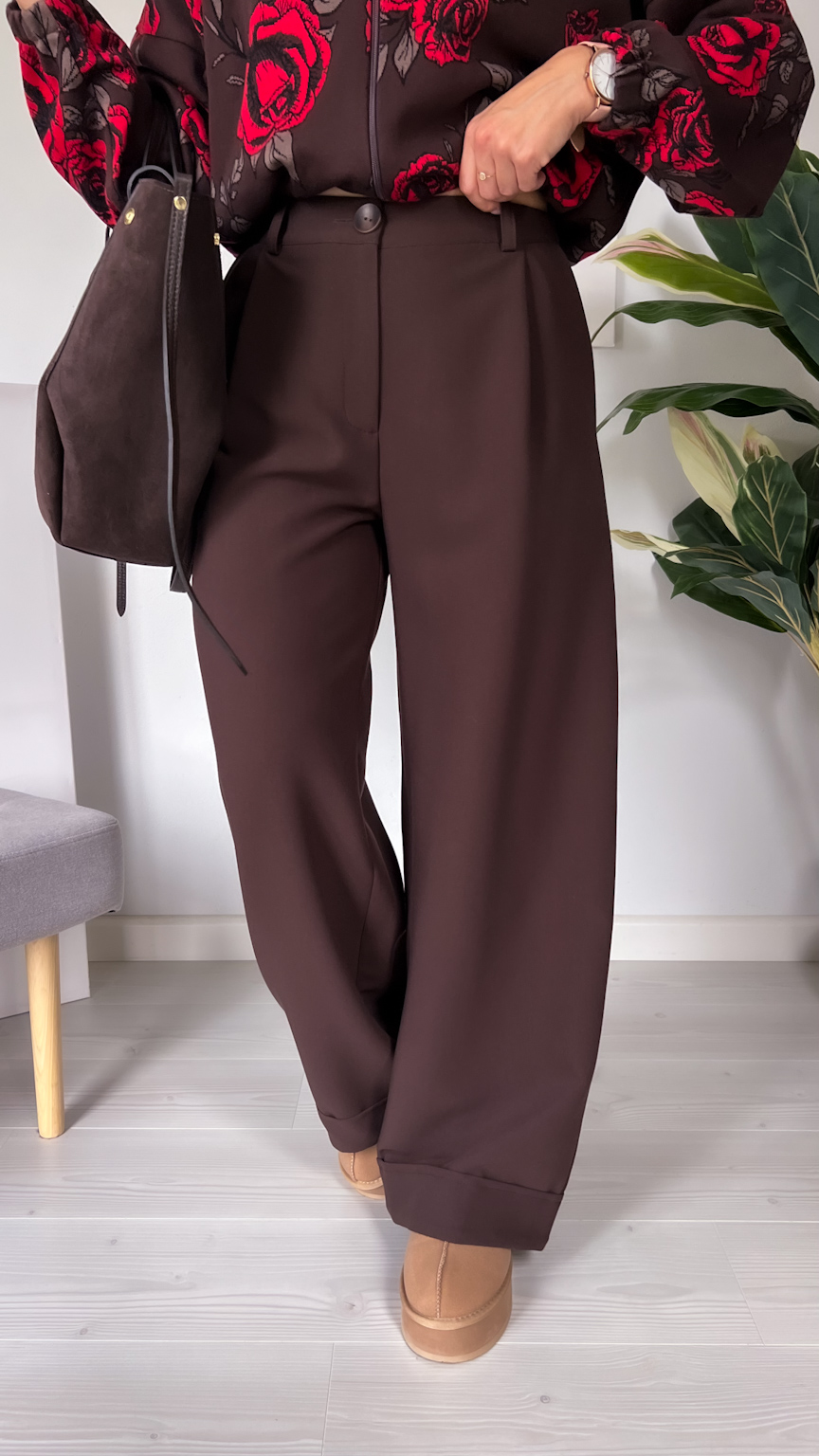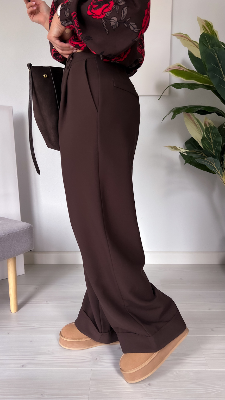 Czekoladowy odcień tkaniny jest niezwykle szlachetny i ponadczasowy – doskonale komponuje się z beżami, kremami, czernią i złotymi dodatkami. Spodnie świetnie wyglądają zarówno w zestawie z golfem czy koszulą, jak i z elegancką marynarką. To model, który sprawdzi się w biurze, na spotkaniu czy podczas jesiennych wyjść – zawsze z klasą.