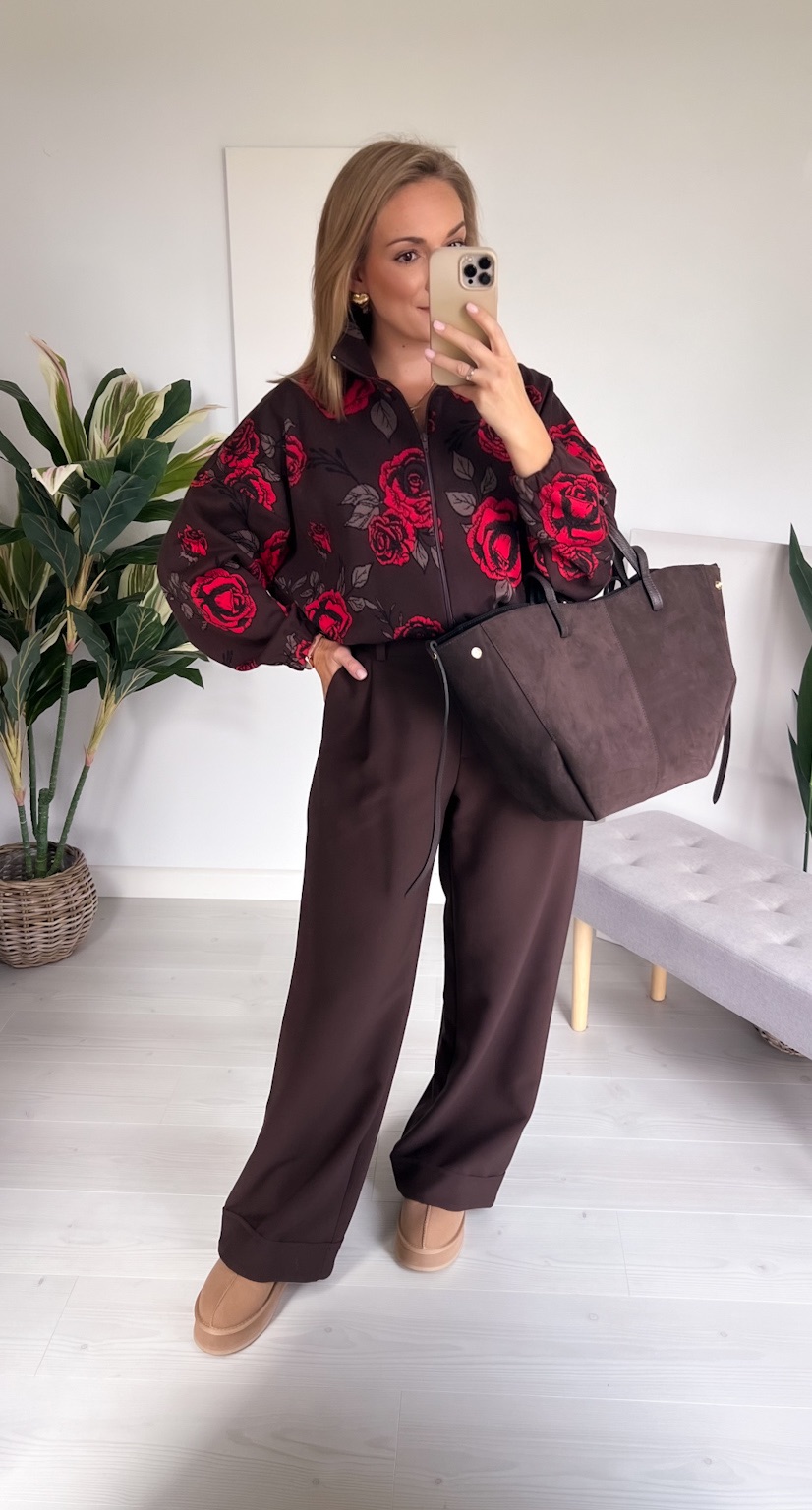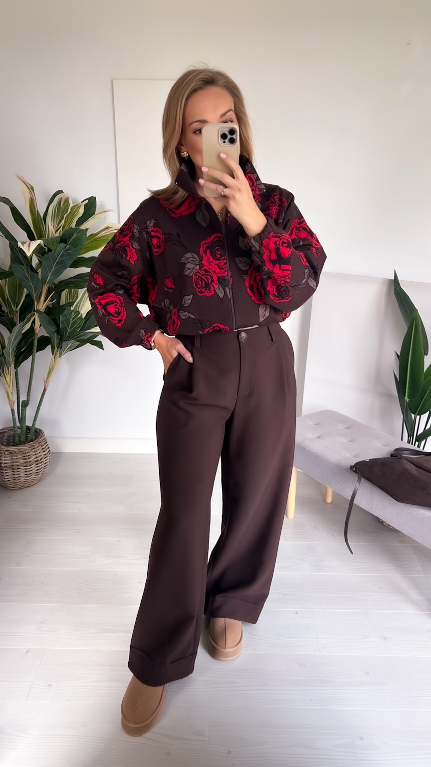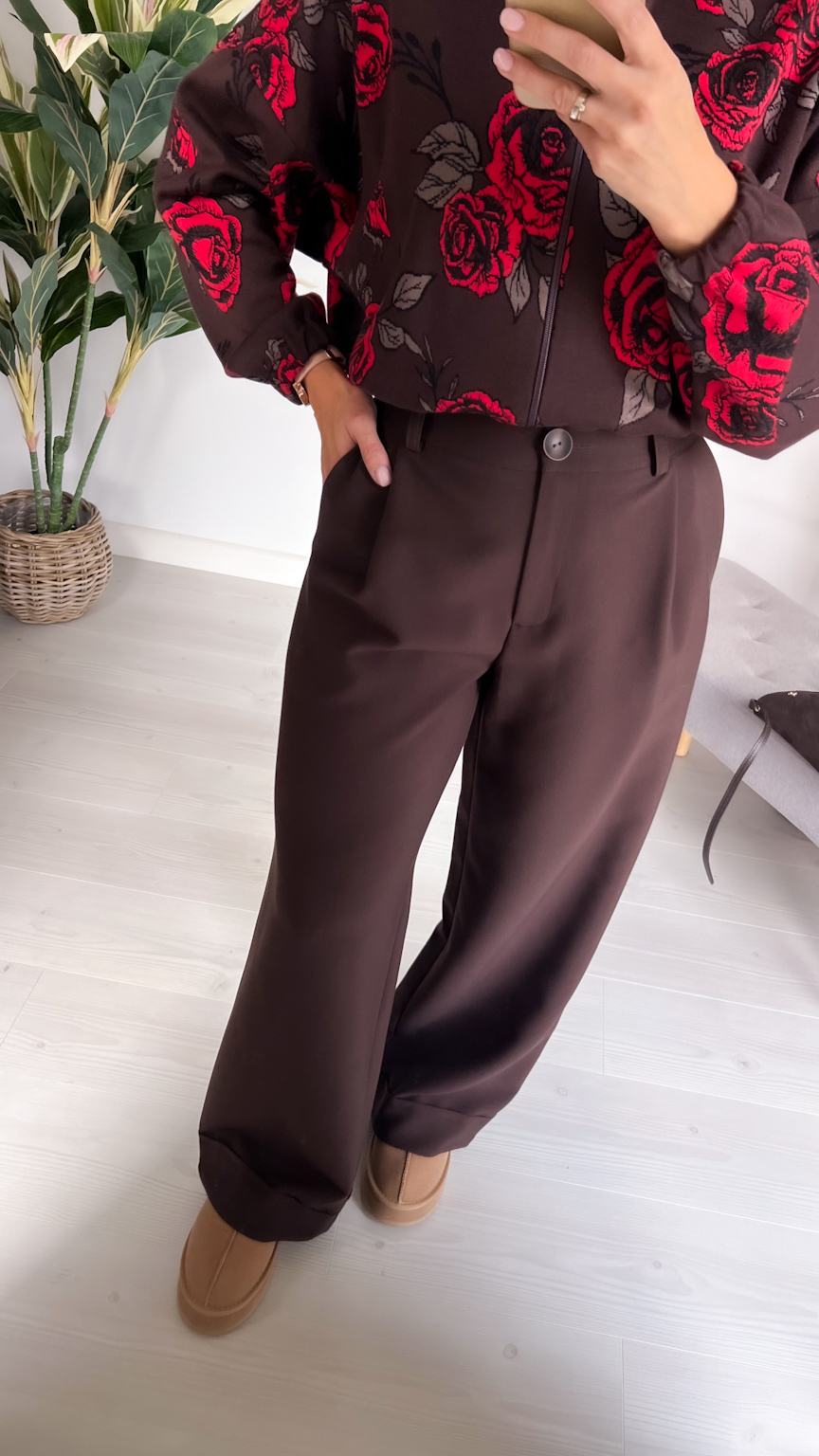 Czekoladowy odcień tkaniny jest niezwykle szlachetny i ponadczasowy – doskonale komponuje się z beżami, kremami, czernią i złotymi dodatkami. Spodnie świetnie wyglądają zarówno w zestawie z golfem czy koszulą, jak i z elegancką marynarką. To model, który sprawdzi się w biurze, na spotkaniu czy podczas jesiennych wyjść – zawsze z klasą.