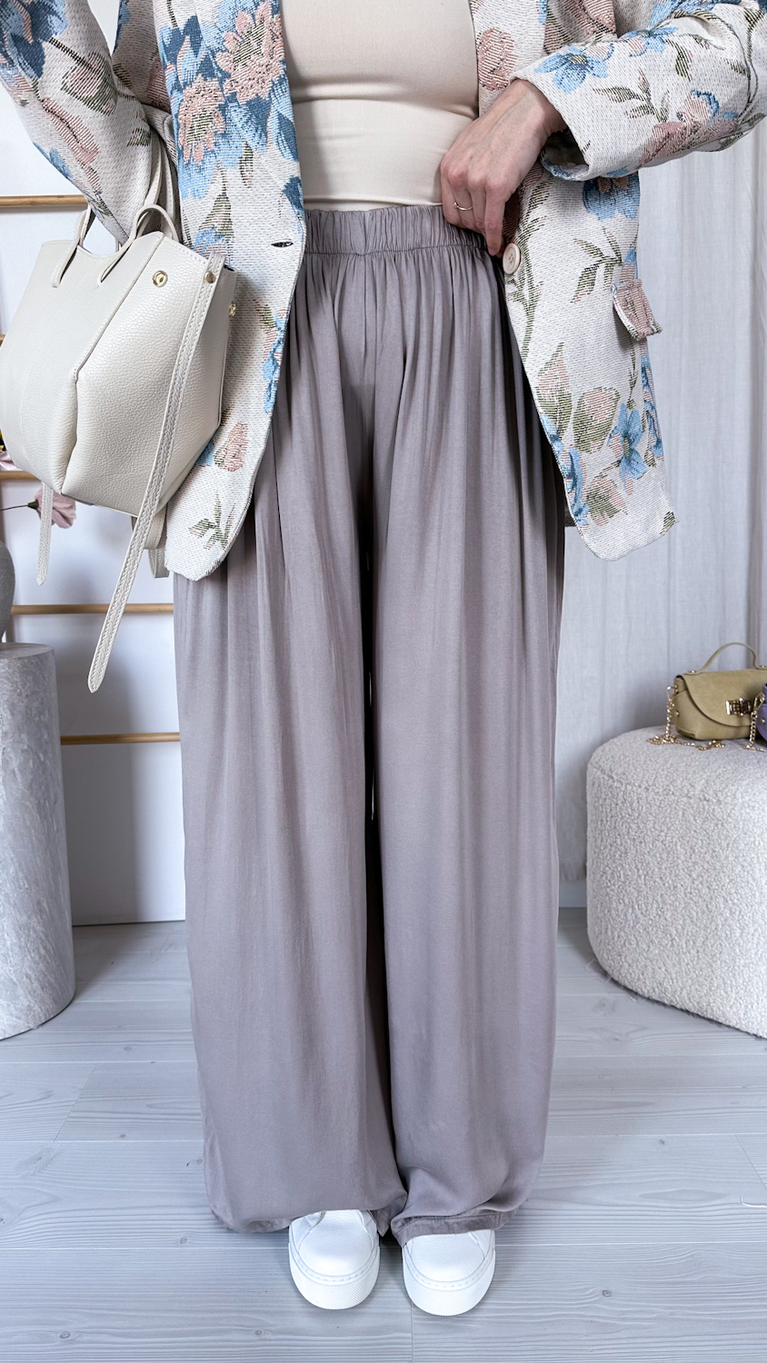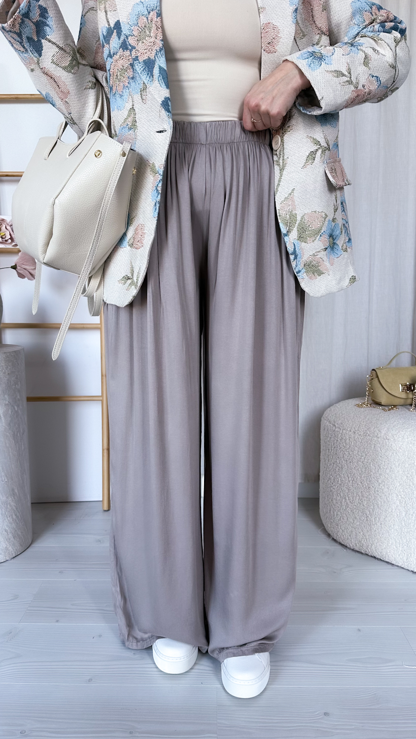 Model z szeroką nogawką i wygodną gumką w pasie to absolutny must-have tego sezonu. Niezwykle uniwersalne — dzięki elastycznemu pasowi świetnie dopasowują się do sylwetki i pasują na rozmiary od S do XL.