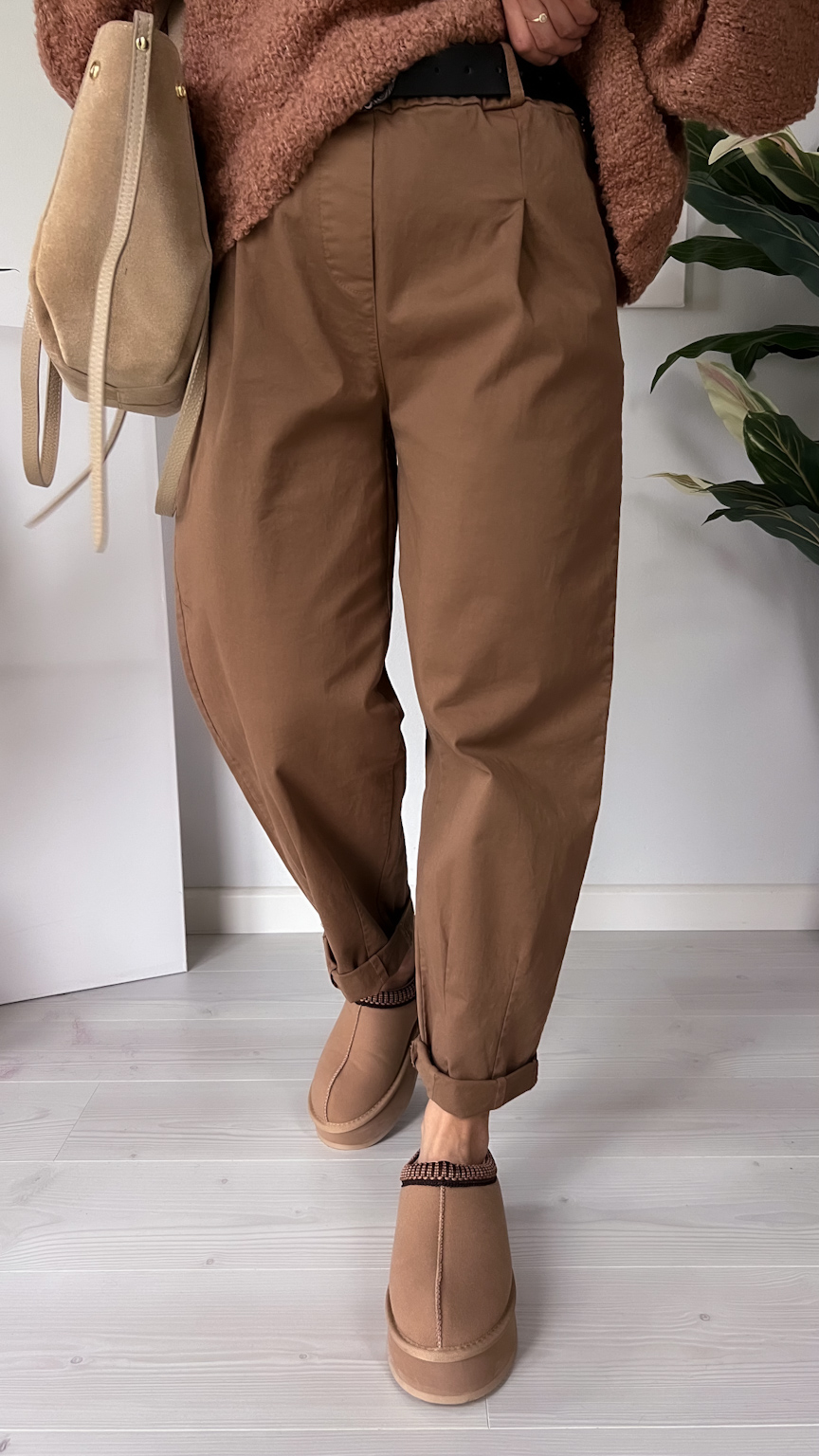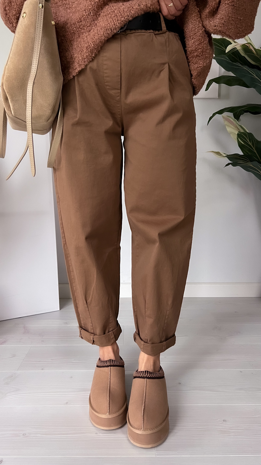 Postaw na modę w najlepszym wydaniu! Spodnie typu balon to absolutny must-have tego sezonu. Model z zakładkami przy pasie i dołączonym paskiem pięknie podkreśla talię, a szersze biodra nadają sylwetce ultrakobiece proporcje. Zwężane nogawki z przeszyciami dodają charakteru i sprawiają, że spodnie wyglądają wyjątkowo stylowo.