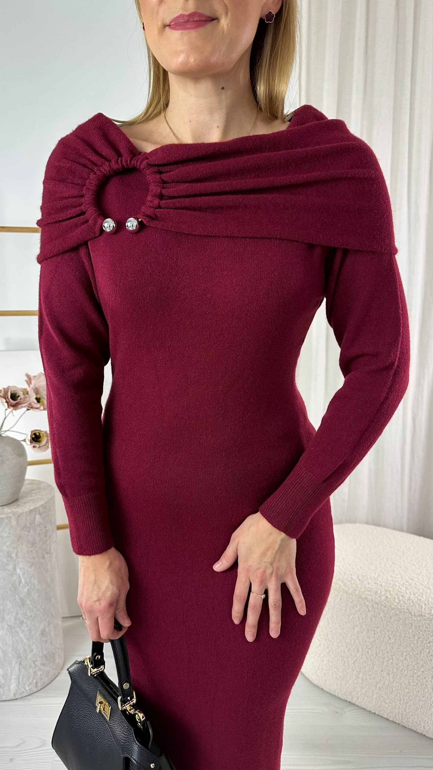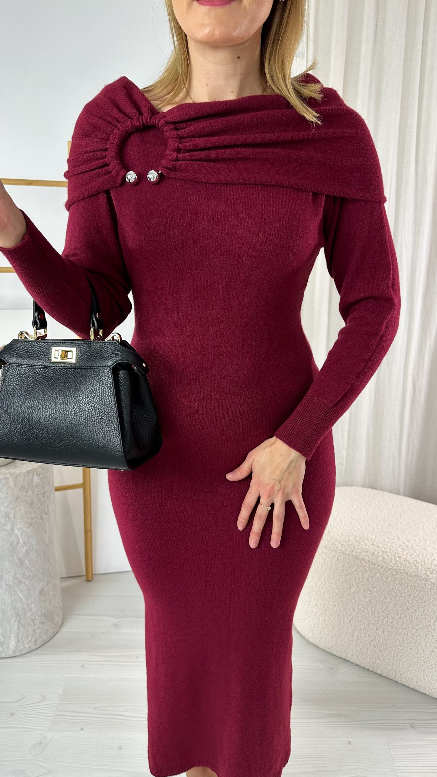 Ta dzianinowa sukienka do połowy łydki to połączenie wygody i wyrafinowanego stylu. Jej pięknie wyprofilowany kołnierz, ozdobiony subtelnym metalowym akcentem, przyciąga uwagę i dodaje całości eleganckiego charakteru. To detal, który delikatnie rozświetla twarz i czyni sukienkę wyjątkową.