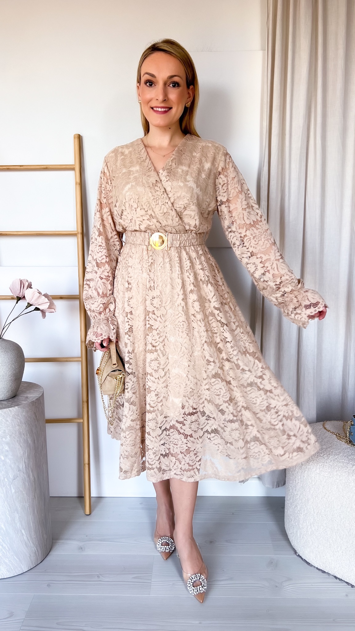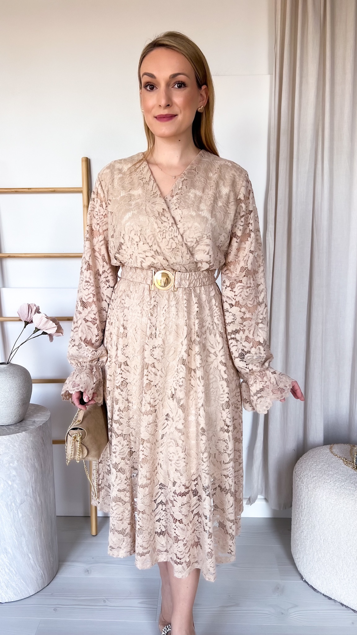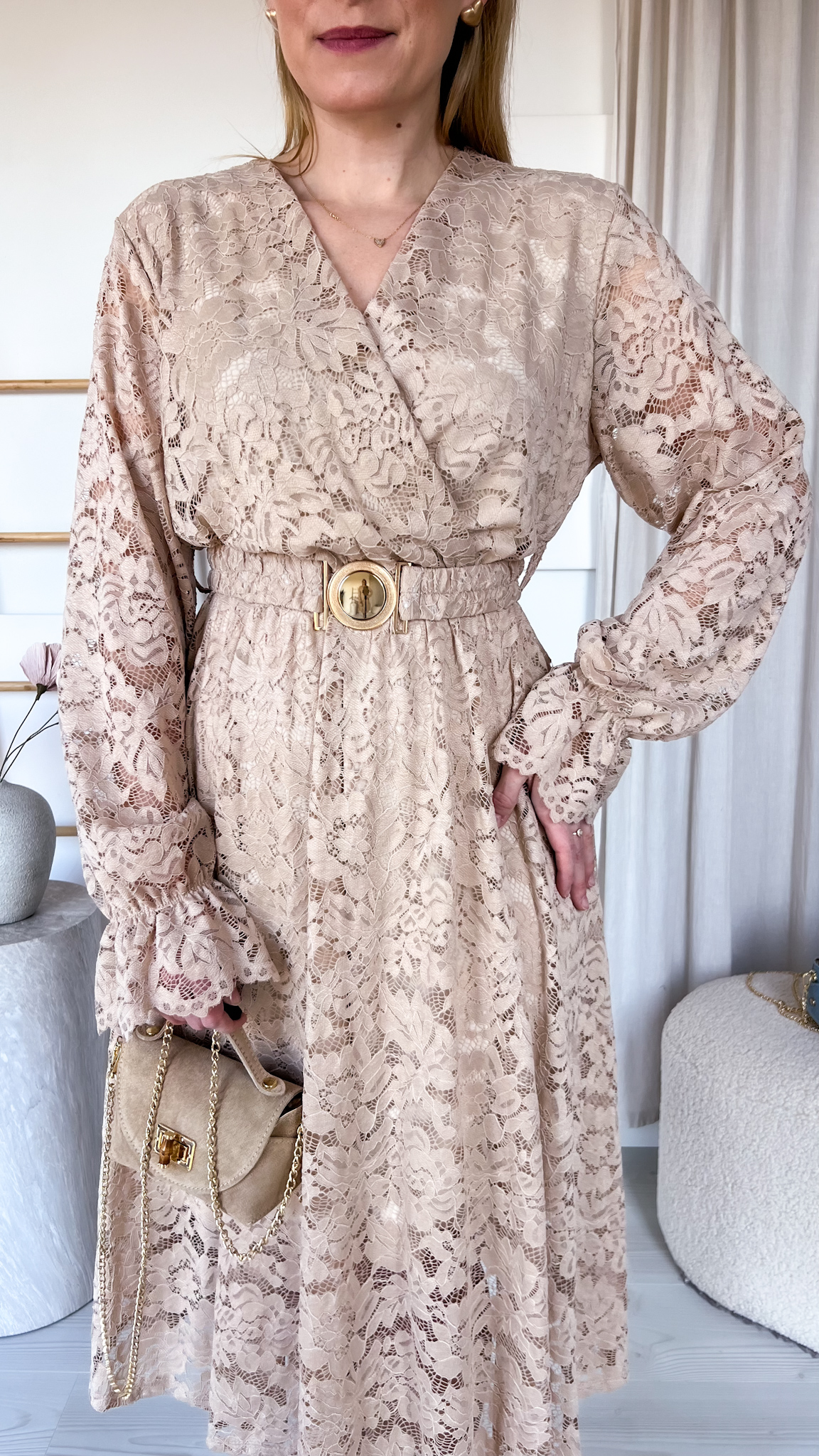 W zestawie znajduje się pasek ze złotą klamrą, który podkreśla talię i dodaje stylizacji eleganckiego wykończenia.