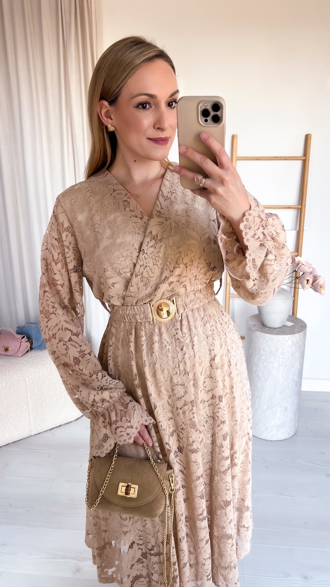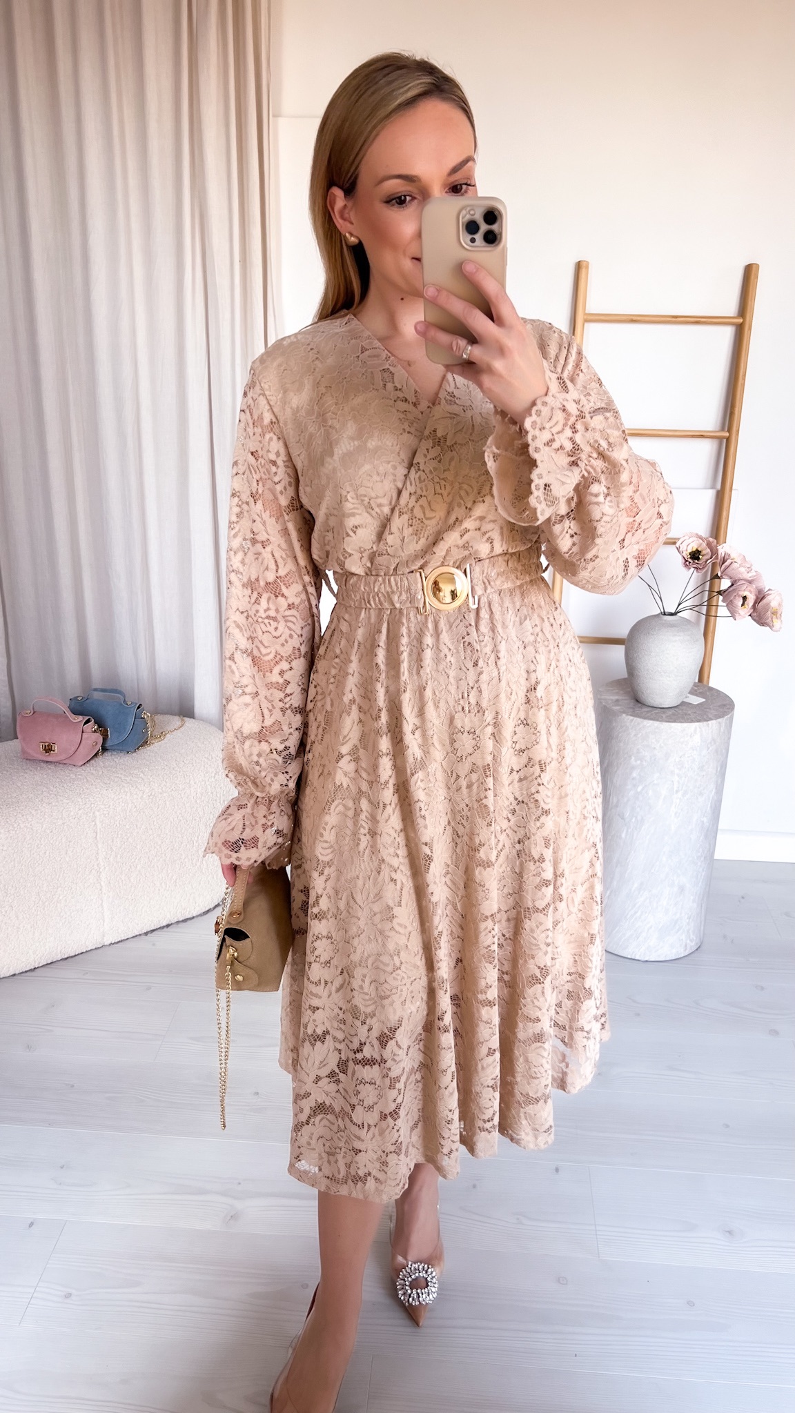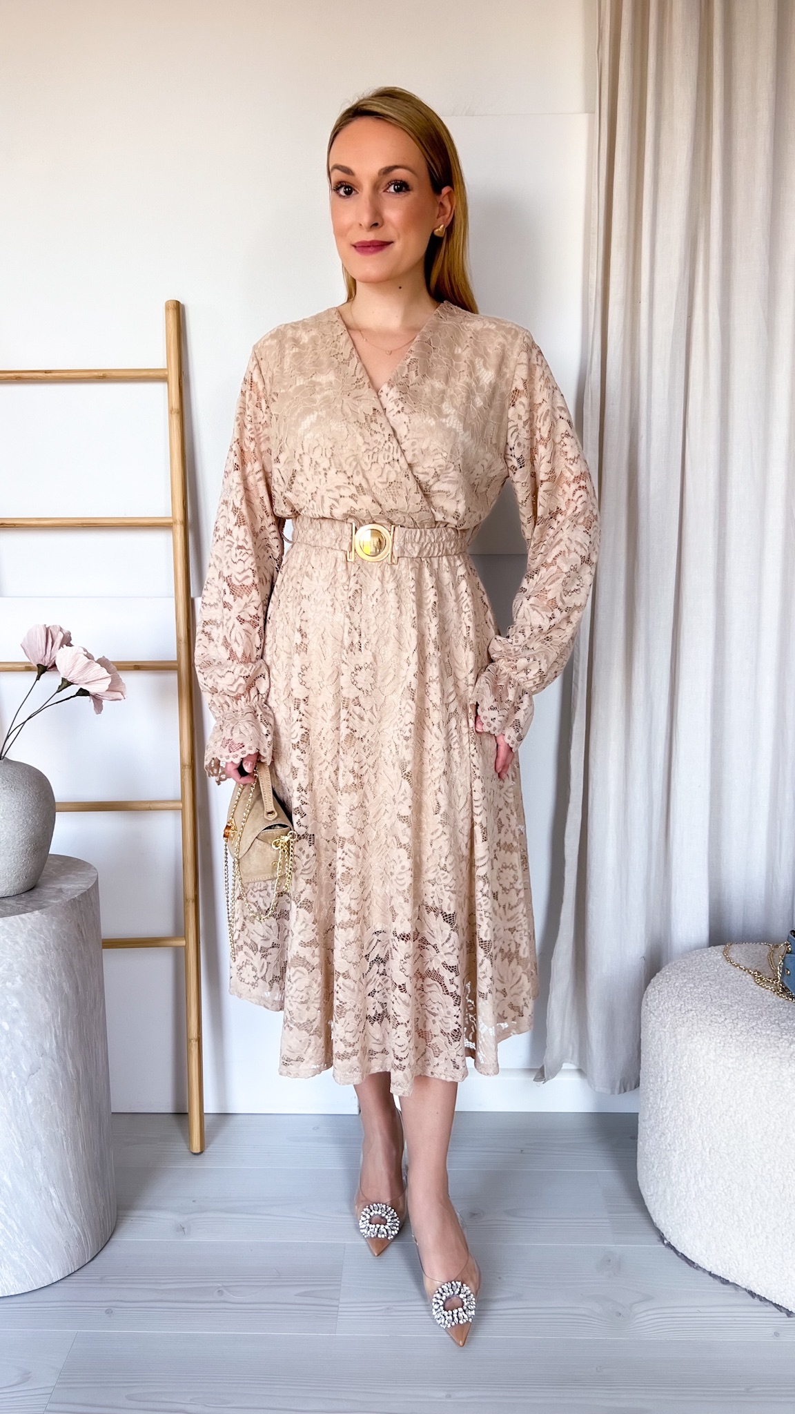 W zestawie znajduje się pasek ze złotą klamrą, który podkreśla talię i dodaje stylizacji eleganckiego wykończenia.