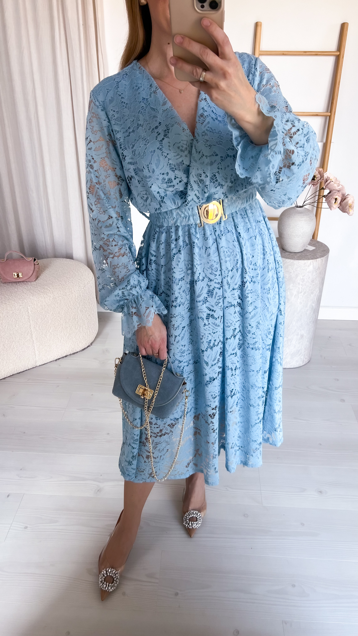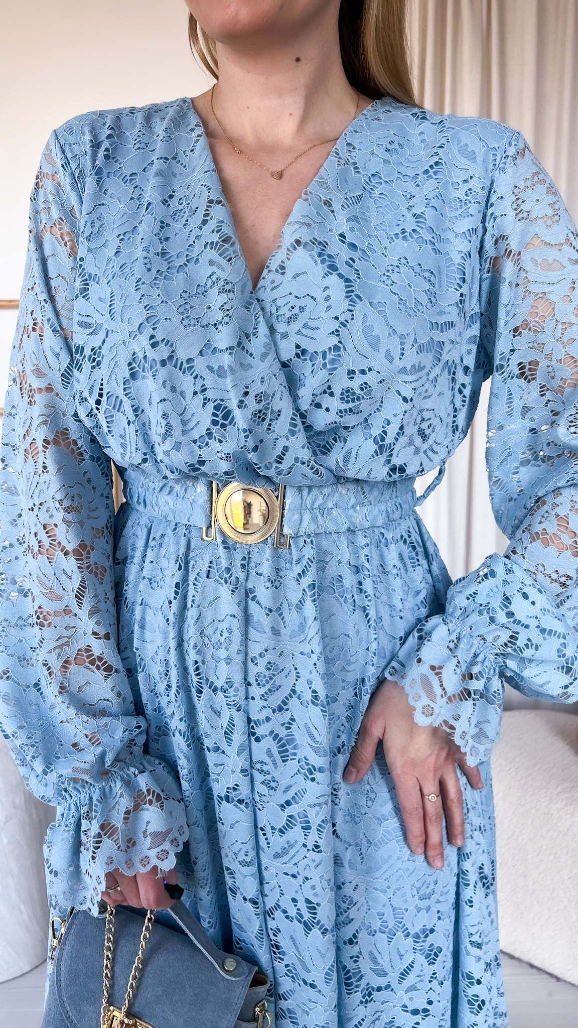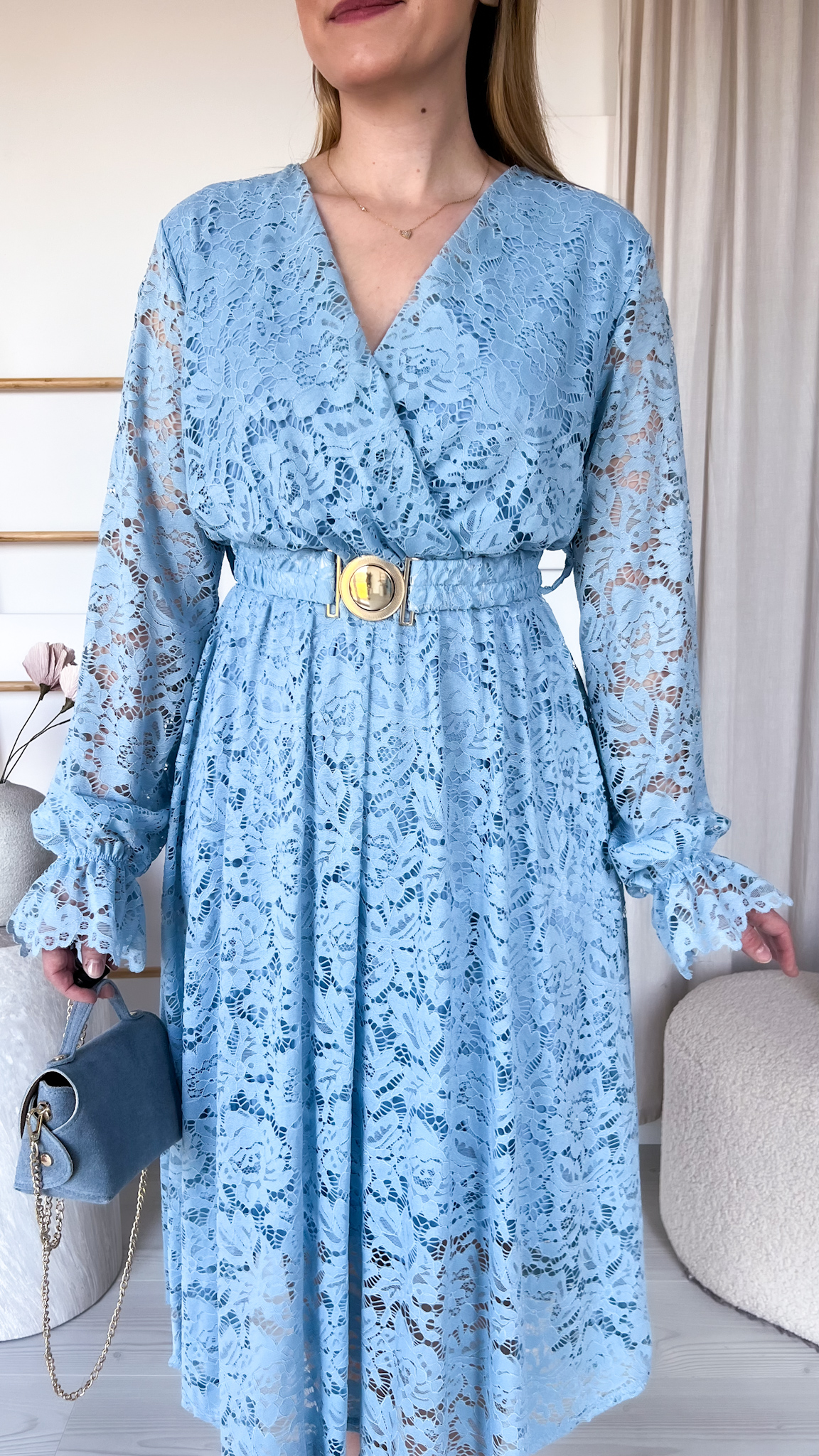 W zestawie znajduje się pasek ze złotą klamrą, który podkreśla talię i dodaje stylizacji eleganckiego wykończenia.