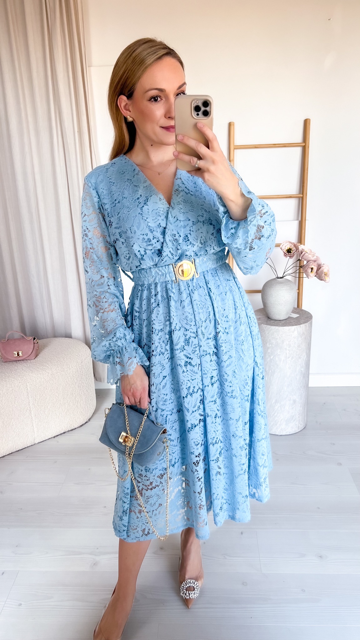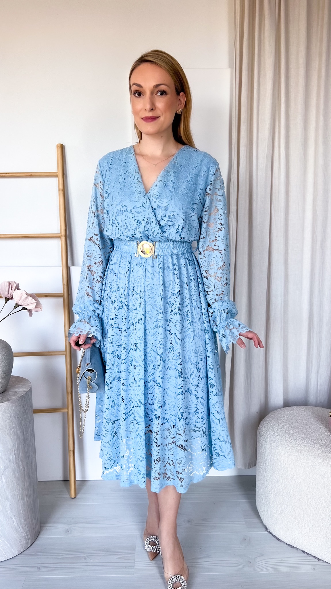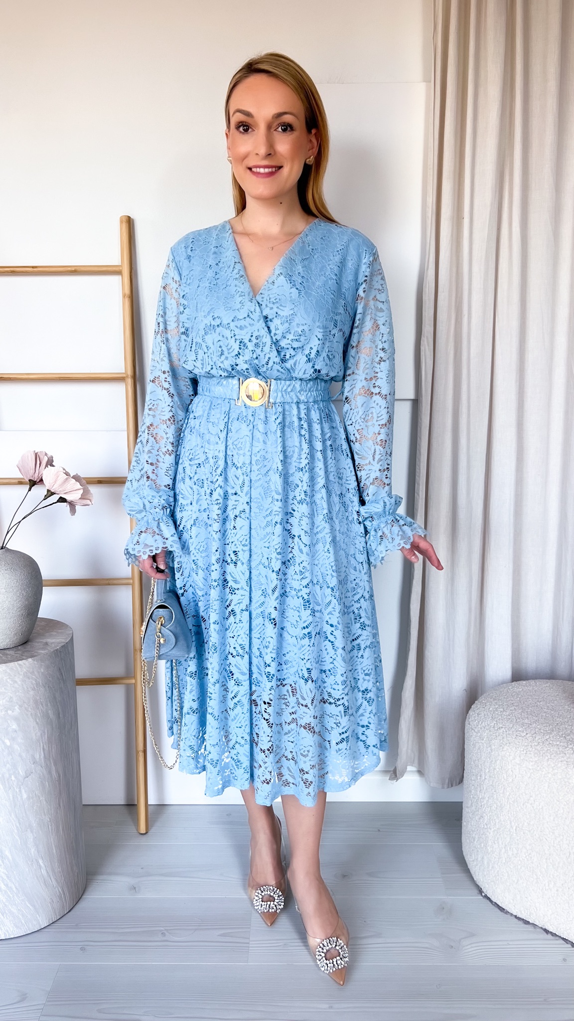W zestawie znajduje się pasek ze złotą klamrą, który podkreśla talię i dodaje stylizacji eleganckiego wykończenia.