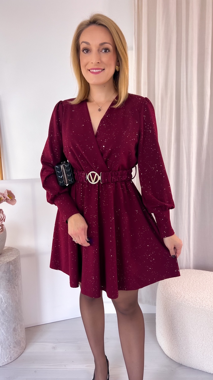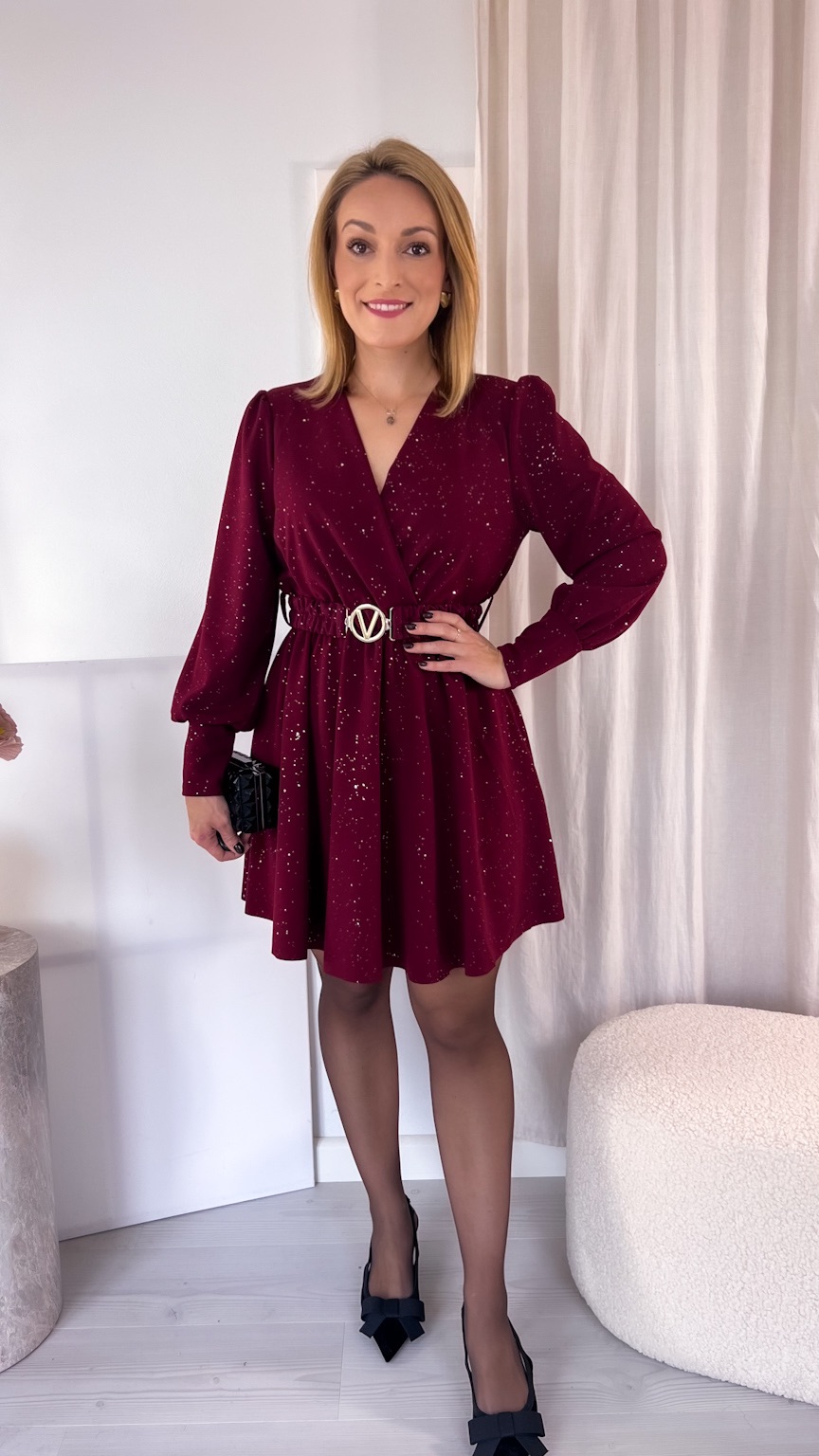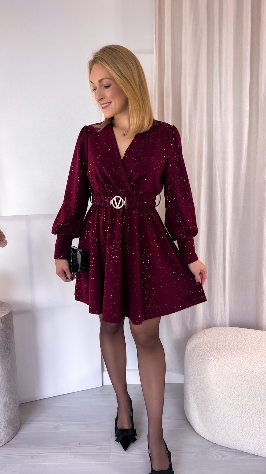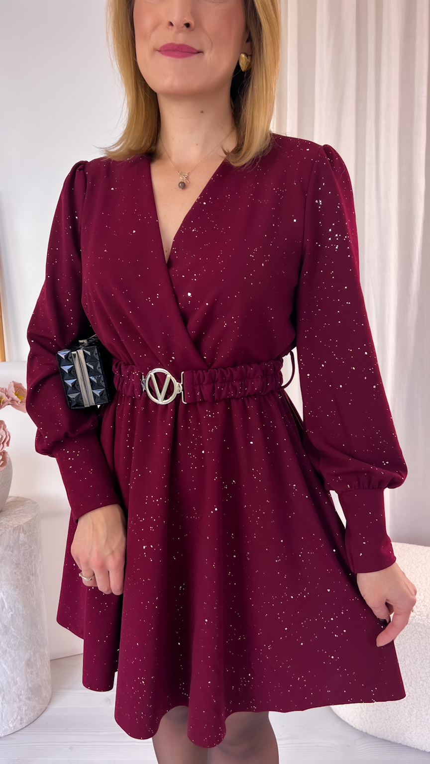 Kopertowy dekolt subtelnie eksponuje dekolt i dodaje całości wyjątkowego charakteru. Uszyta z tkaniny mieniącej się srebrnymi drobinkami, przyciąga spojrzenia i sprawia, że każda stylizacja nabiera wyjątkowego, wieczorowego blasku.