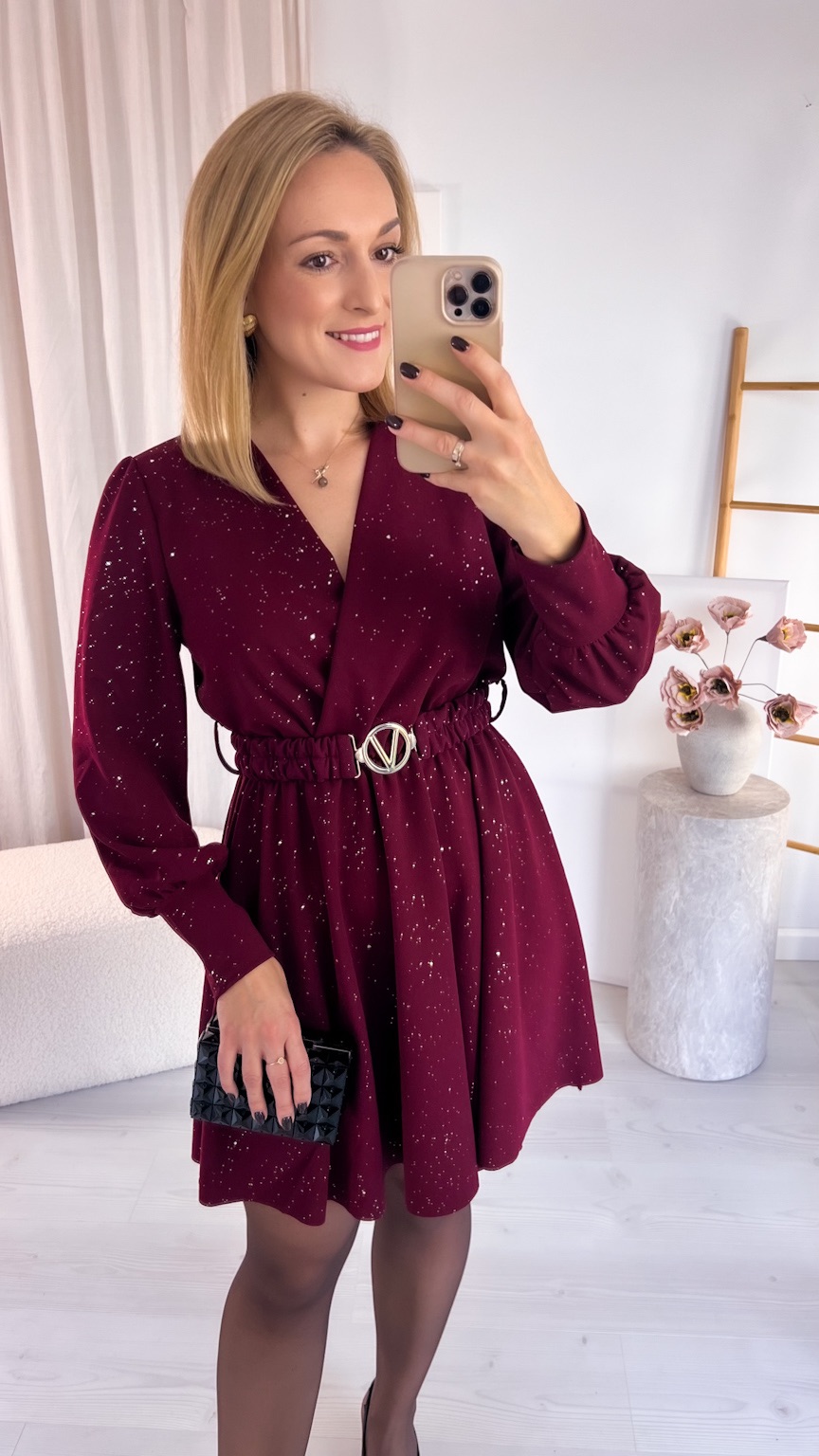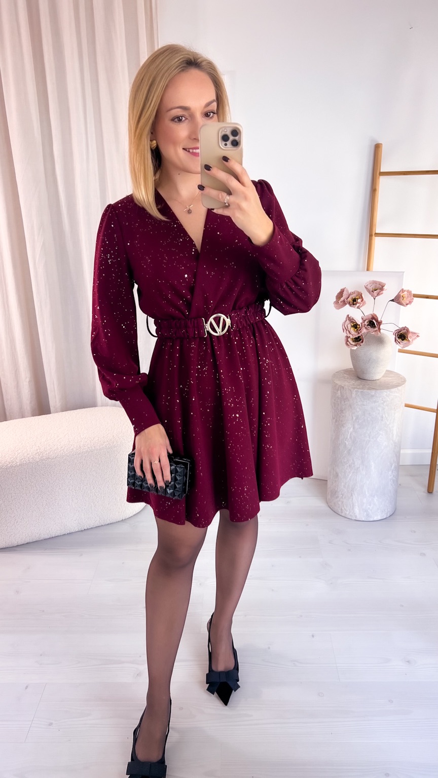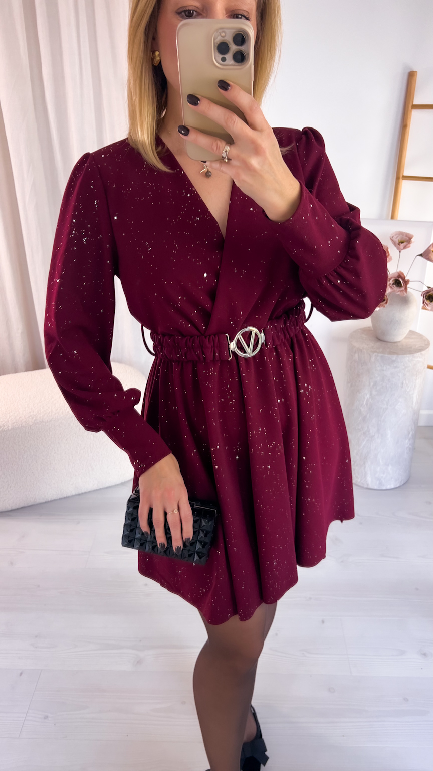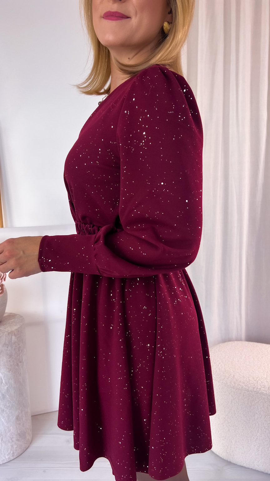 Kopertowy dekolt subtelnie eksponuje dekolt i dodaje całości wyjątkowego charakteru. Uszyta z tkaniny mieniącej się srebrnymi drobinkami, przyciąga spojrzenia i sprawia, że każda stylizacja nabiera wyjątkowego, wieczorowego blasku.