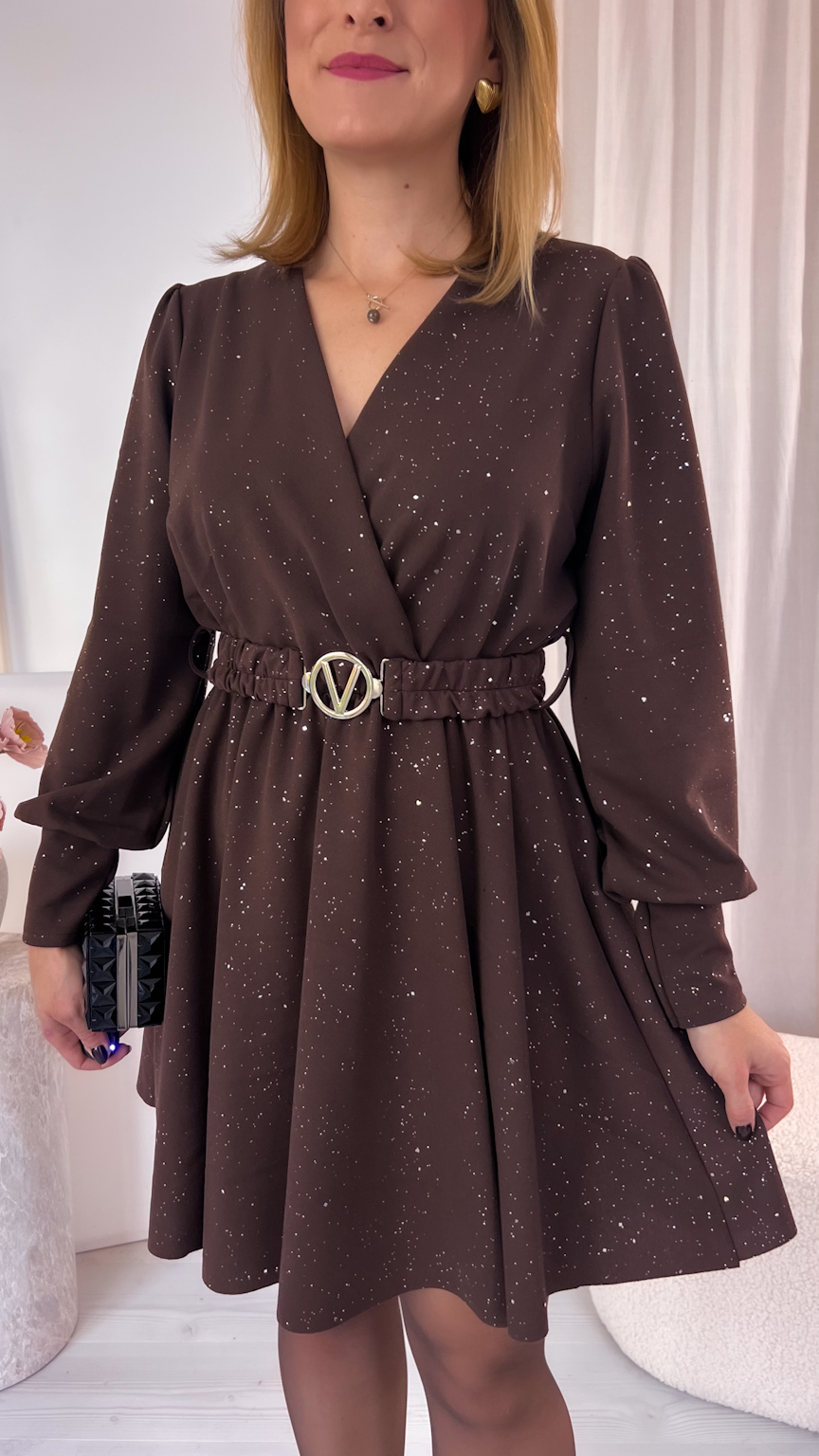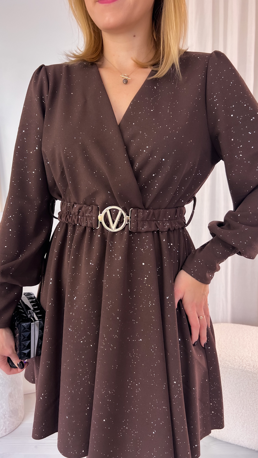 Kopertowy dekolt subtelnie eksponuje dekolt i dodaje całości wyjątkowego charakteru. Uszyta z tkaniny mieniącej się srebrnymi drobinkami, przyciąga spojrzenia i sprawia, że każda stylizacja nabiera wyjątkowego, wieczorowego blasku.