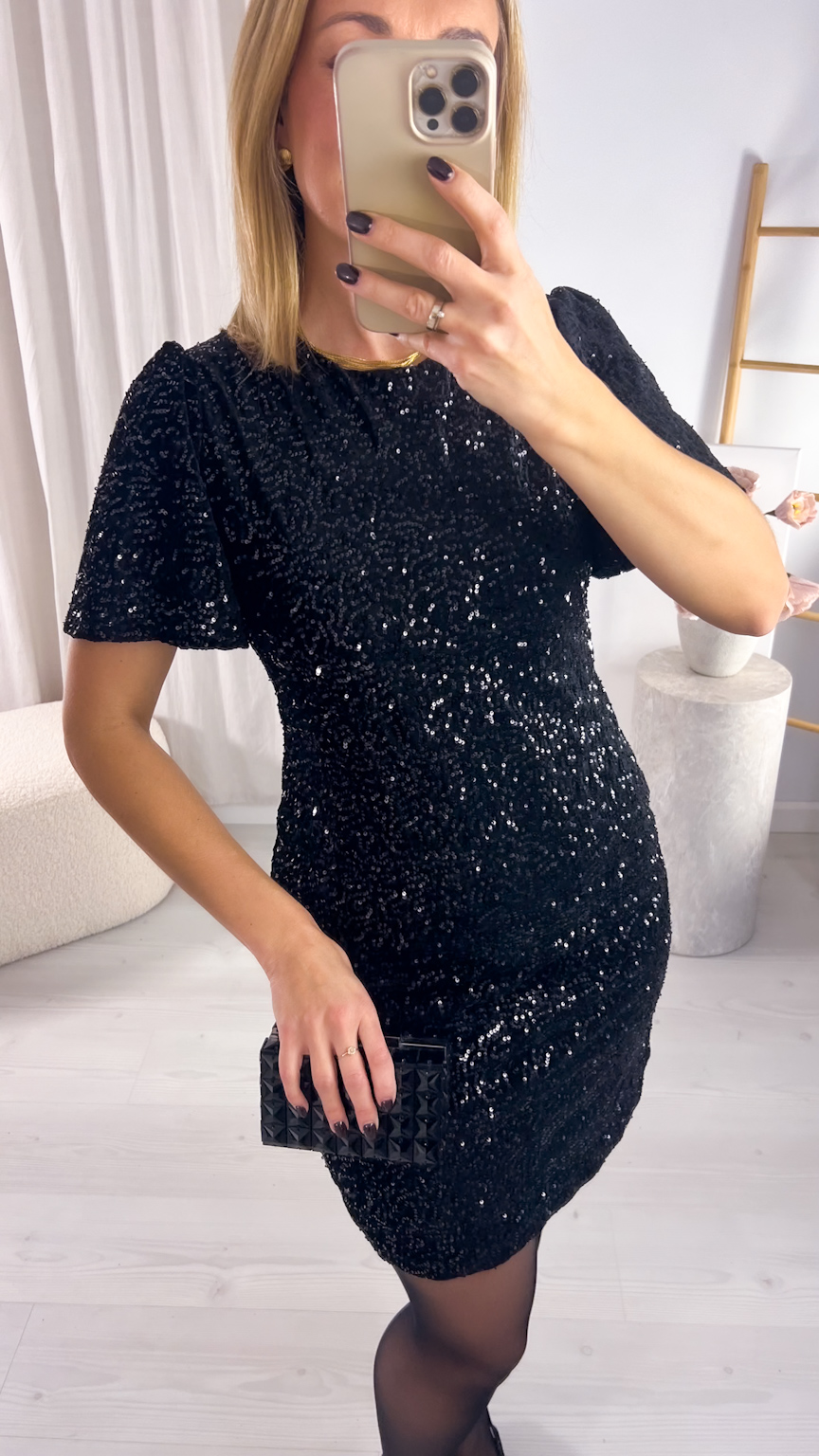 Zjawiskowa sukienka tuba przed kolano to idealny wybór dla kobiet, które cenią sobie elegancję i efektowny wygląd. Wykonana w całości z błyszczących cekinów, pięknie mieni się w świetle, podkreślając każdą stylizację.