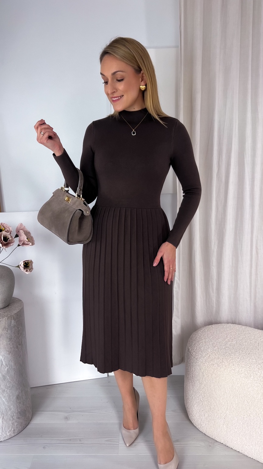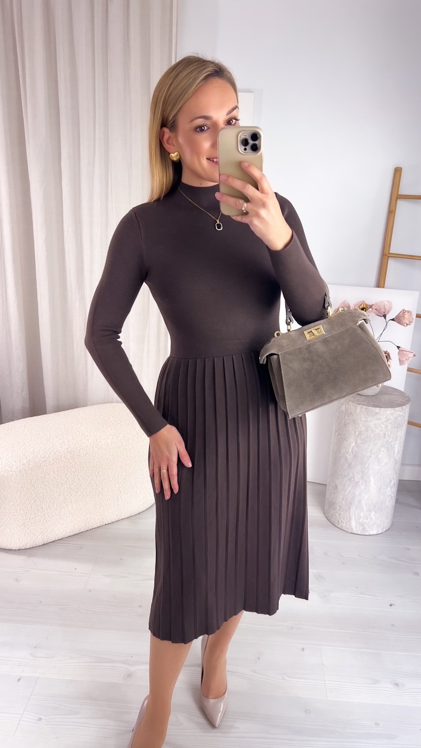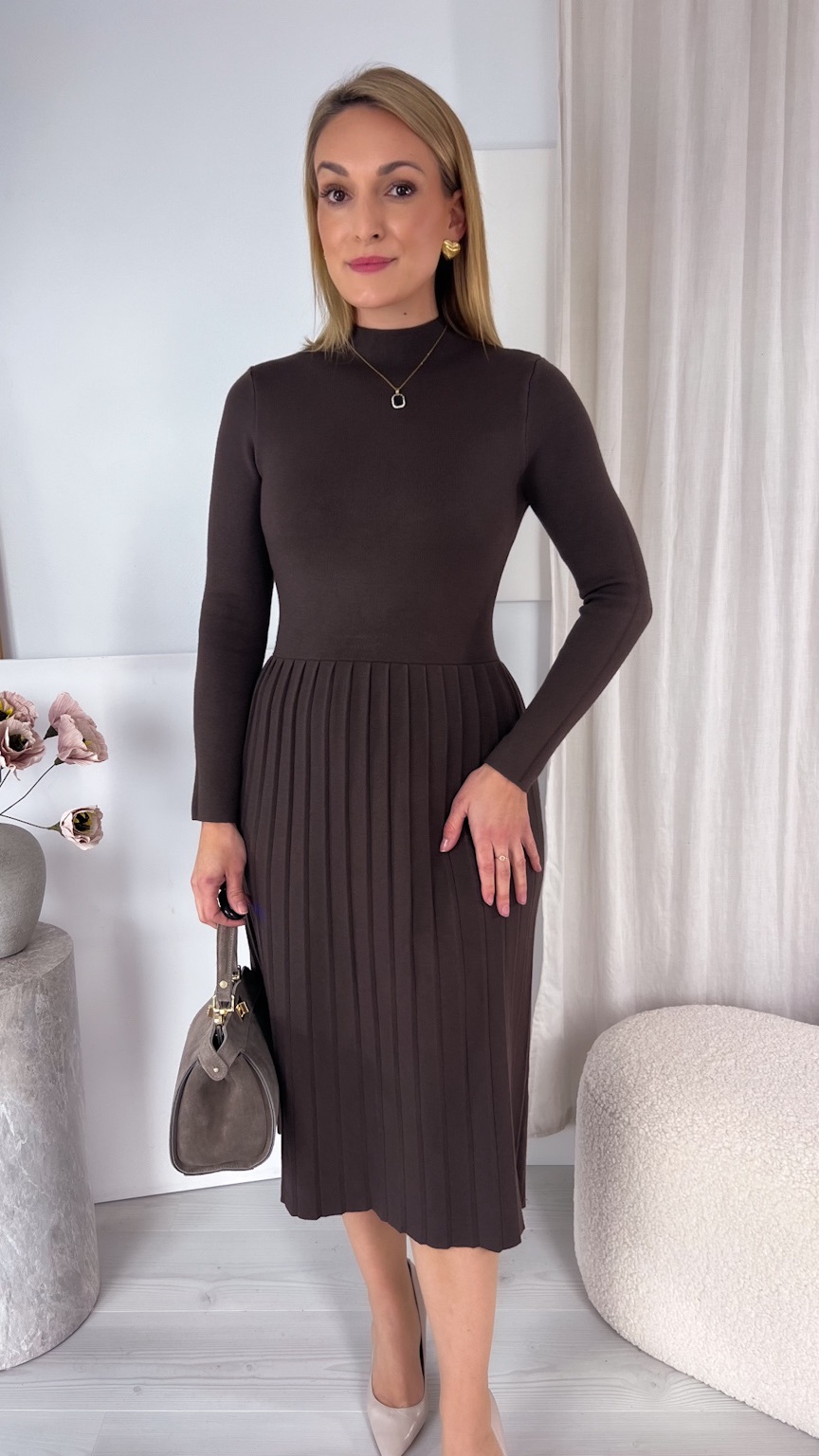 Elegancka, klasyczna sukienka midi z miękkiej, przyjemnej w dotyku dzianiny to idealna propozycja dla kobiet ceniących styl i wygodę. Model zachwyca połączeniem gładkiej, minimalistycznej góry z niezwykle kobiecą plisowaną spódnicą, która dodaje lekkości i subtelnego ruchu przy każdym kroku. Długi rękaw oraz półgolf nadają całości szykownego, ponadczasowego charakteru, sprawiając, że sukienka świetnie sprawdzi się zarówno na co dzień, jak i na wyjątkowe okazje.