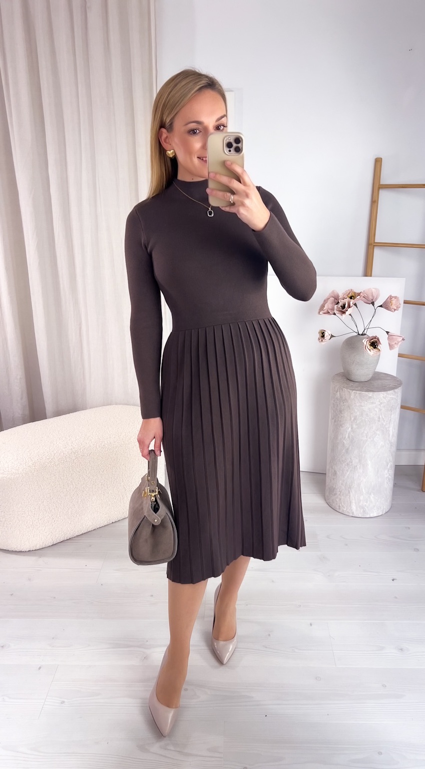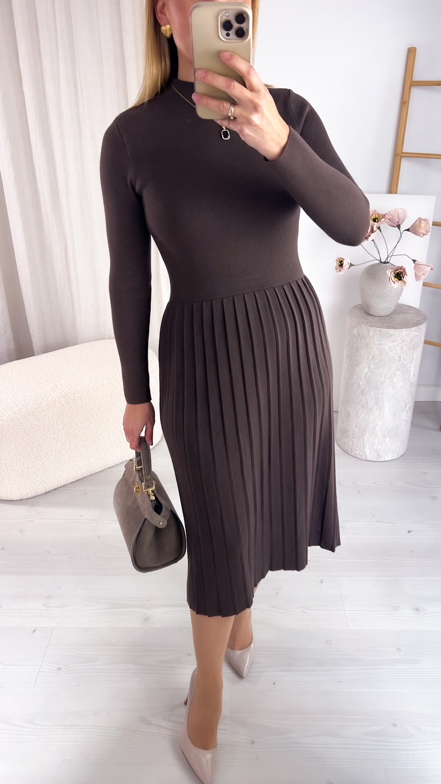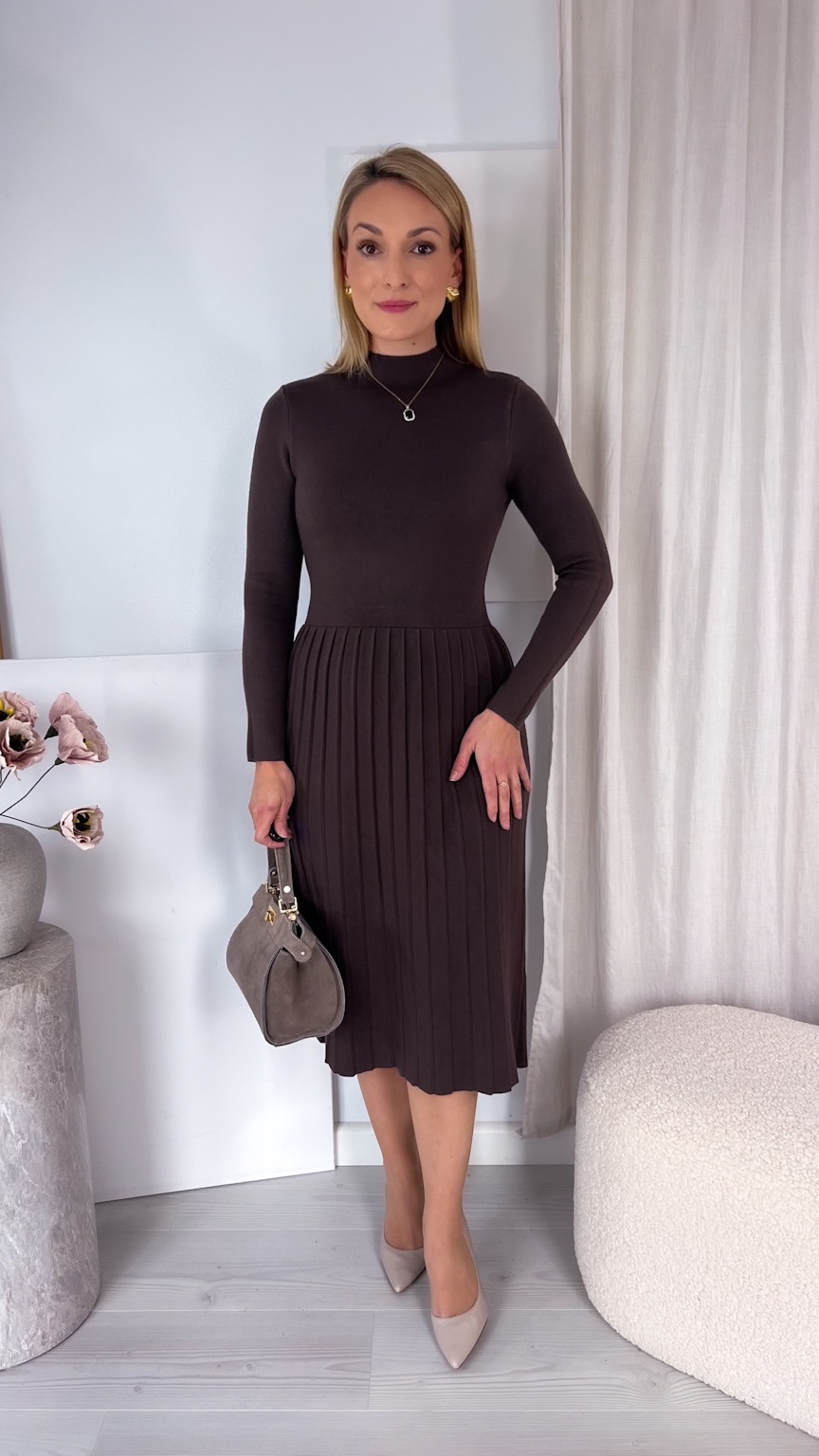 Elegancka, klasyczna sukienka midi z miękkiej, przyjemnej w dotyku dzianiny to idealna propozycja dla kobiet ceniących styl i wygodę. Model zachwyca połączeniem gładkiej, minimalistycznej góry z niezwykle kobiecą plisowaną spódnicą, która dodaje lekkości i subtelnego ruchu przy każdym kroku. Długi rękaw oraz półgolf nadają całości szykownego, ponadczasowego charakteru, sprawiając, że sukienka świetnie sprawdzi się zarówno na co dzień, jak i na wyjątkowe okazje.