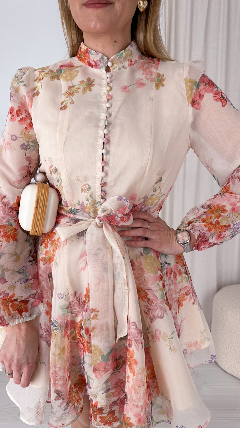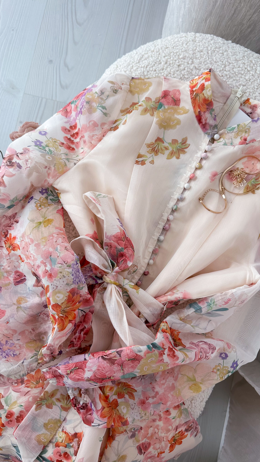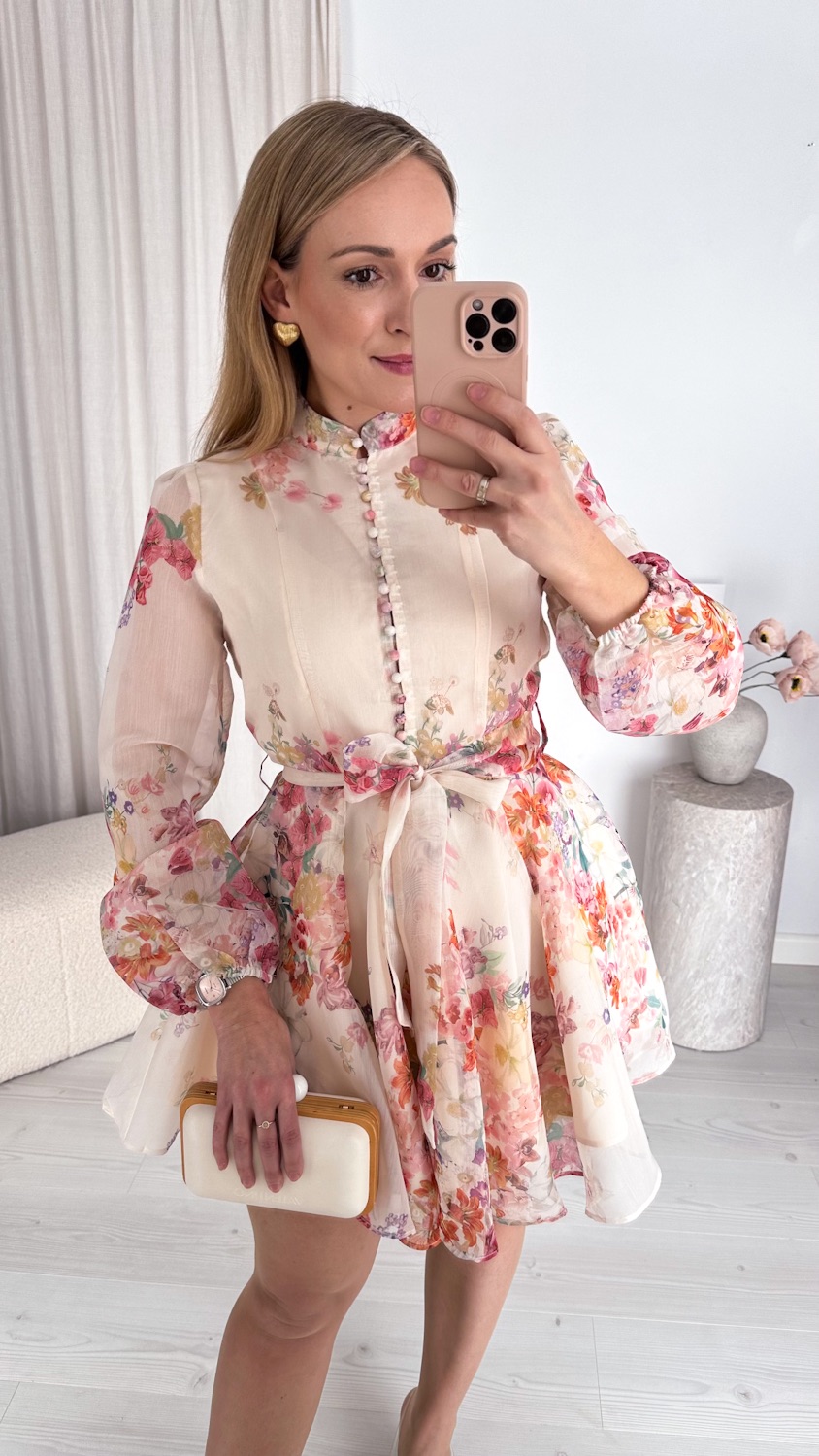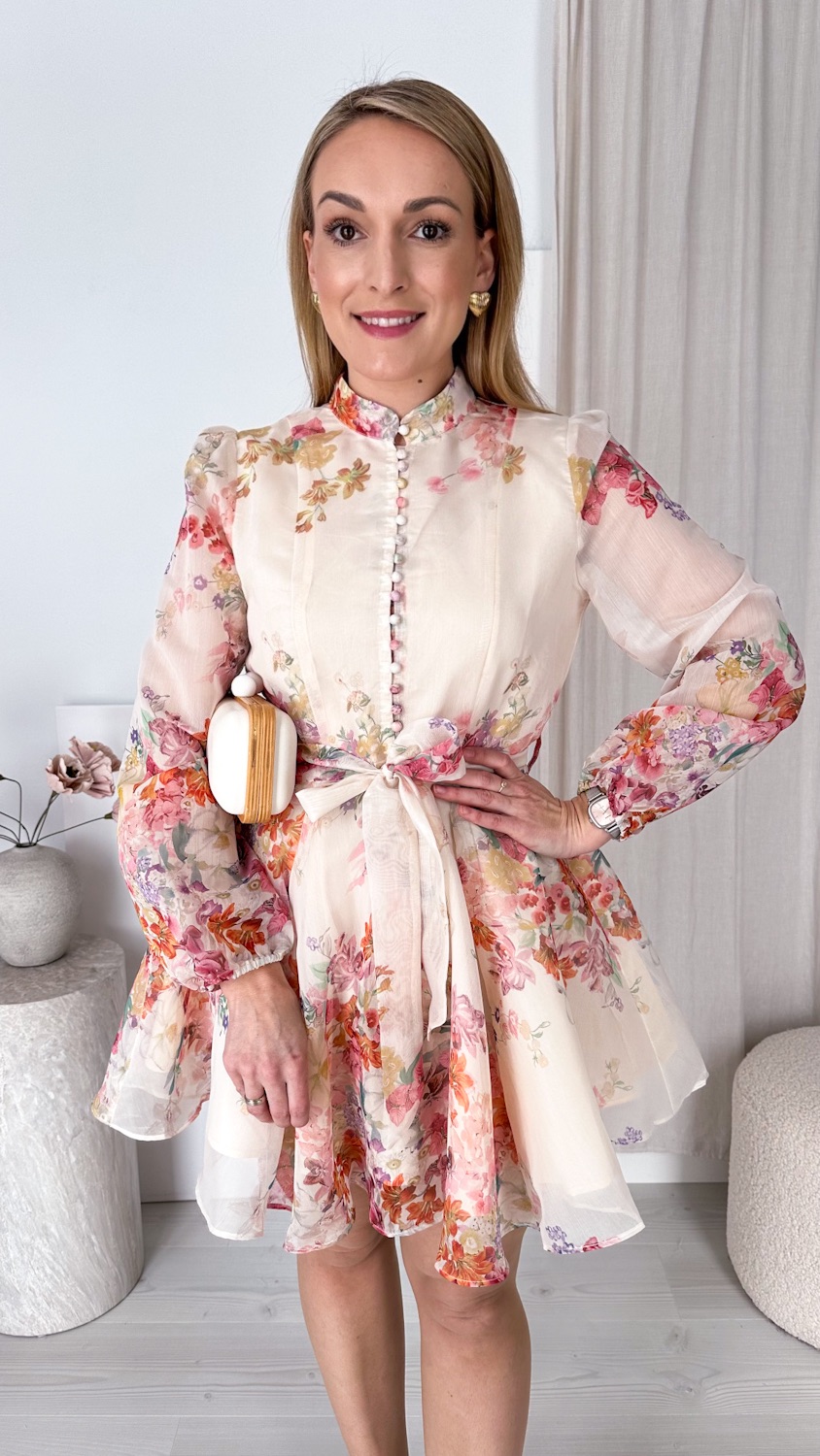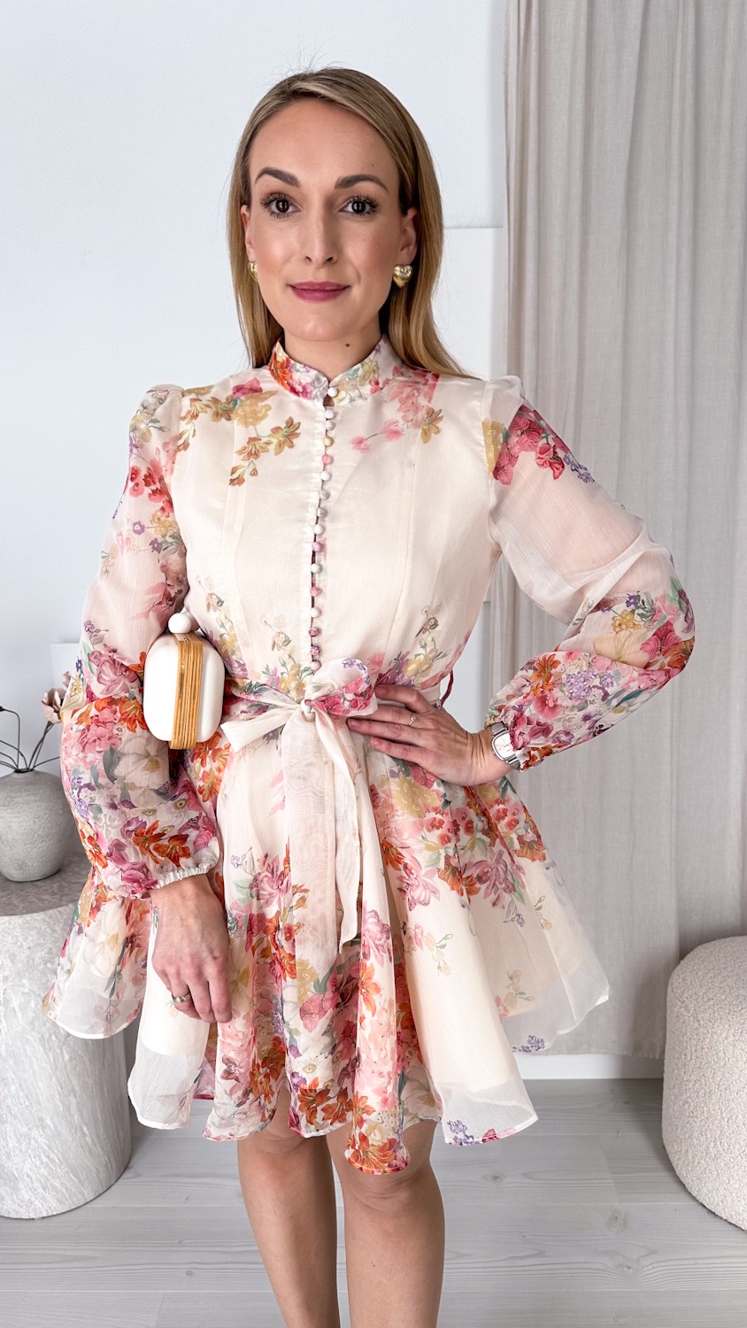 Długość przed kolano pięknie eksponuje nogi i nadaje sylwetce lekkości, a kwiatowy print dodaje świeżości i romantycznej elegancji. To połączenie klasyki z modowym akcentem, które sprawdzi się zarówno podczas uroczystości, jak i eleganckich przyjęć.