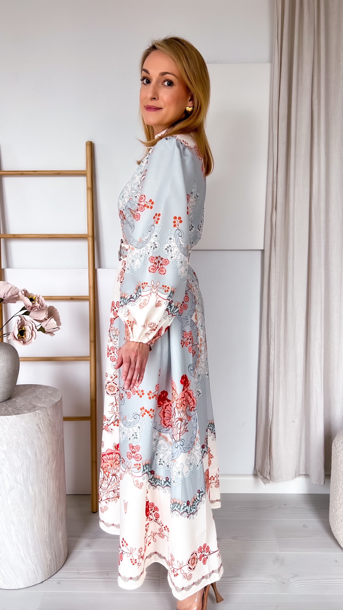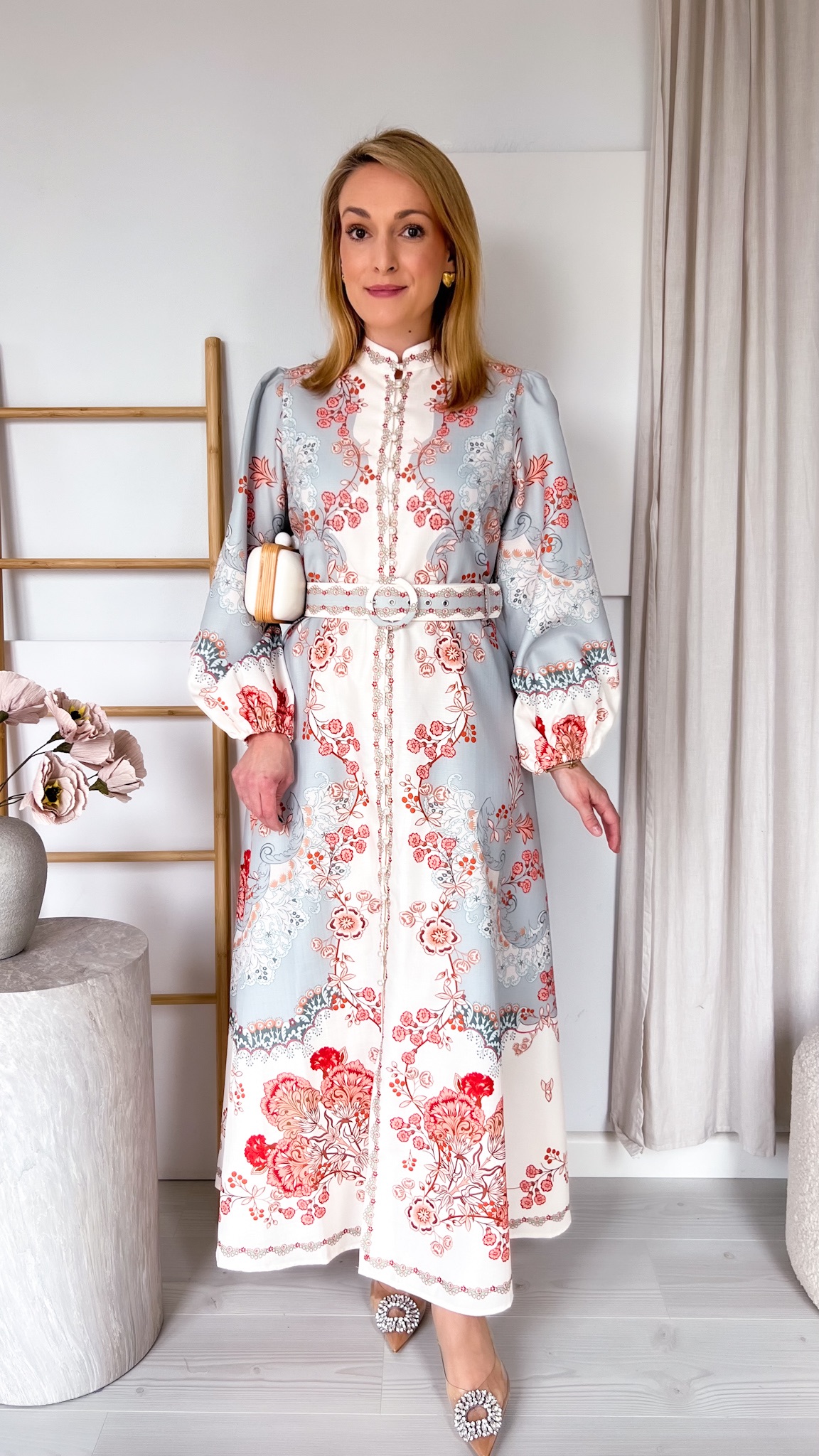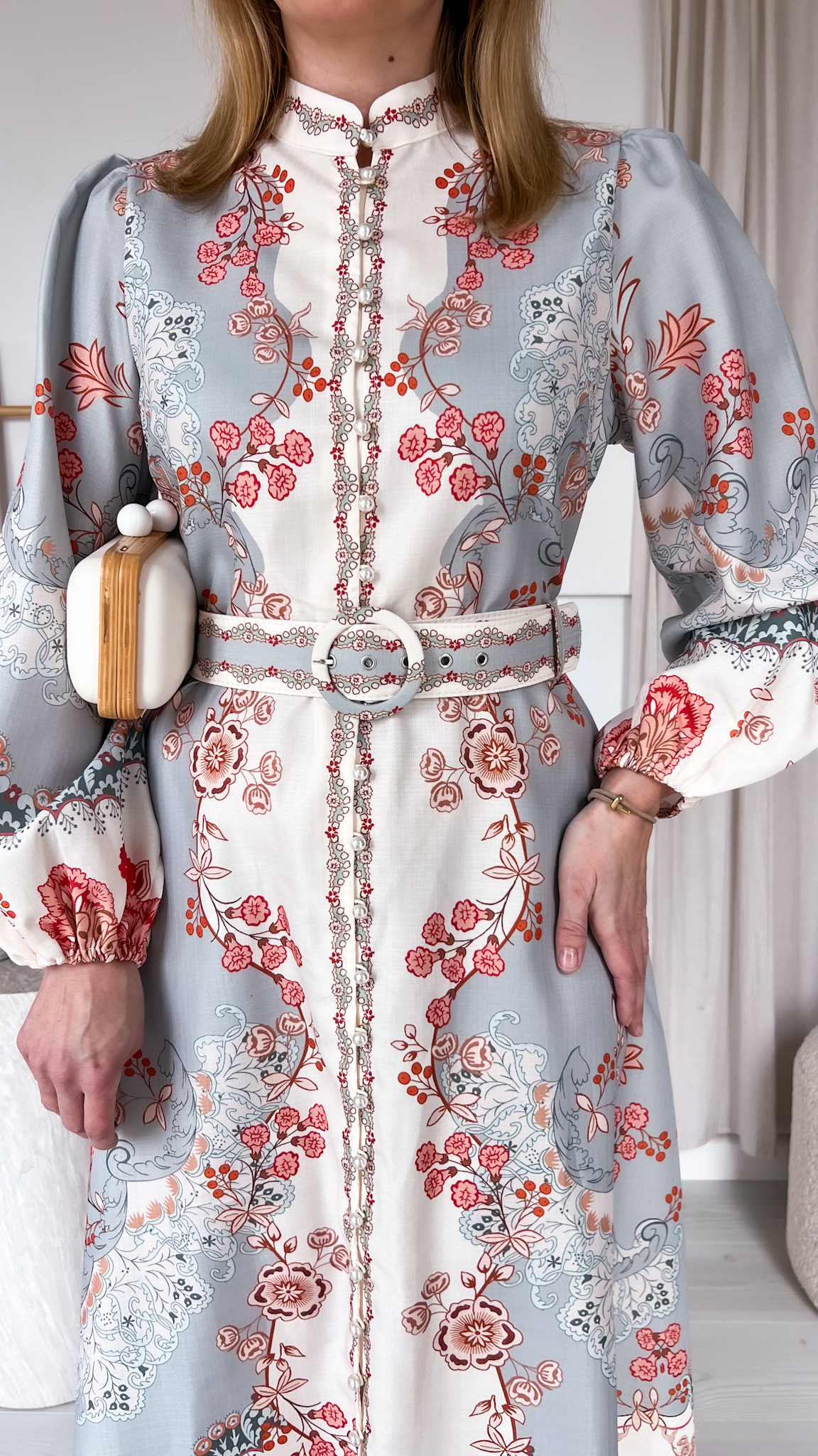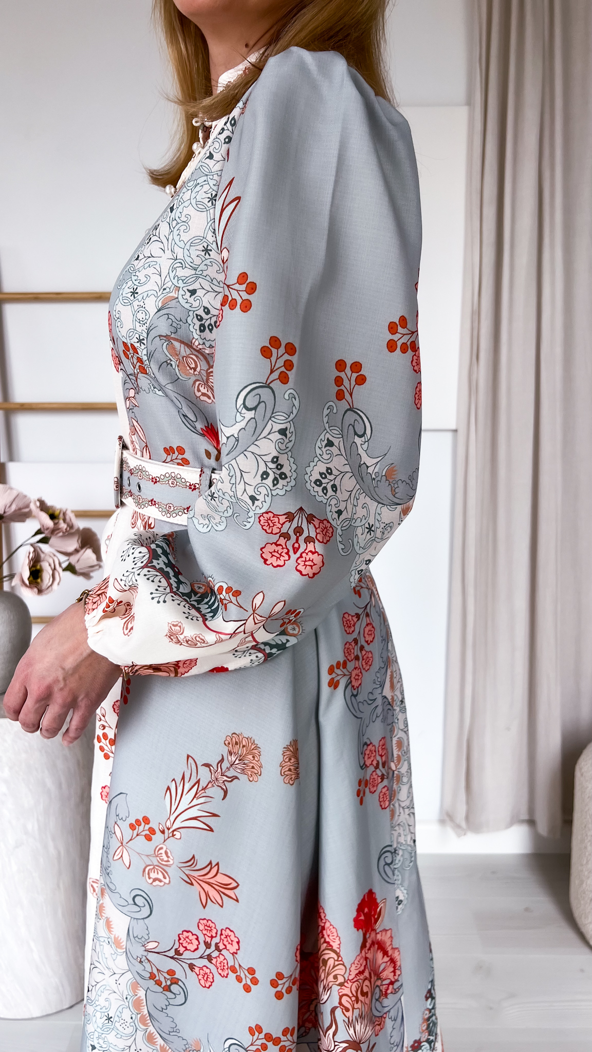 Suknia zachwyca unikalnym, przyciągającym spojrzenia printem, który nadaje jej wyrazistości i sprawia, że nie sposób przejść obok niej obojętnie. Dołączony pasek podkreśla talię, modelując figurę i dodając stylizacji eleganckiego wykończenia.