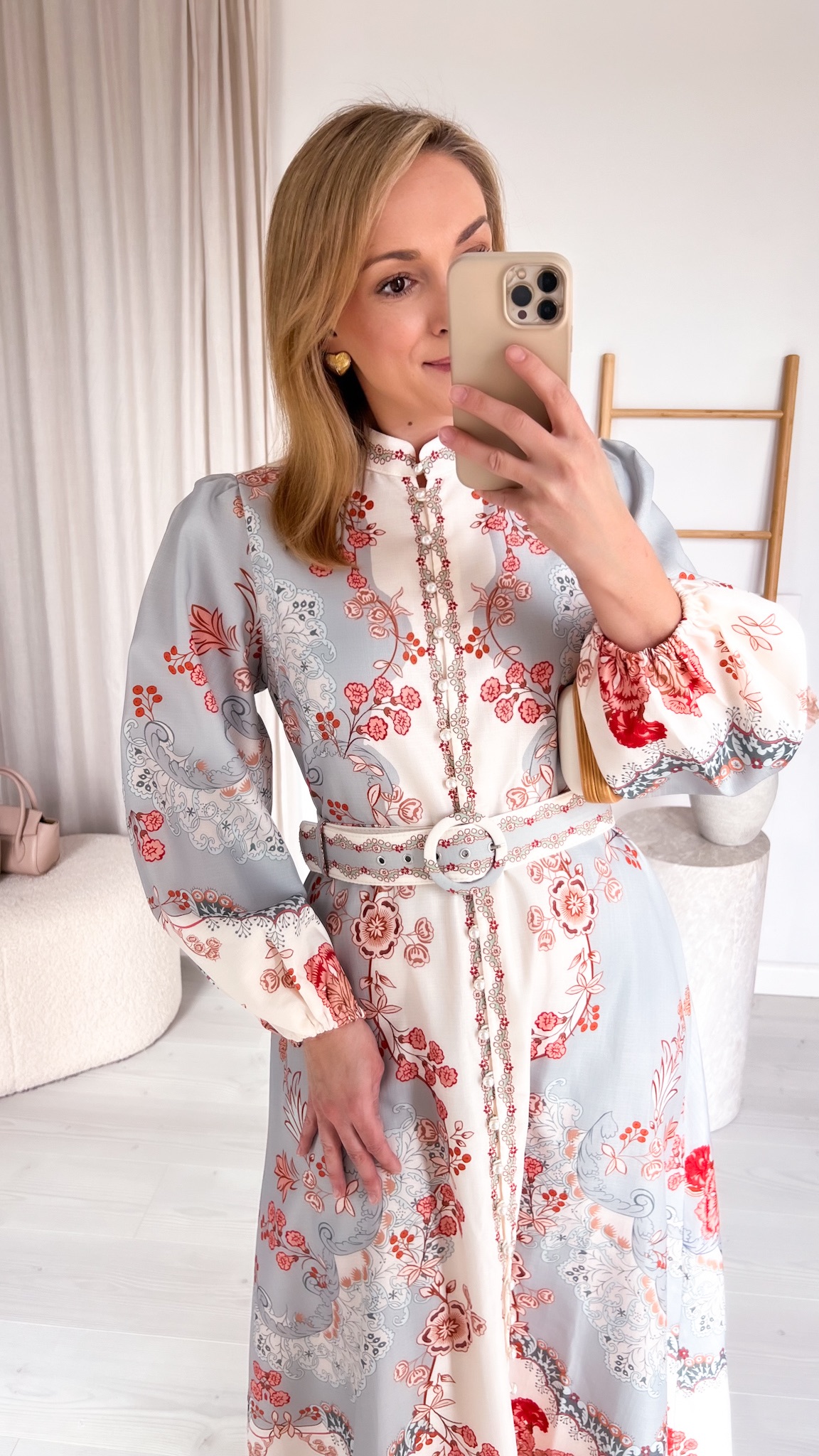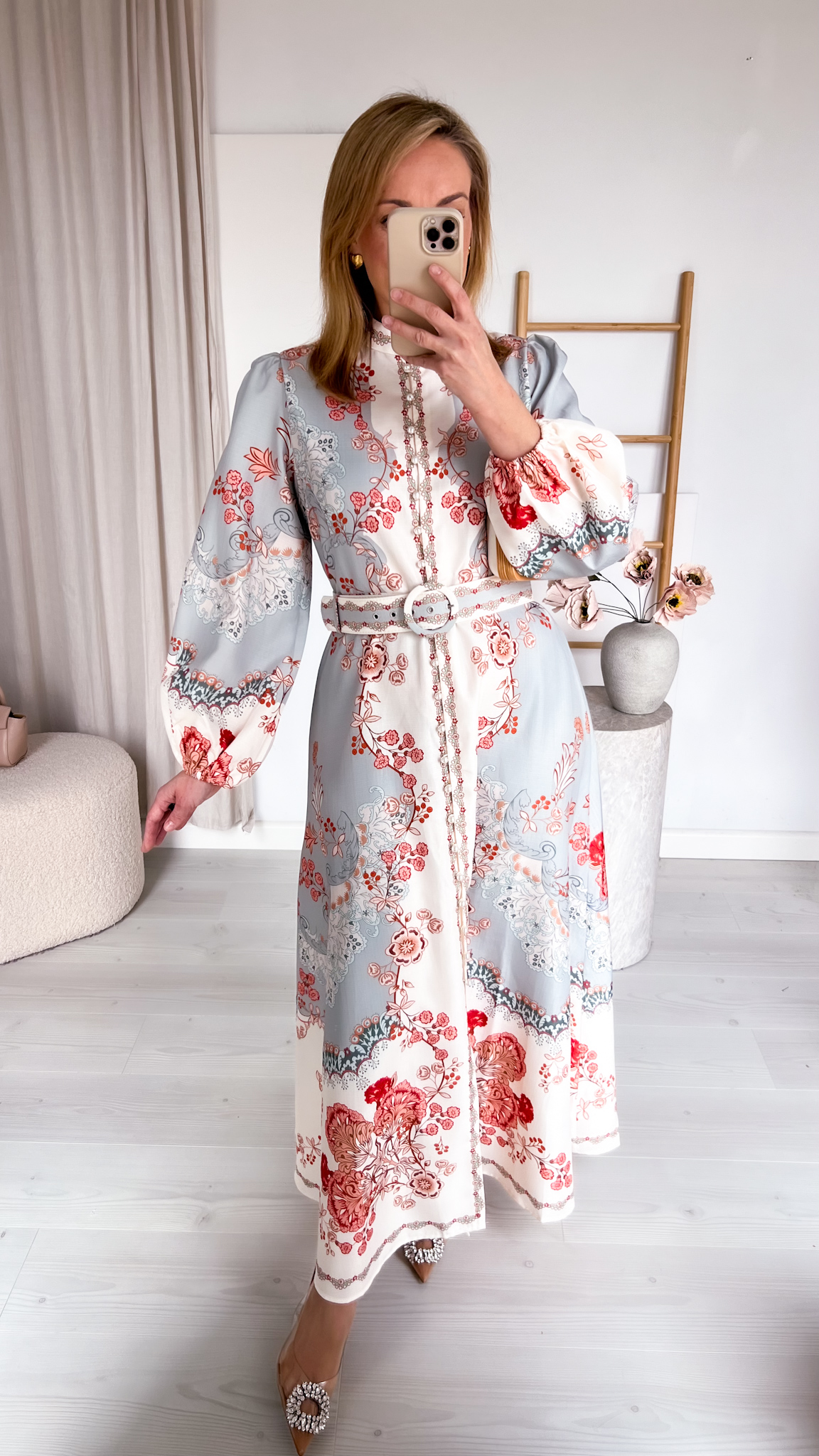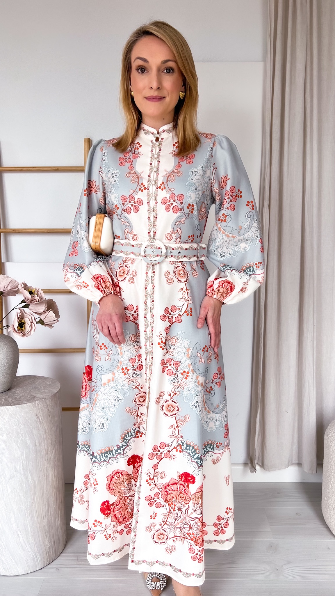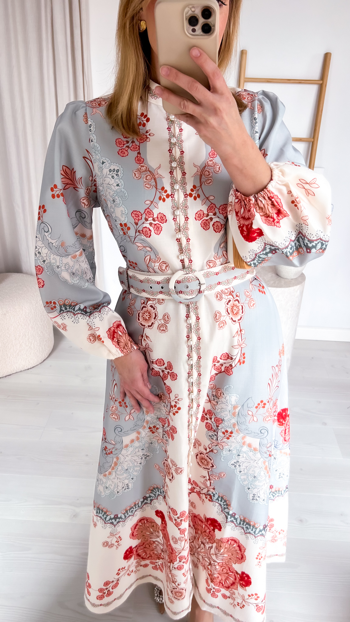 Suknia zachwyca unikalnym, przyciągającym spojrzenia printem, który nadaje jej wyrazistości i sprawia, że nie sposób przejść obok niej obojętnie. Dołączony pasek podkreśla talię, modelując figurę i dodając stylizacji eleganckiego wykończenia.