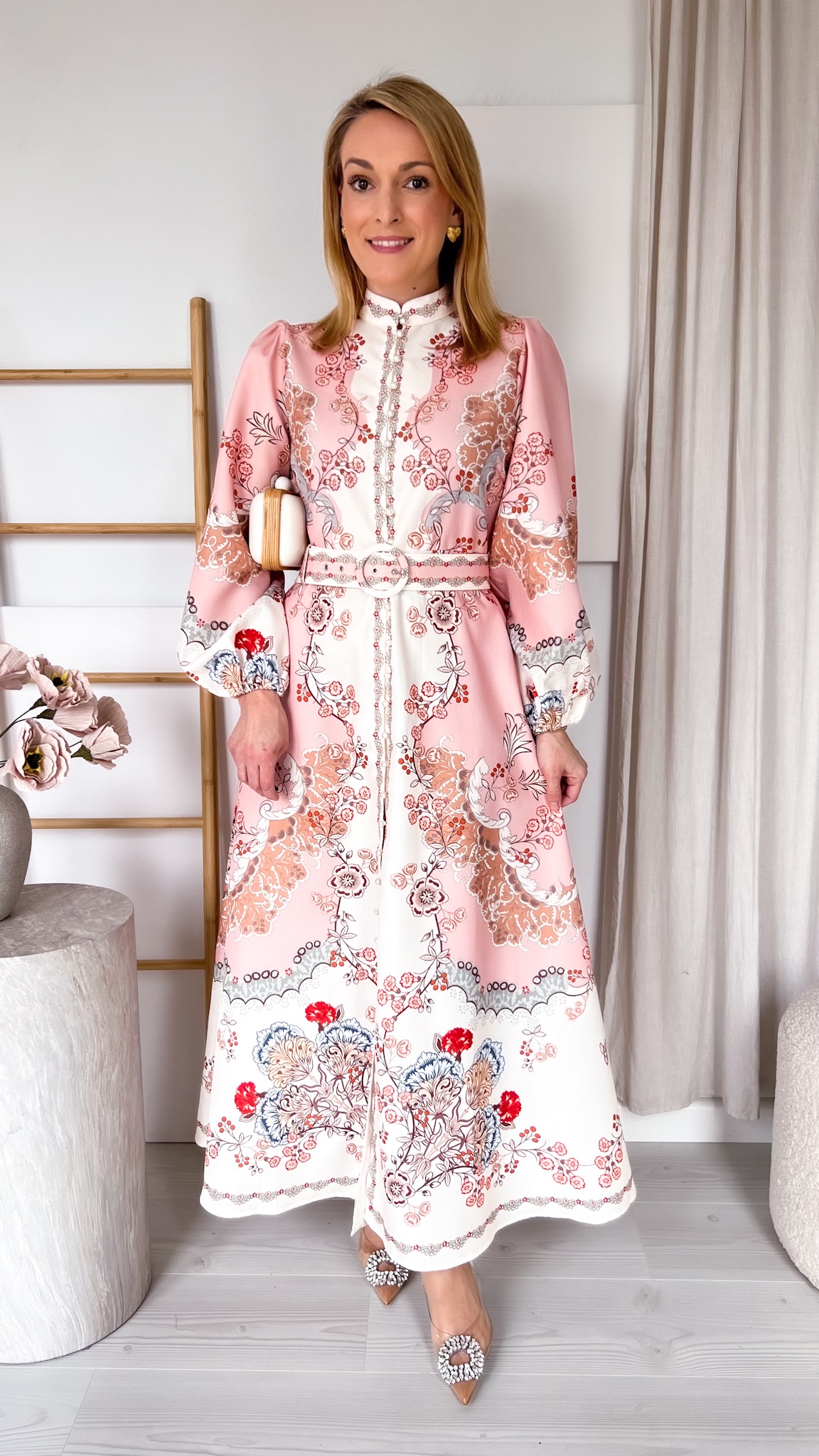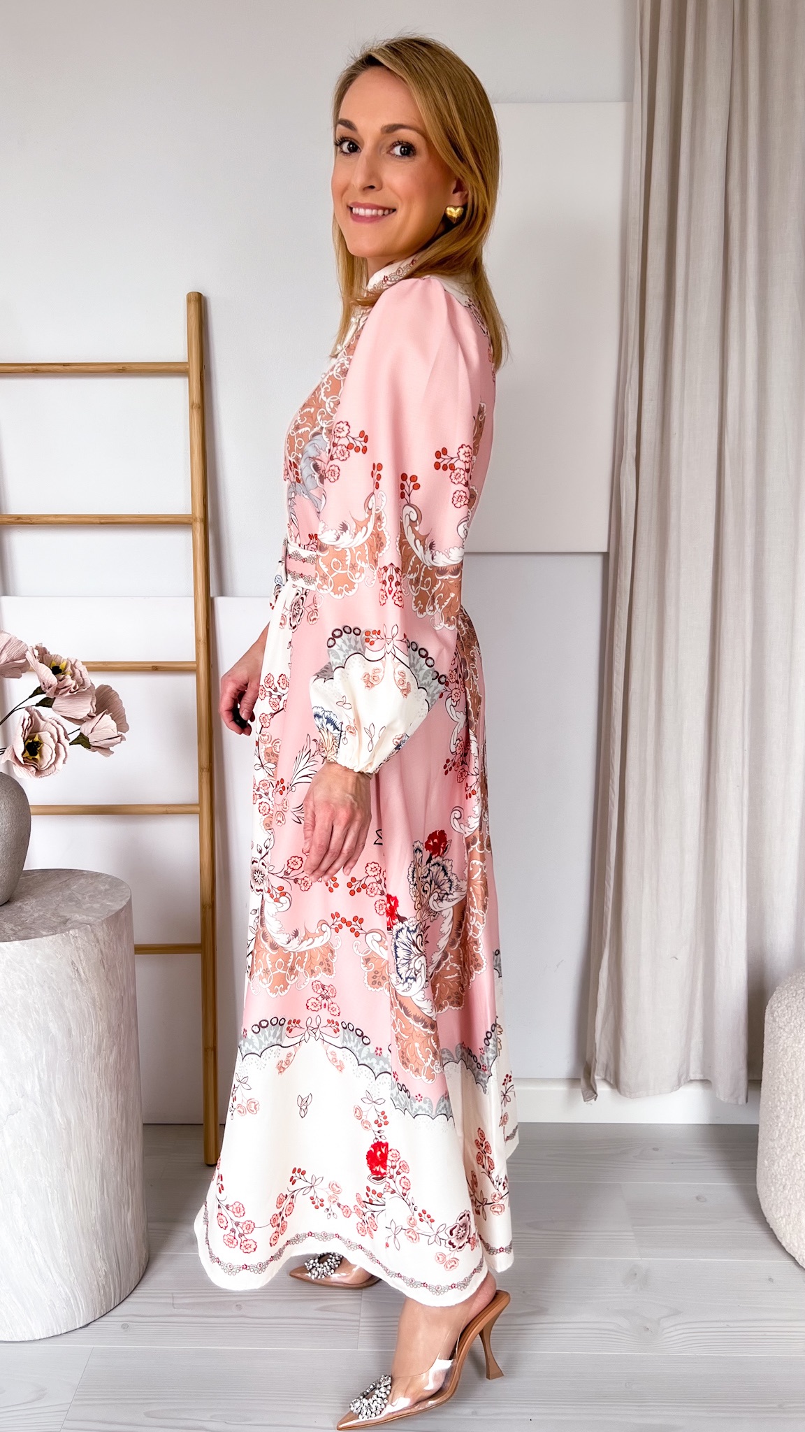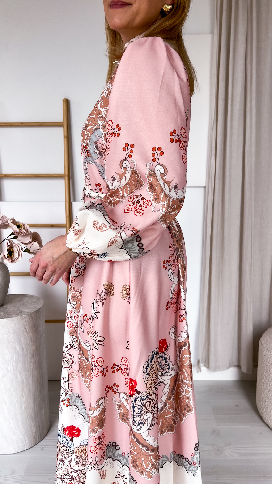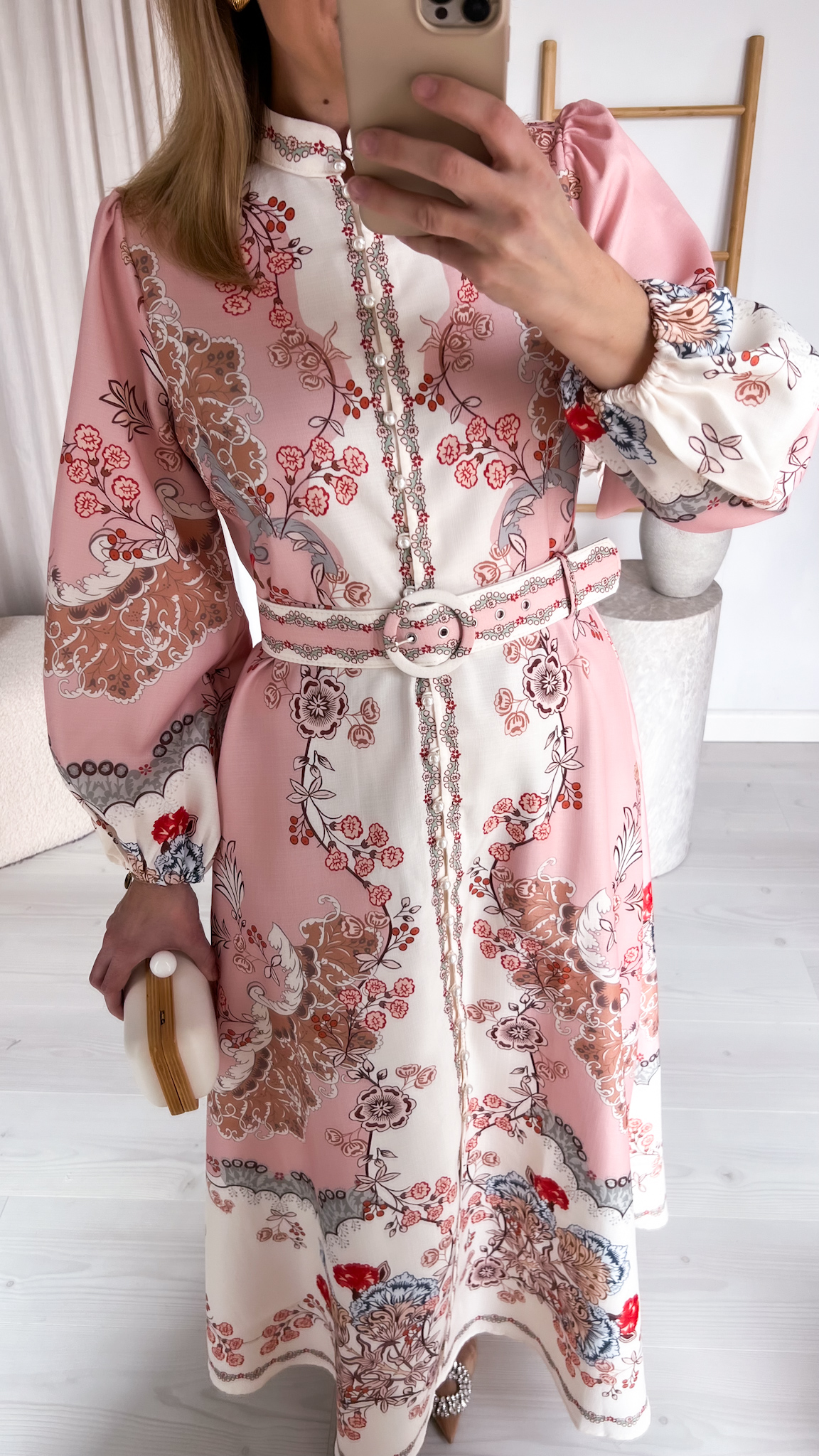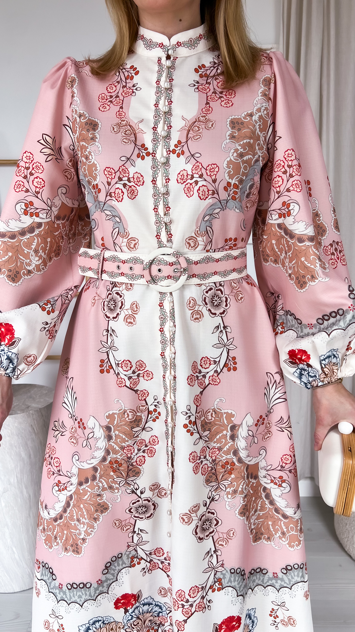 Suknia zachwyca unikalnym, przyciągającym spojrzenia printem, który nadaje jej wyrazistości i sprawia, że nie sposób przejść obok niej obojętnie. Dołączony pasek podkreśla talię, modelując figurę i dodając stylizacji eleganckiego wykończenia.