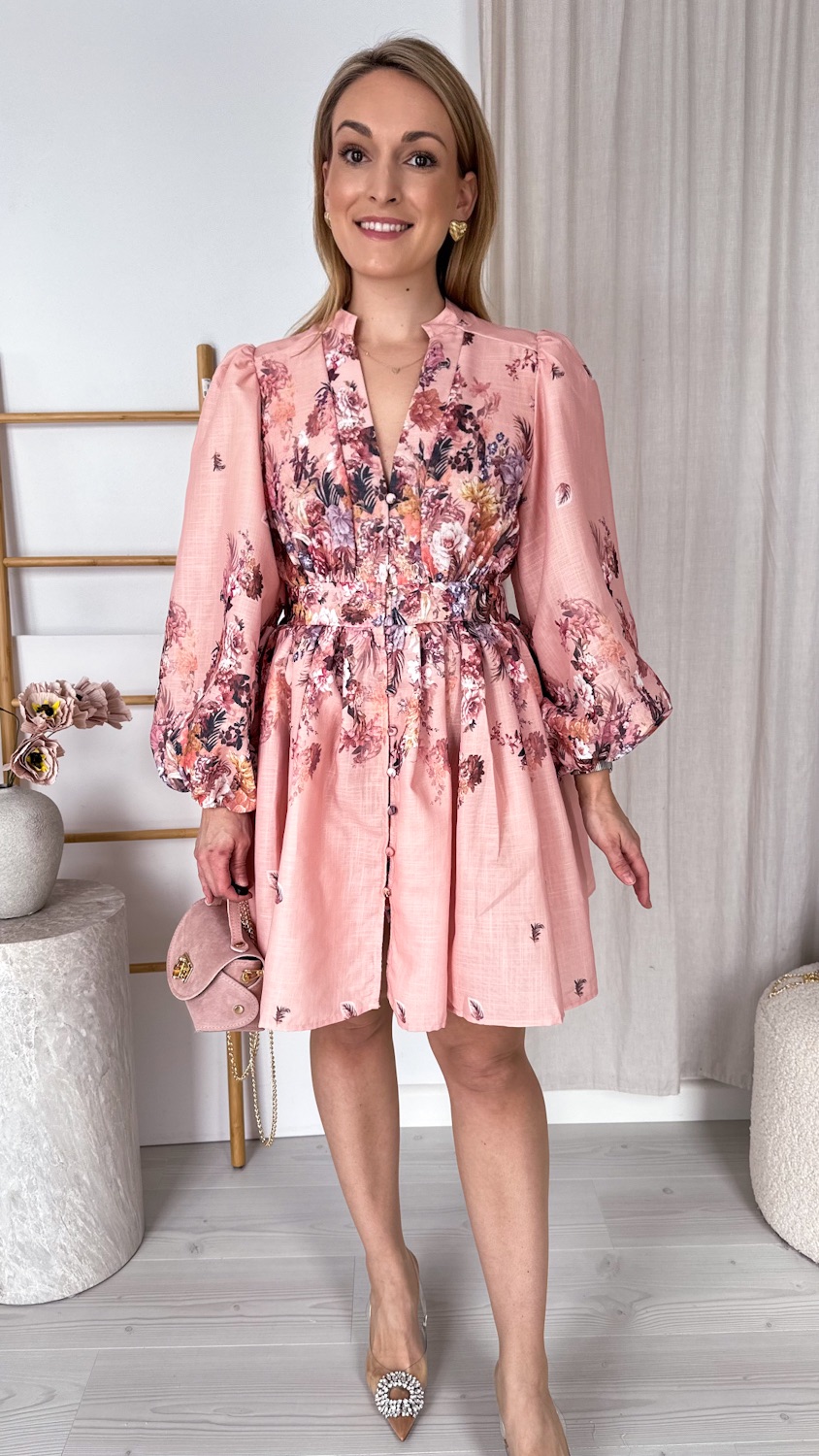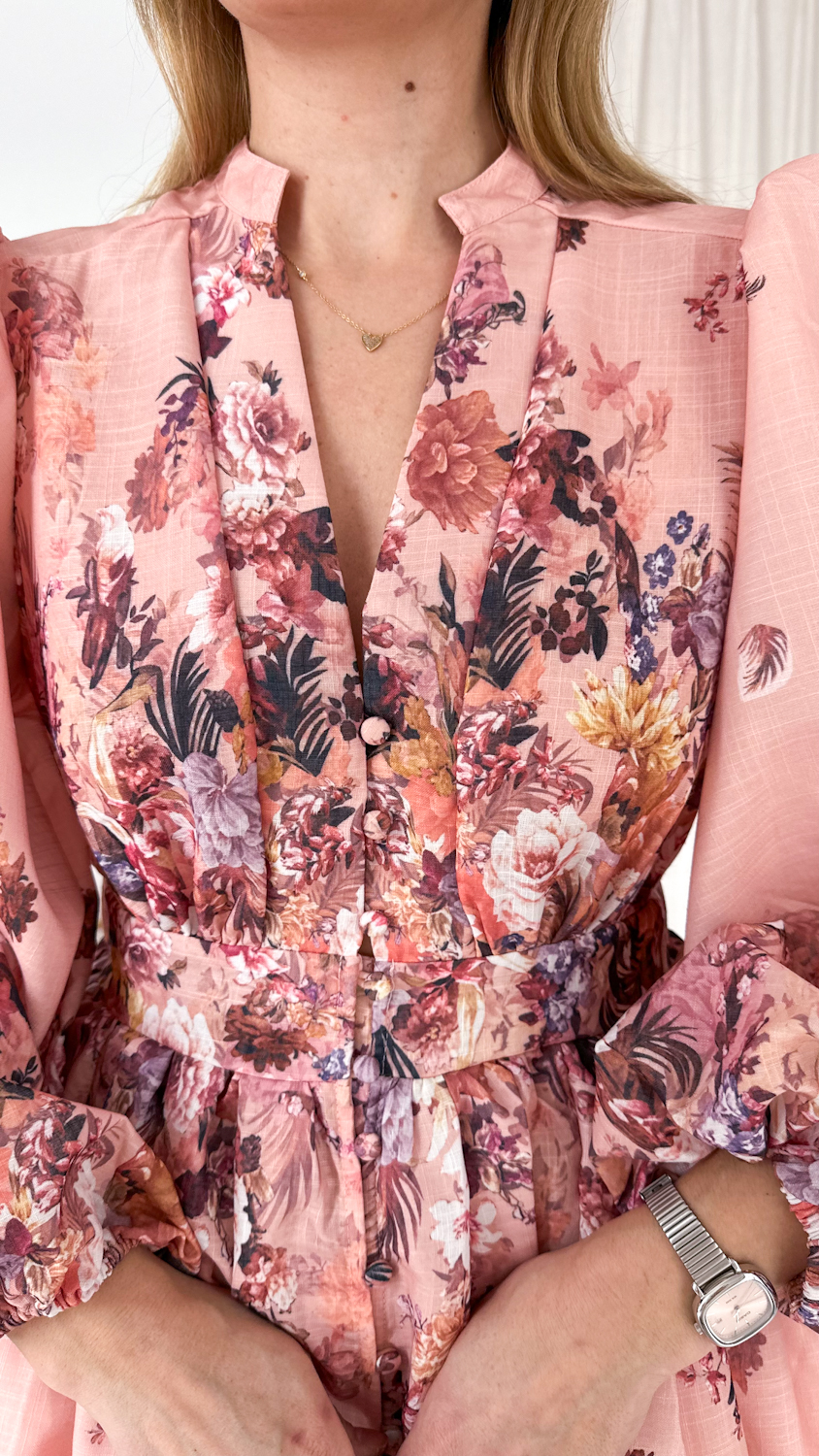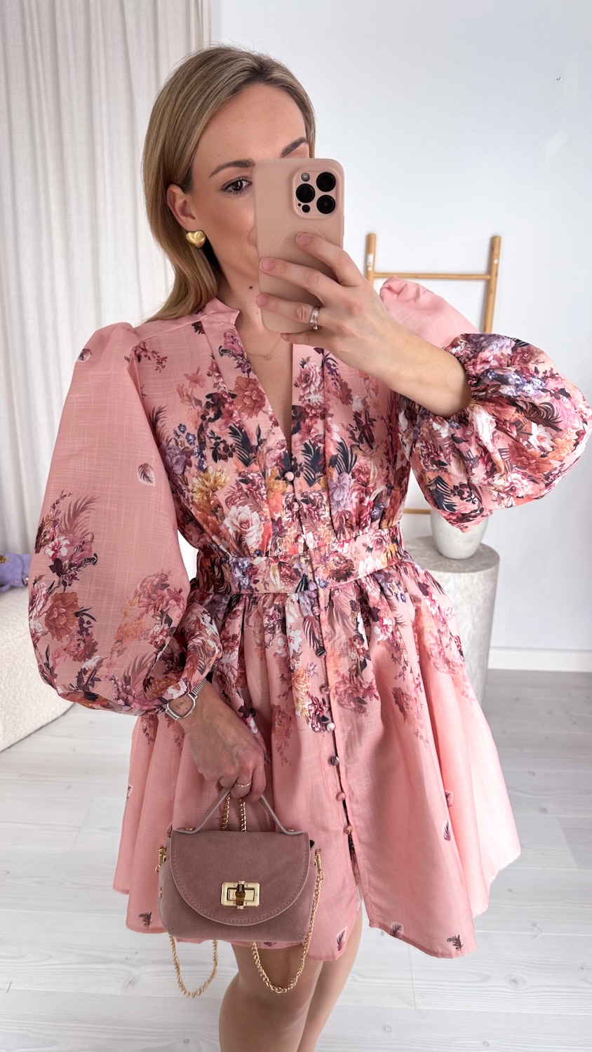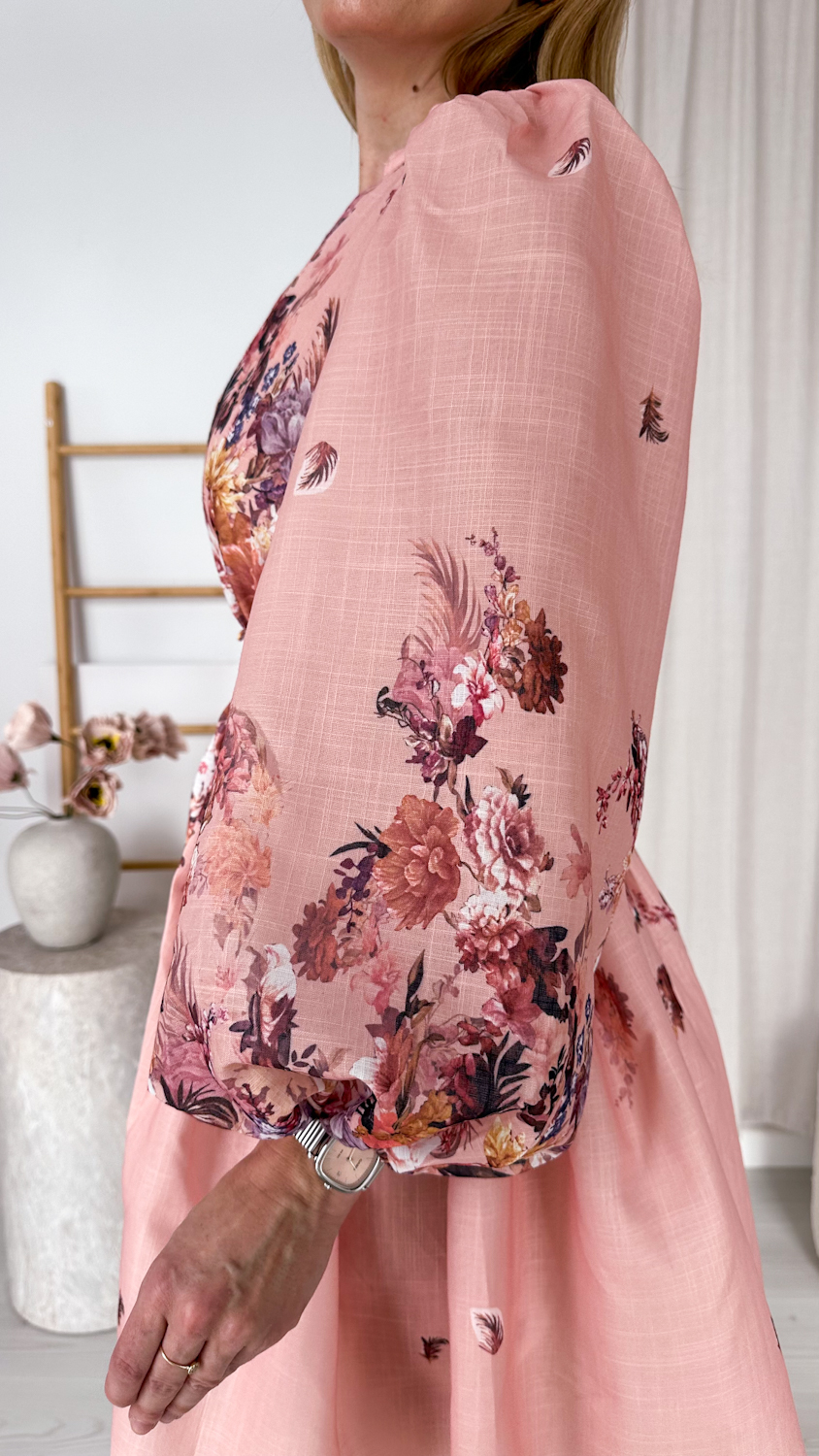 Wyjątkowa suknia w kwiaty w pięknym łososiowym odcieniu to kwintesencja kobiecości i romantycznego stylu. Ciepła, subtelna kolorystyka sprawia, że kreacja prezentuje się niezwykle świeżo i elegancko, a delikatny kwiatowy wzór dodaje jej lekkości i wdzięku.
