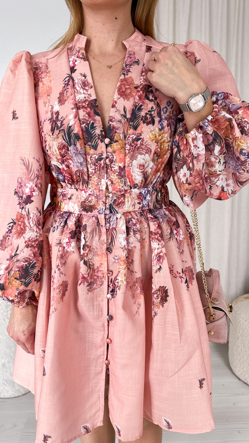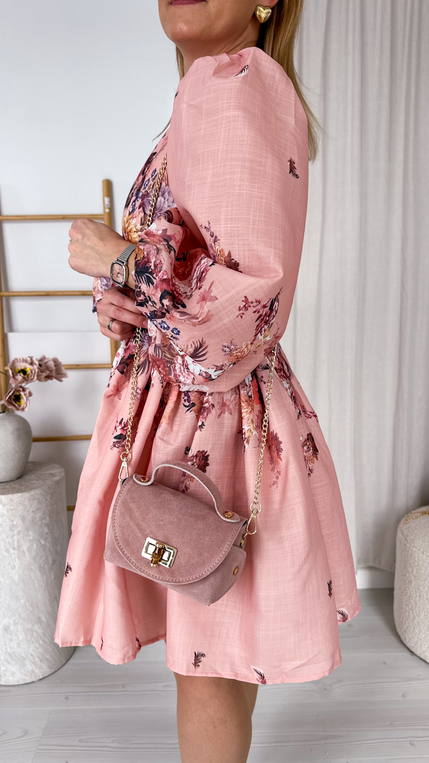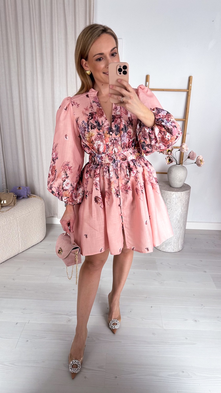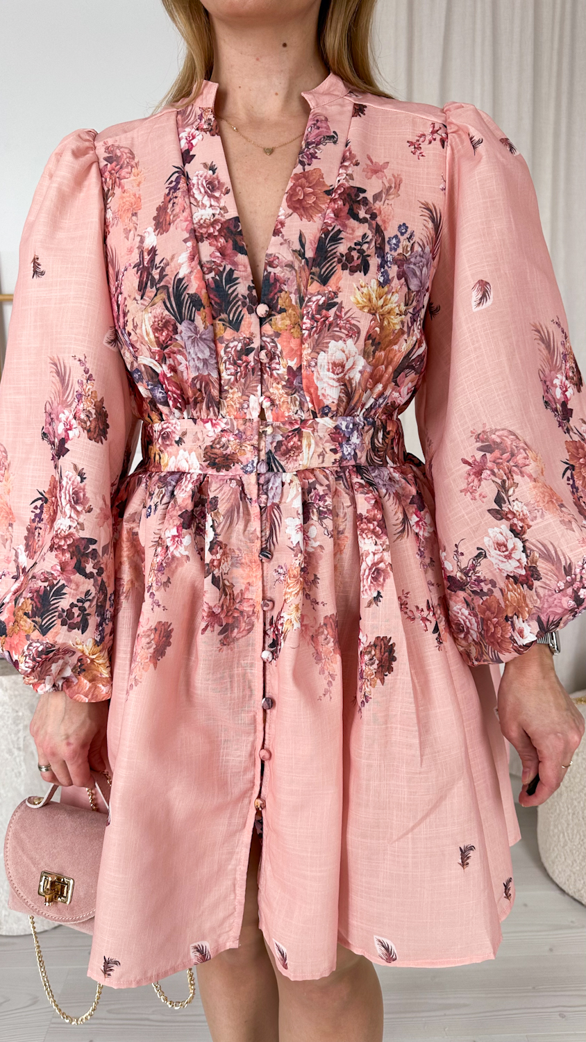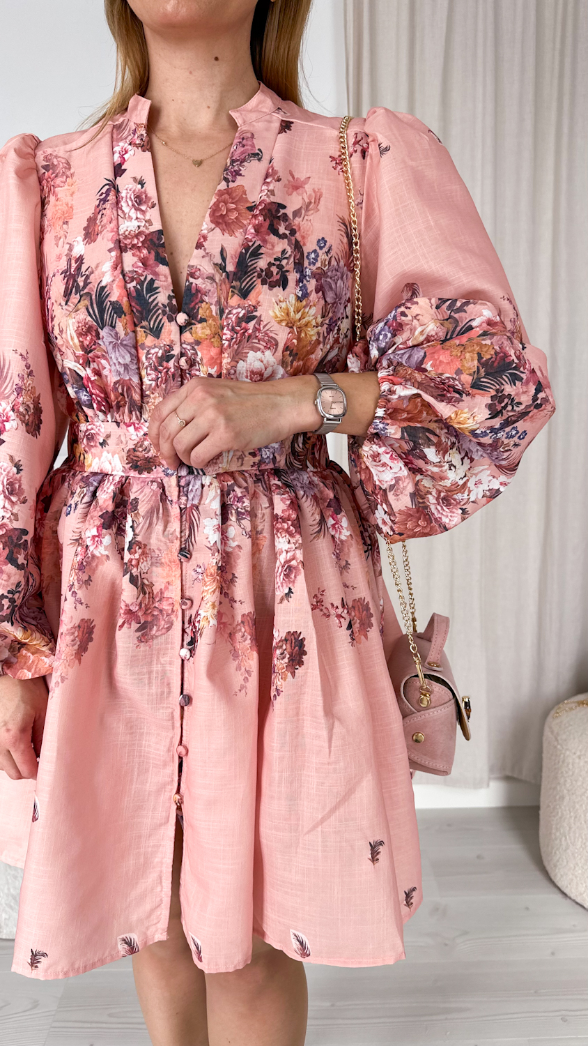 Wyjątkowa suknia w kwiaty w pięknym łososiowym odcieniu to kwintesencja kobiecości i romantycznego stylu. Ciepła, subtelna kolorystyka sprawia, że kreacja prezentuje się niezwykle świeżo i elegancko, a delikatny kwiatowy wzór dodaje jej lekkości i wdzięku.
