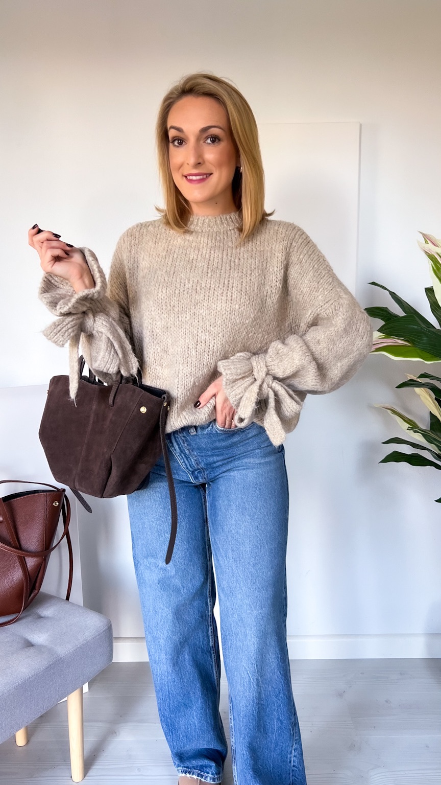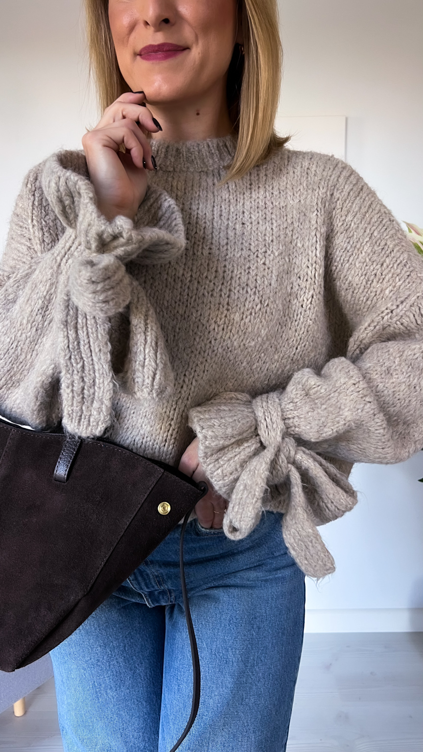 Zjawiskowy i kobiecy – ten sweter oversize z efektownymi kokardami na rękawach to must-have nadchodzącego sezonu. Luźny krój gwarantuje wygodę i swobodę ruchów, a dekoracyjne wiązania nadają całości wyjątkowego, romantycznego charakteru.