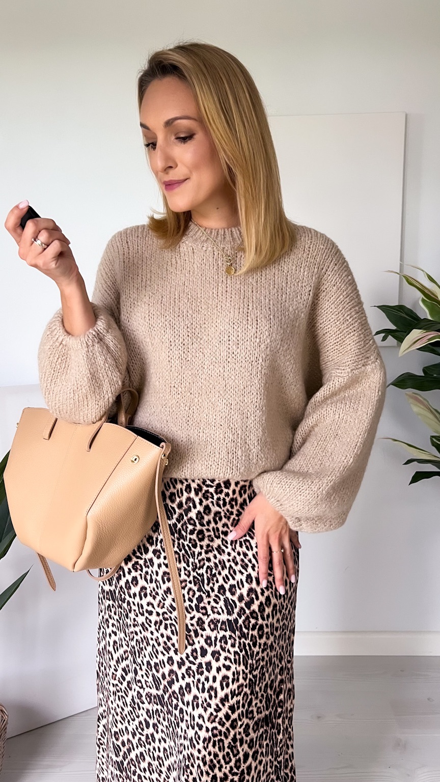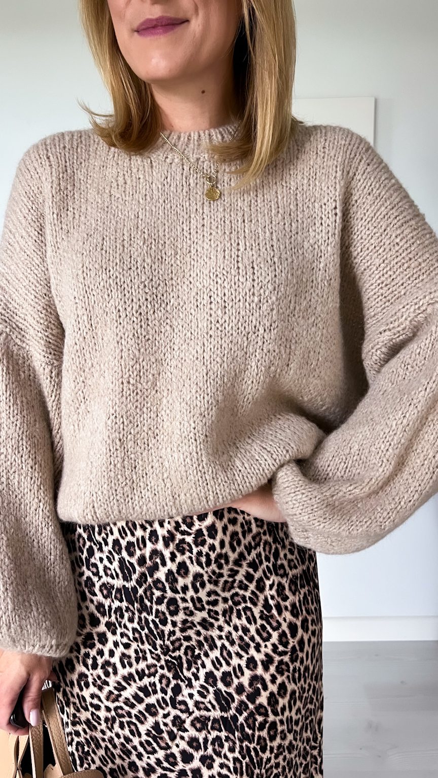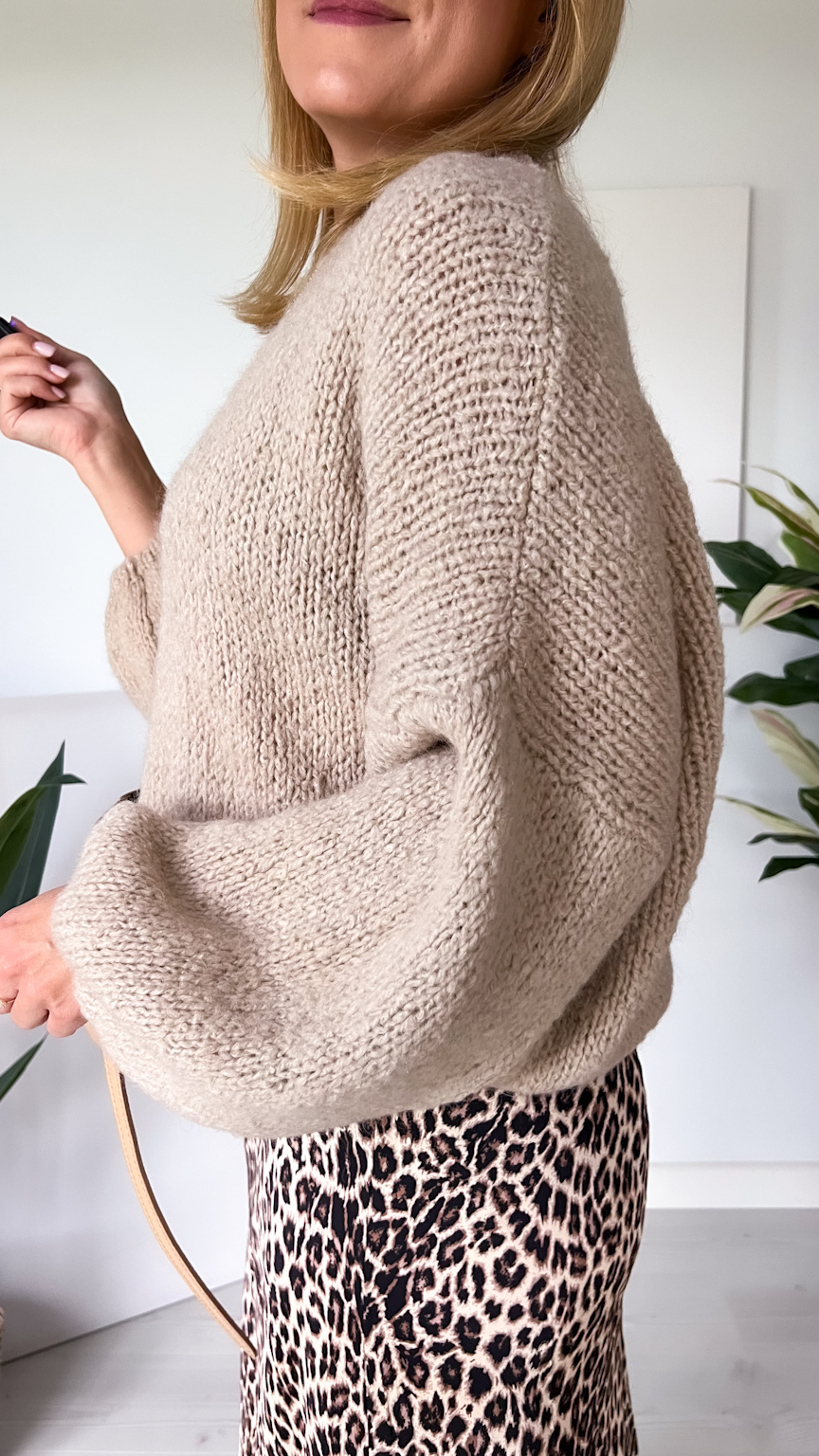 Przyjemny i otulający sweterek wykonany z miękkiej dzianiny to must-have w każdej garderobie. Szerszy dekolt subtelnie podkreśla linię szyi, a bufiaste rękawy zakończone ściągaczem dodają całości lekkości i stylu. Dzięki oversize’owemu krojowi oraz ściągaczowi w dole prezentuje się niezwykle swobodnie, a jednocześnie modnie.