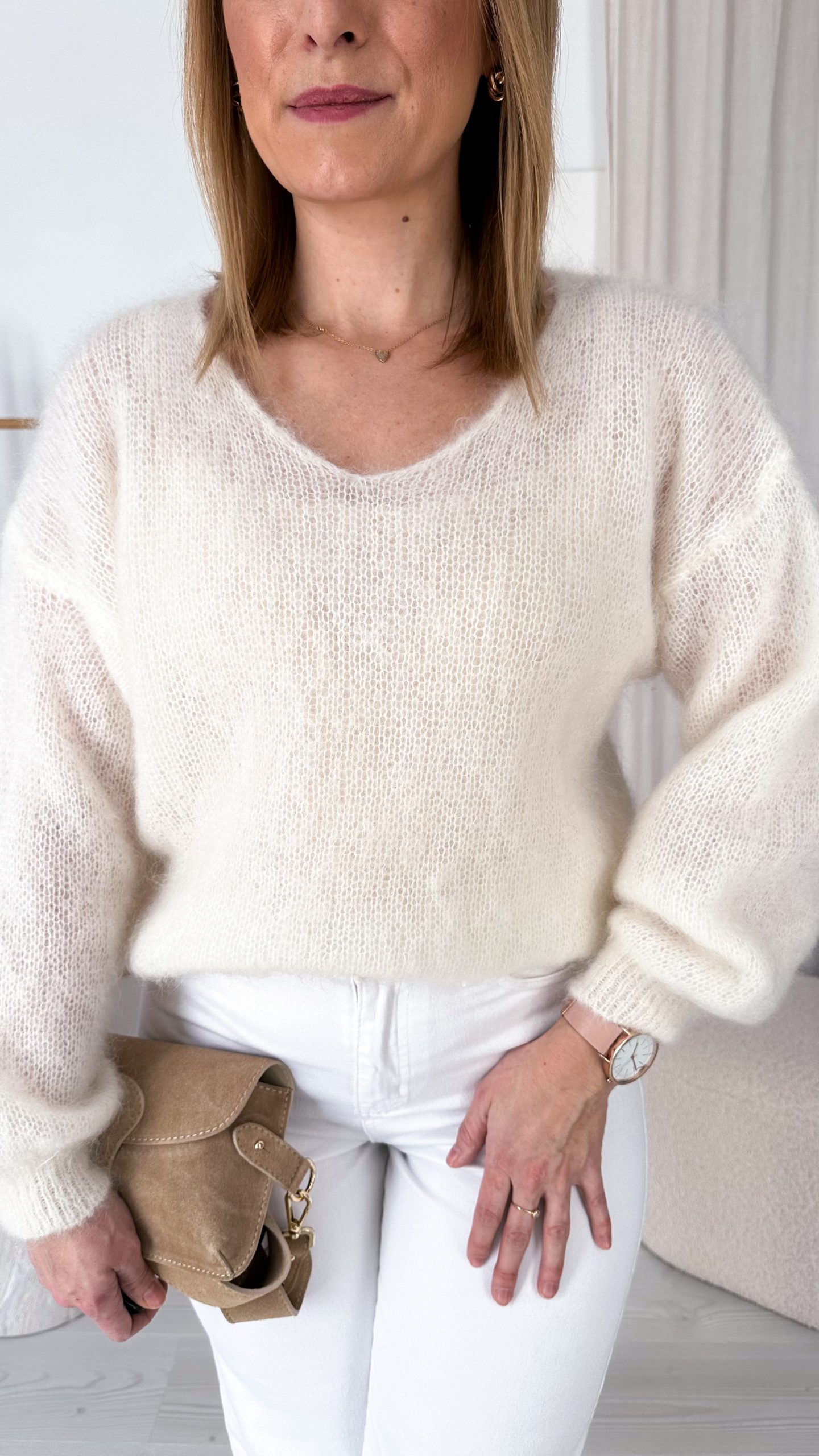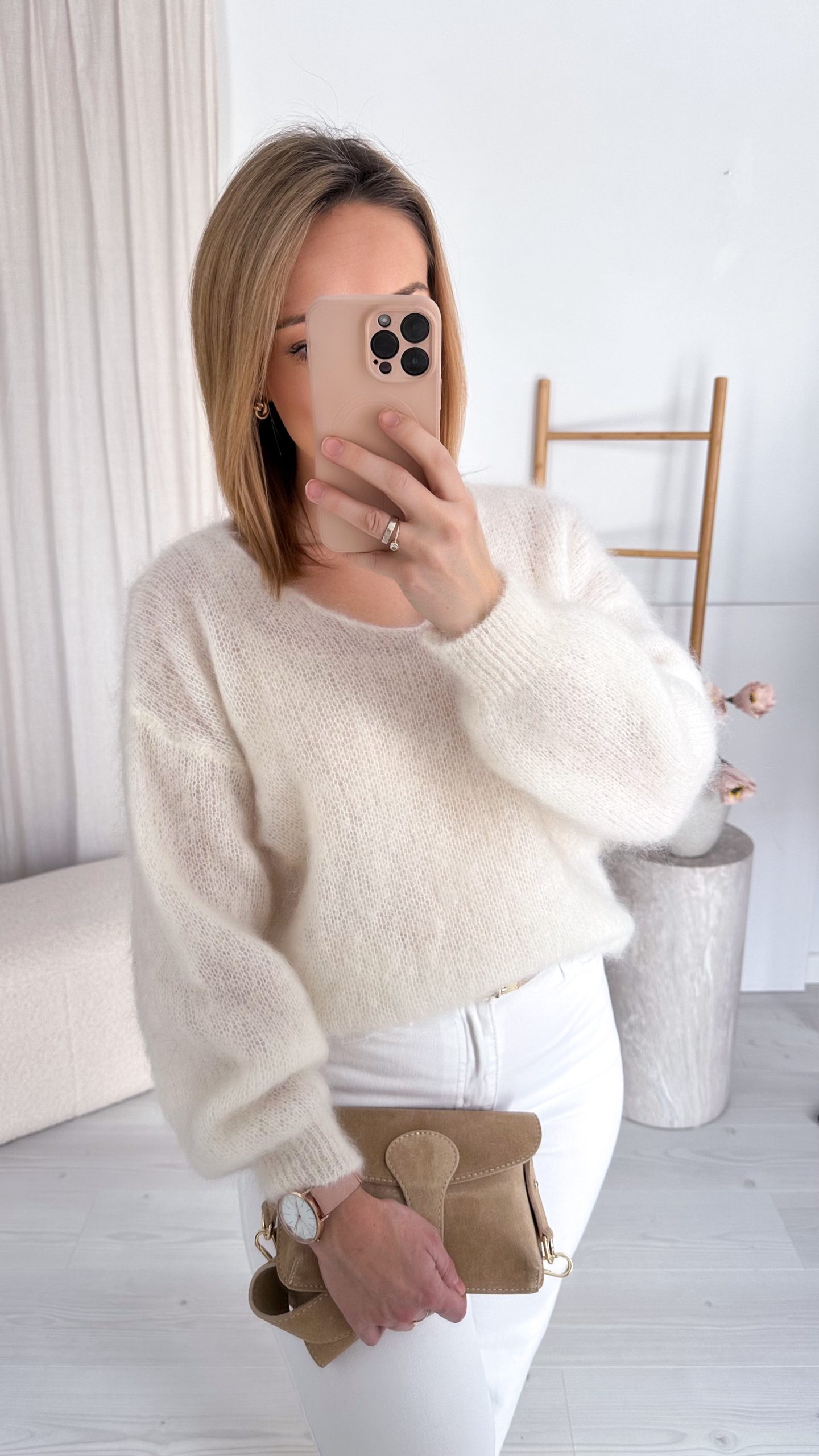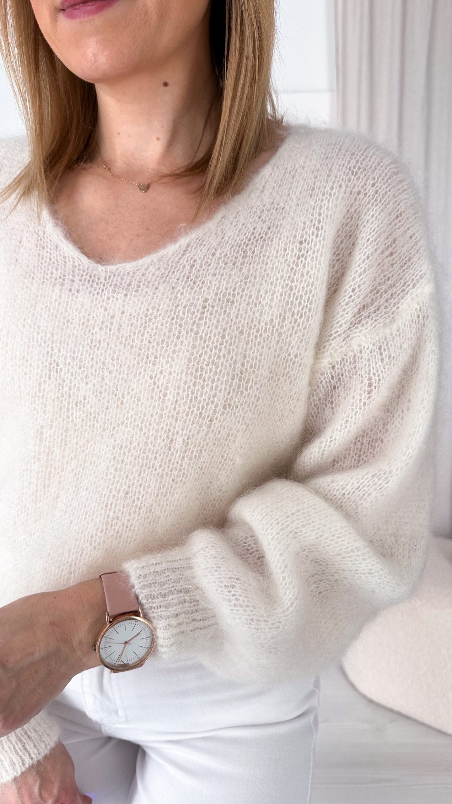 Ten wyjątkowy sweter to kwintesencja lekkości, kobiecości i luksusowego komfortu. Wykonany z miękkiej, puszystej przędzy z dodatkiem szlachetnego kid moheru, zachwyca swoją delikatnością i przyjemnym otuleniem skóry.
