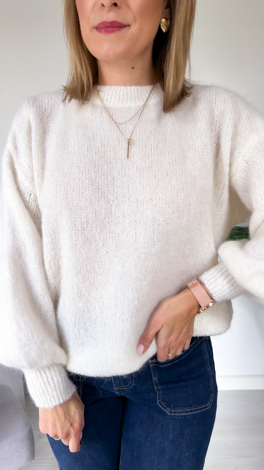 Ten klasyczny sweter z 40% moheru w składzie to esencja ciepła, komfortu i stylu. Miękki, puszysty i lekki – otula niczym chmurka, zapewniając przyjemne ciepło w chłodniejsze dni. Naturalne włókna moheru nadają mu subtelny połysk i delikatną fakturę, która pięknie prezentuje się w każdej stylizacji.