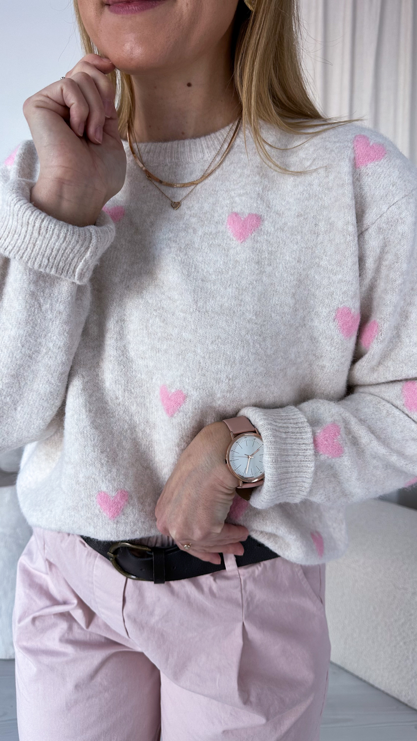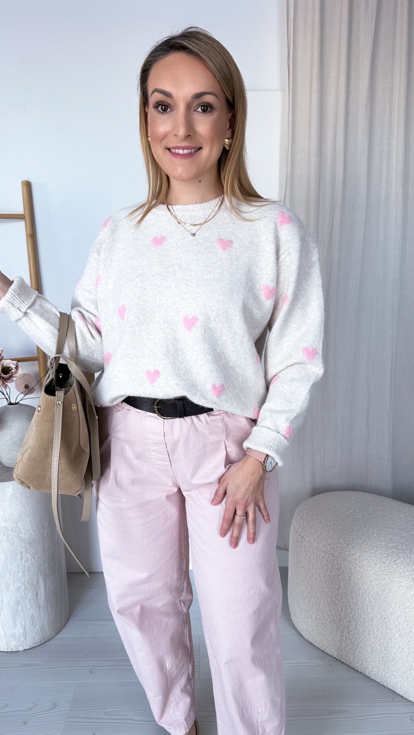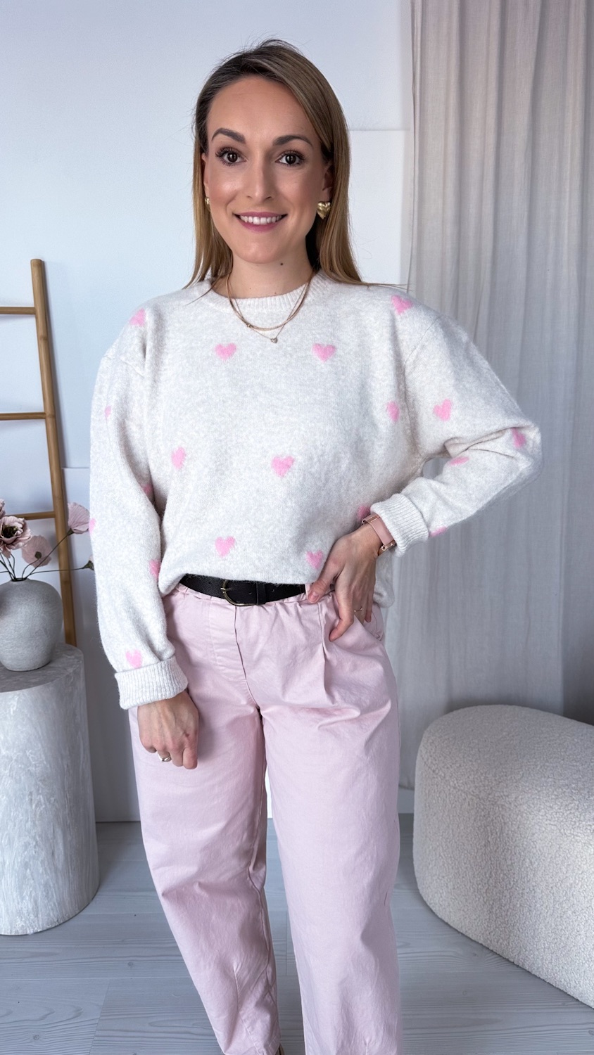Prosty fason sprawia, że sweterek łatwo zestawić z jeansami, spódnicą czy spodniami w neutralnych odcieniach, a subtelne serduszka nadają całości lekkości i wyjątkowego uroku. To idealna propozycja na codzienne stylizacje pełne ciepła i kobiecego wdzięku.