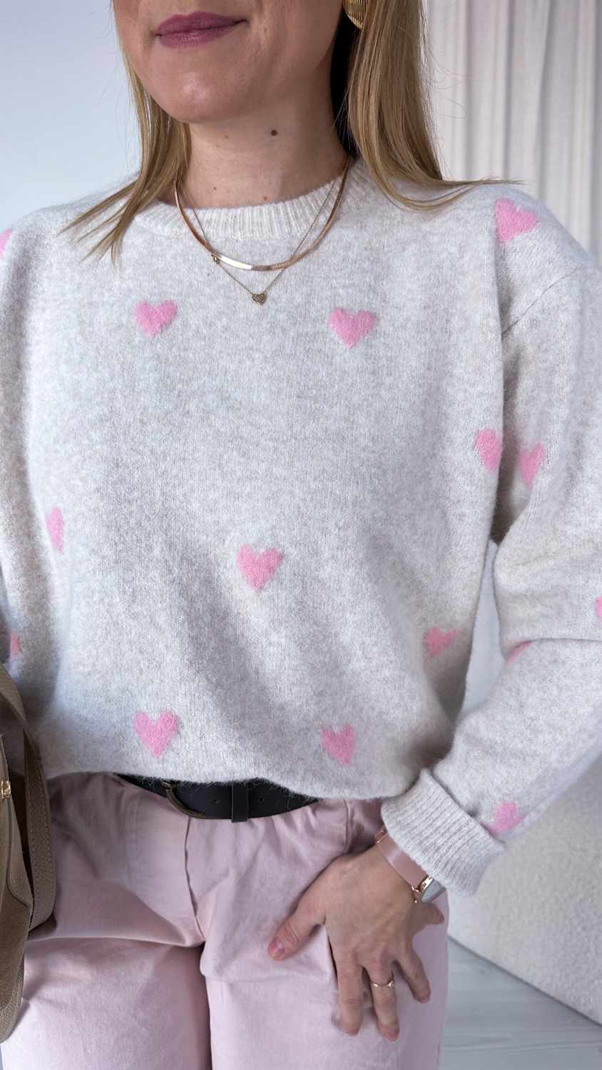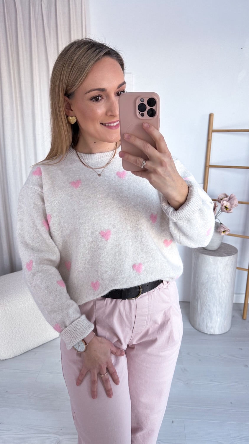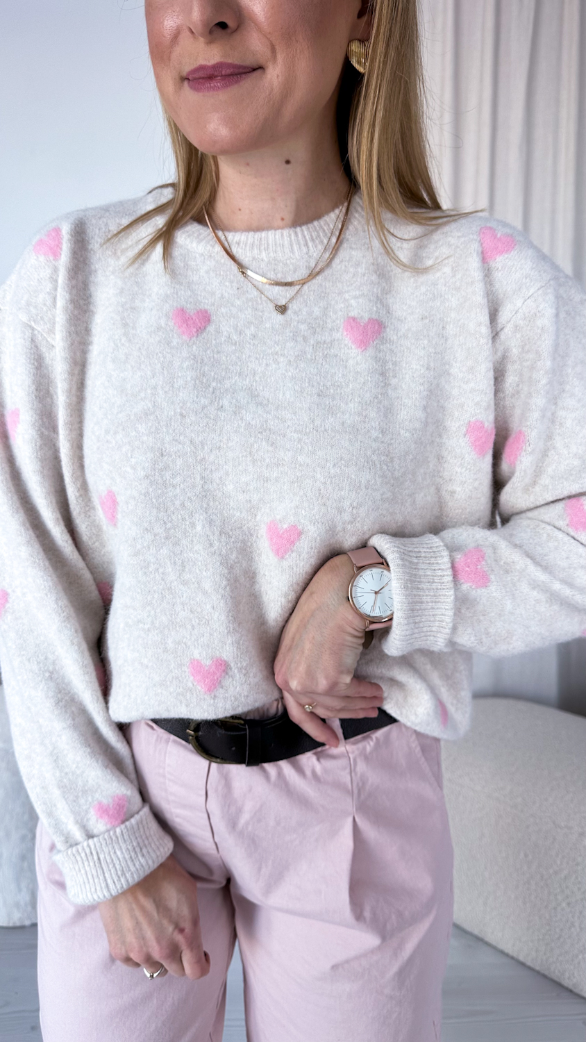 Prosty fason sprawia, że sweterek łatwo zestawić z jeansami, spódnicą czy spodniami w neutralnych odcieniach, a subtelne serduszka nadają całości lekkości i wyjątkowego uroku. To idealna propozycja na codzienne stylizacje pełne ciepła i kobiecego wdzięku.