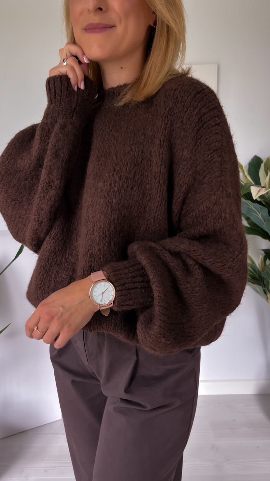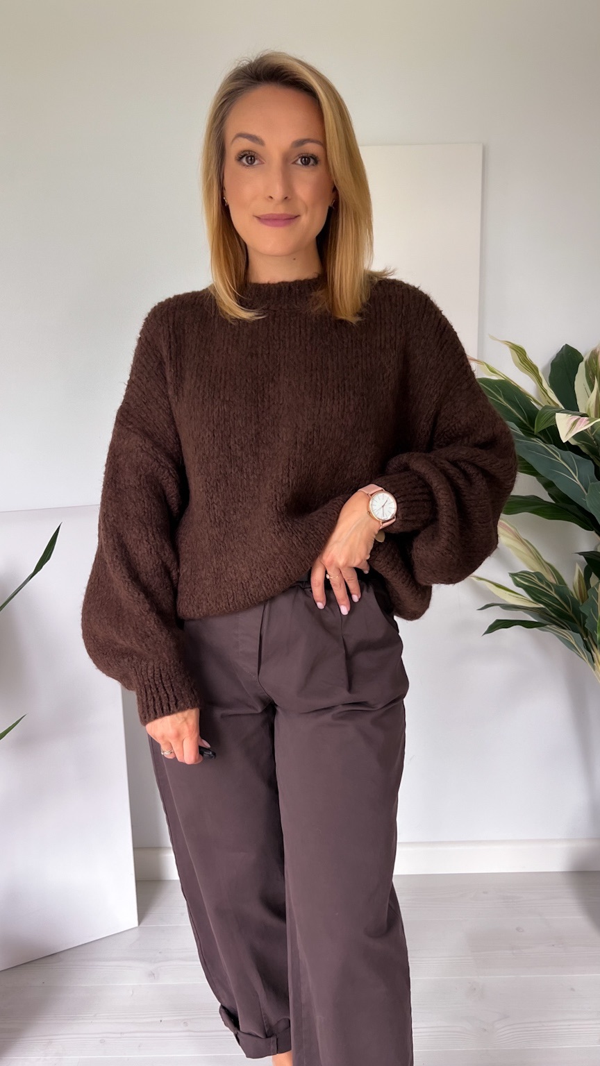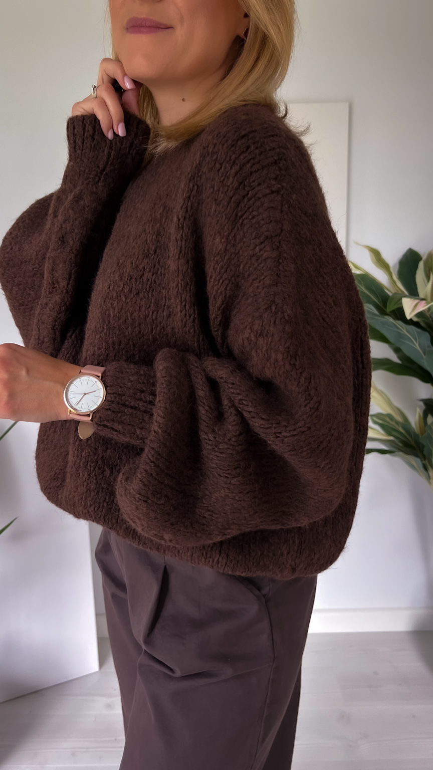 Ten niezwykle efektowny model to połączenie wygody i stylu, które przyciąga uwagę od pierwszego wejrzenia. Wykonany z mięsistej, przyjemnej w dotyku dzianiny, zapewnia komfort noszenia i doskonale otula w chłodniejsze dni. Szerokie rękawy zakończone elastycznym ściągaczem nadają całości modnego, nowoczesnego charakteru, a jednocześnie podkreślają lekkość fasonu.